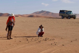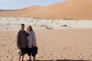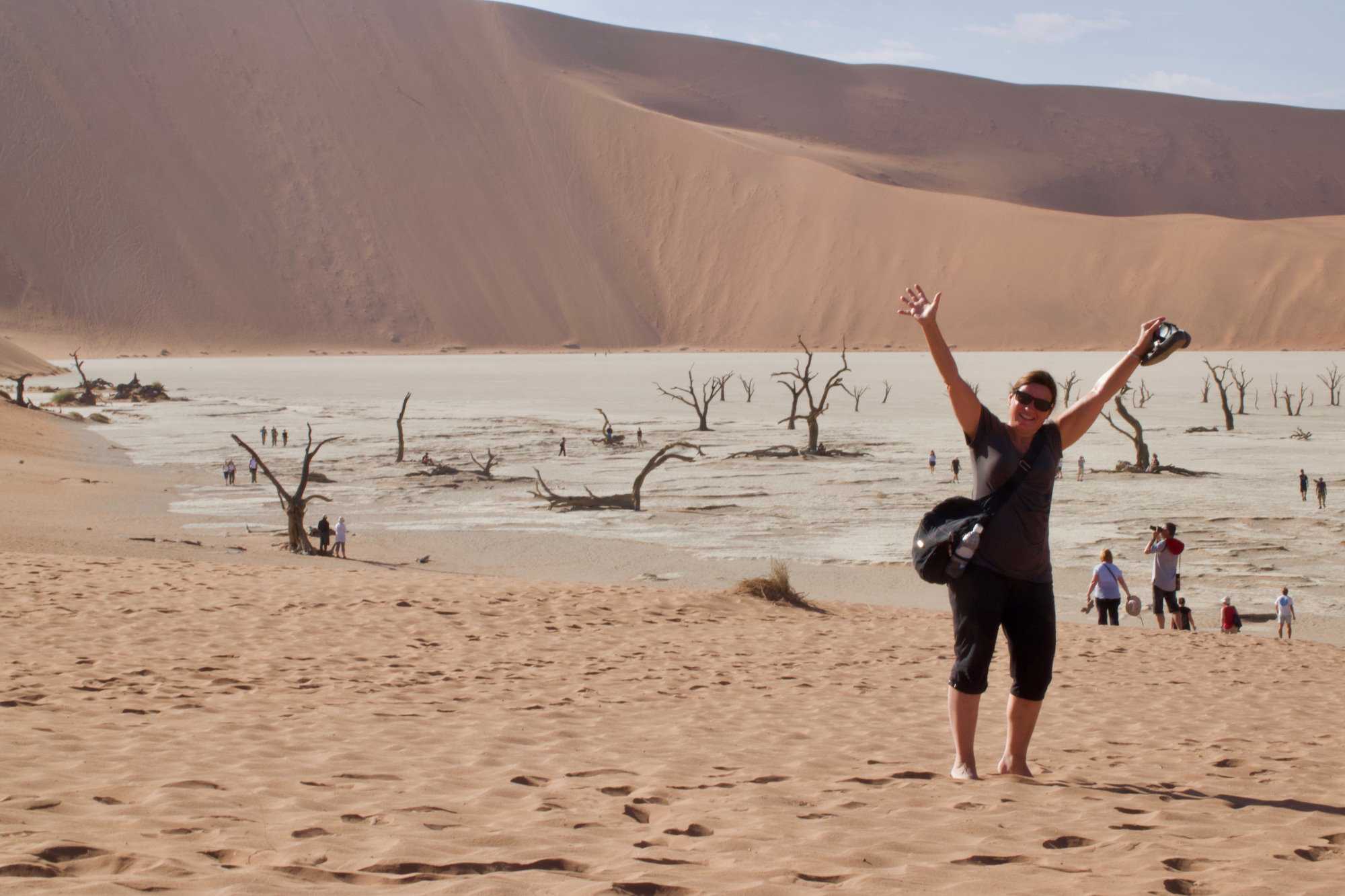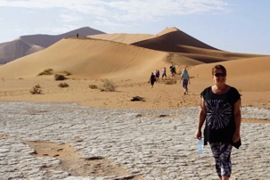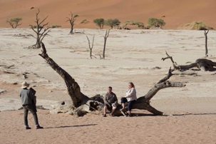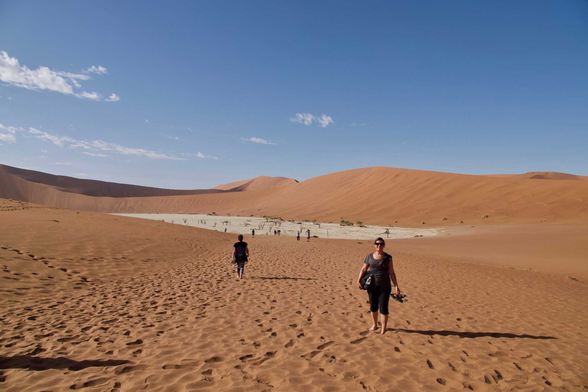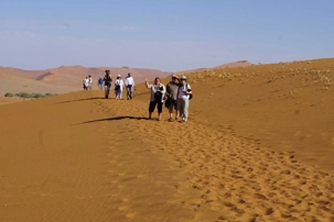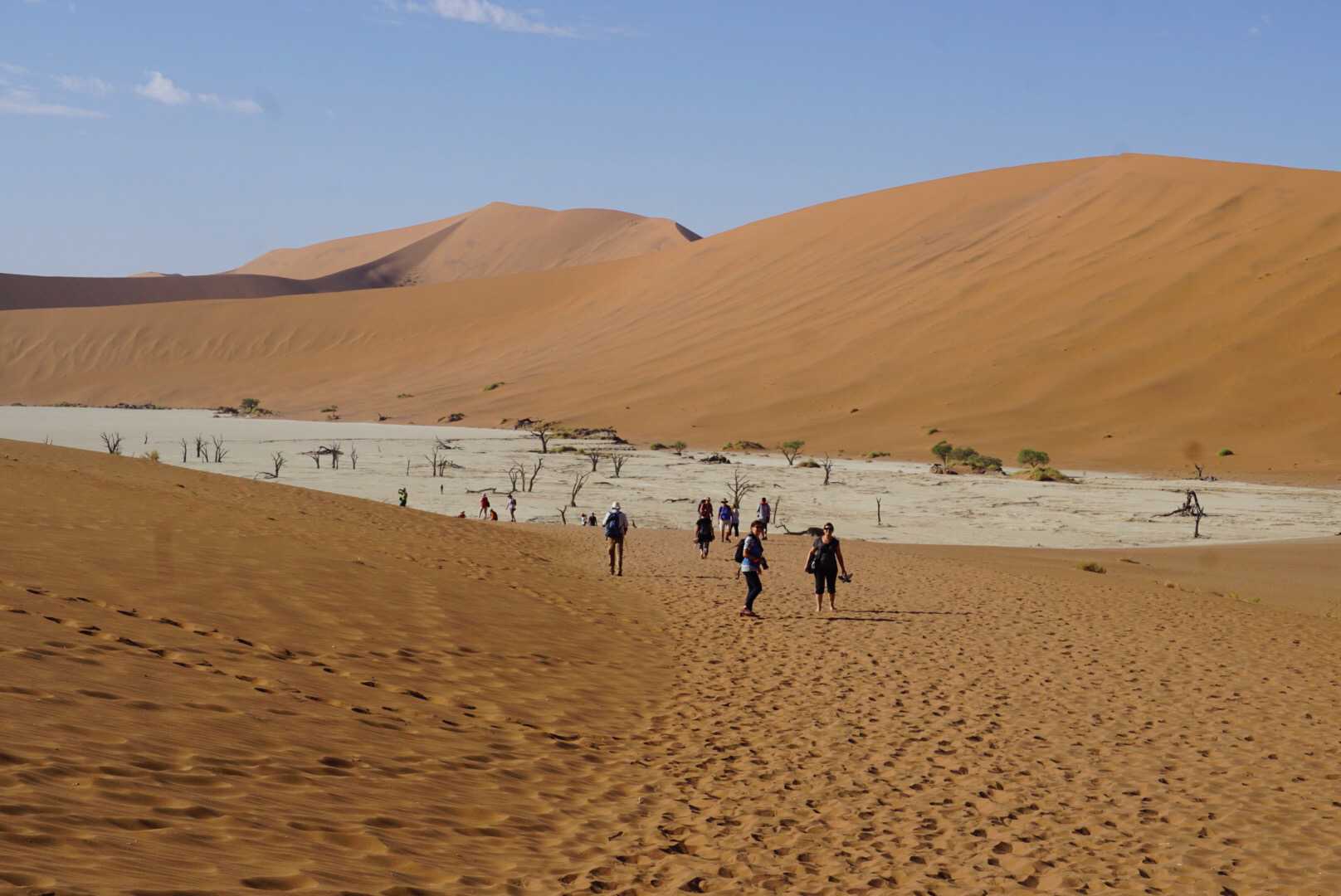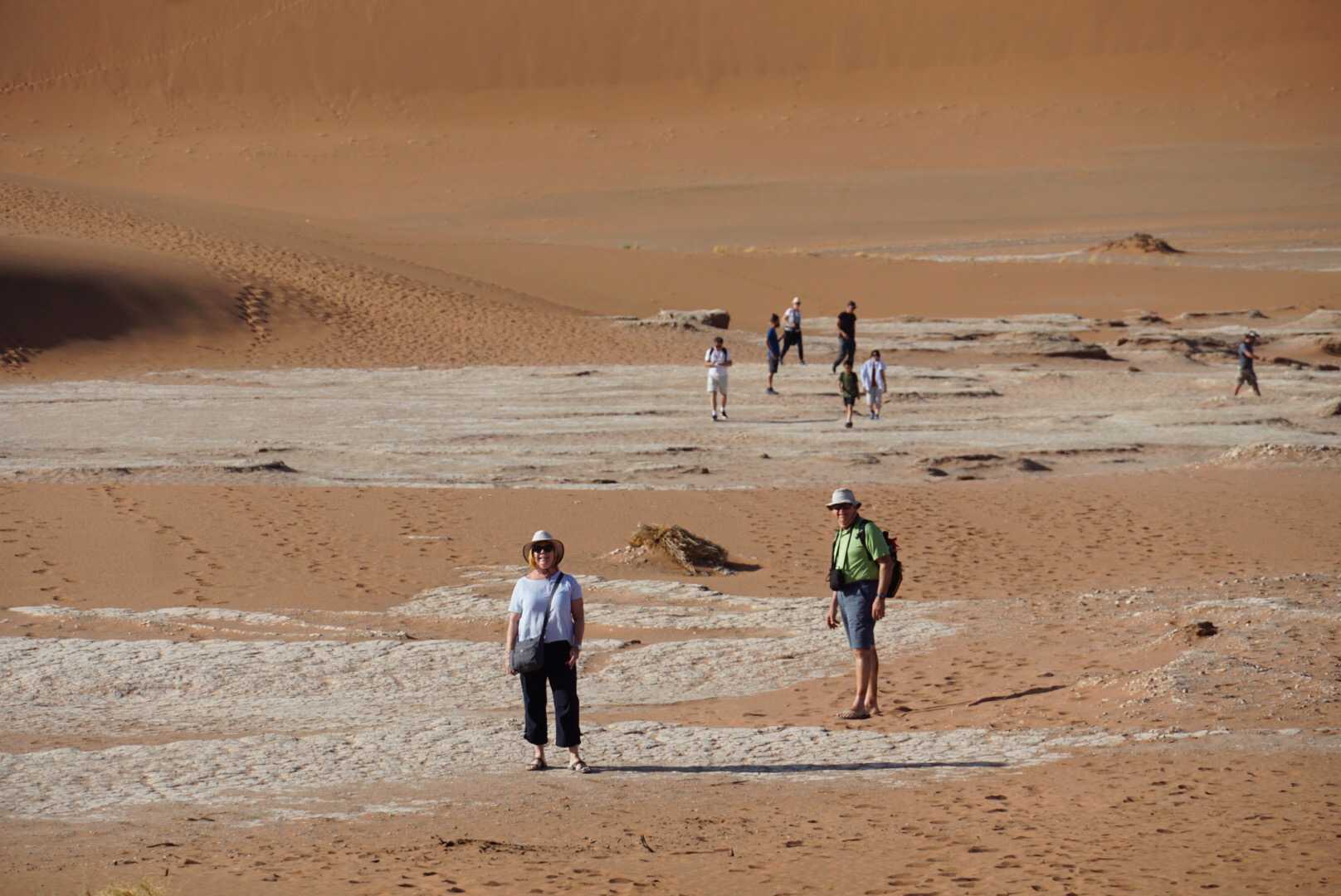 Le Namib est aussi le royaume de l'oryx, une antilope qui a su s'adapter aux dures conditions climatiques du désert. Cet arrêt nous permettait de marcher sur la crête de la dune afin de découvrir également « Dead Vlei », un lac asséché au milieu des dunes. Spectacle magique, où seuls quelques arbres morts subsistent encore... Nos deux braves, Marie Josée et Daniel, qui ont monté tout en haut, ont eu la vue du sommet de la dune tandis que nous avons pris la voie plus directe tout en bas. Cela valait le coup de monter mais ce n’était pas pour tout le monde. Le chemin tout en bas nous amenait lui aussi au lac que nous voulions découvrir. Quel paysage nous attendait! Cela valait le coup! Il commençait déjà à faire chaud, c’est la raison pour laquelle nous nous sommes levés plus tôt, éviter la chaleur qui prend de la force déjà vers 11h du matin.