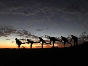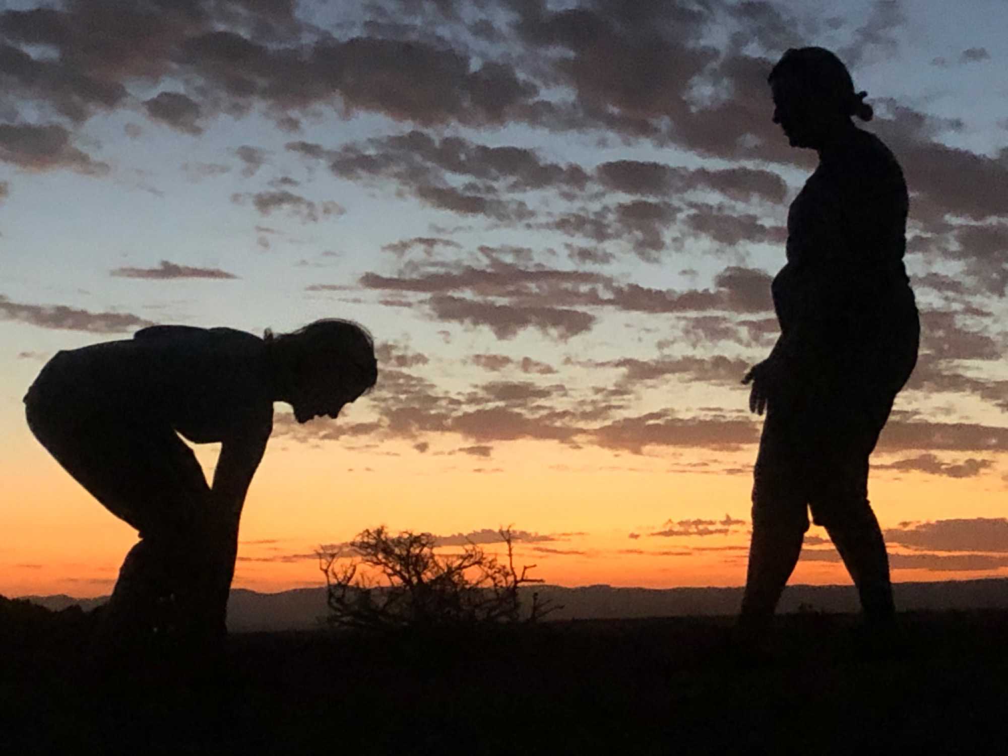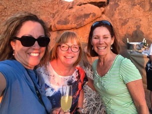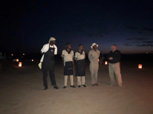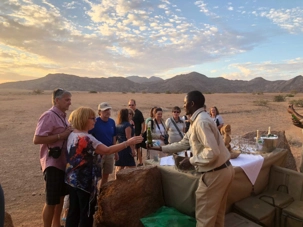 Déjà venu le temps pour notre balade dans le désert afin de voir la lumière changée sur les dunes et montagnes. On appelle cela un Sundowner drive & bush. La température est parfaite en ce début de soirée. Nous nous arrêtons pour des photos et nos deux chauffeurs nous demandent de les attendre et se dirigent de l’autre côté de la colline. Ils reviennent et nous demandent de les suivre. De l’autre côté nous attendait un bar du désert, monté juste pour nous, avec champagne et toutes les boissons désirées. Quel moment magique que Loulou et Sophie ont immortalisé en faisant plein de belles photos au coucher du soleil. Vous allez bien aimer ces photos. Superbes moments de partage en regardant le soleil se coucher et les couleurs apparaîtrent dans le ciel de la Namibie.