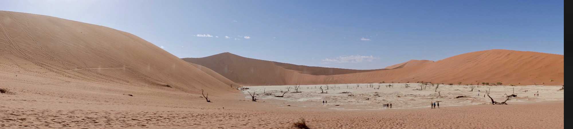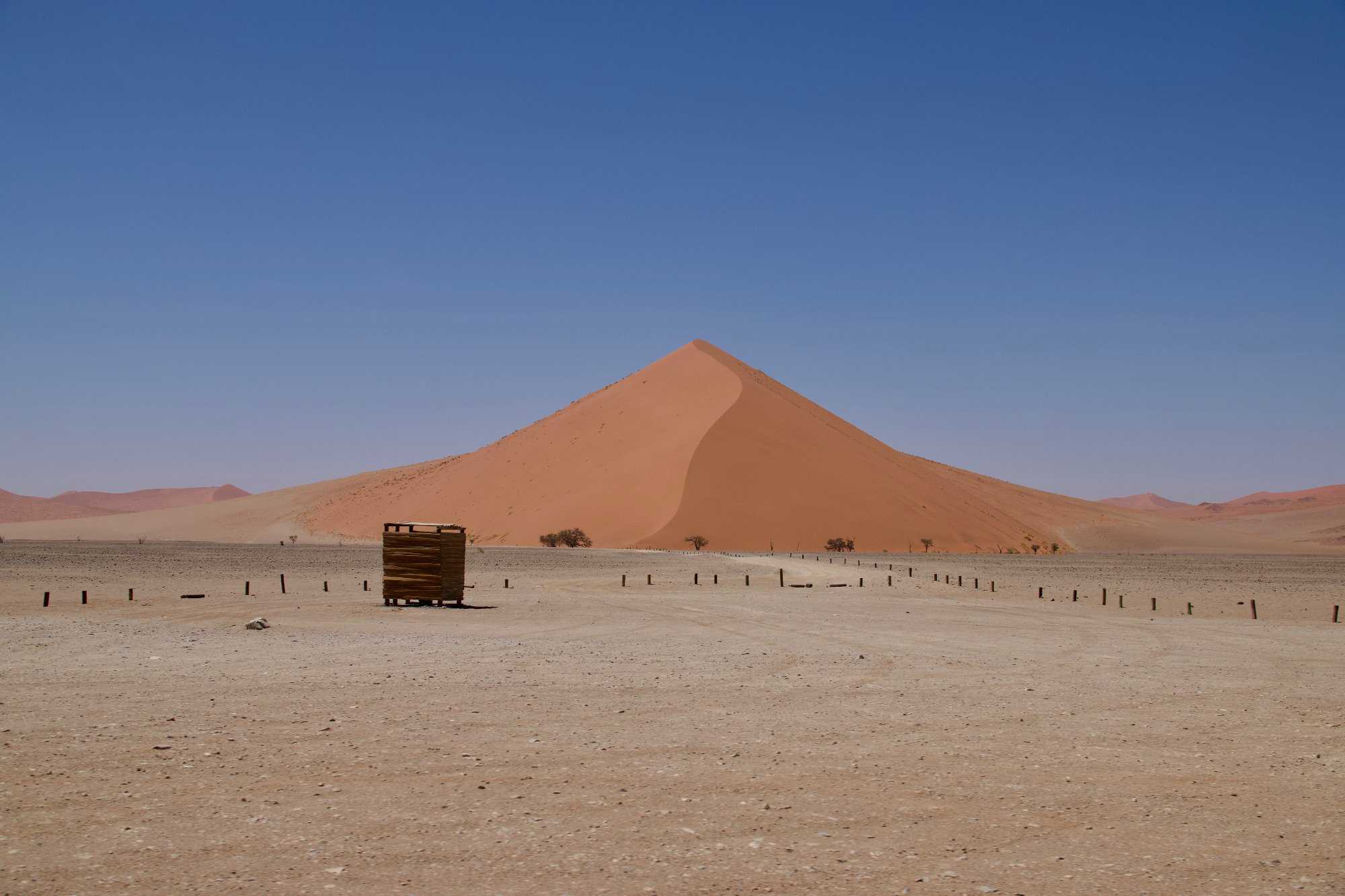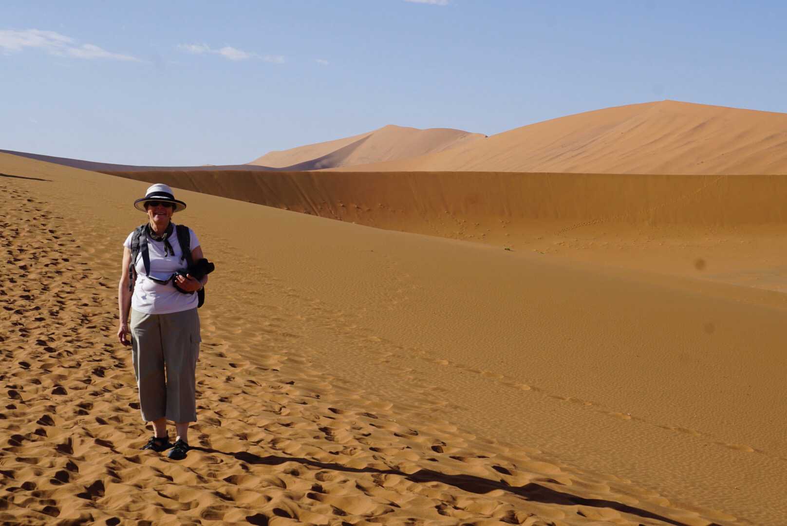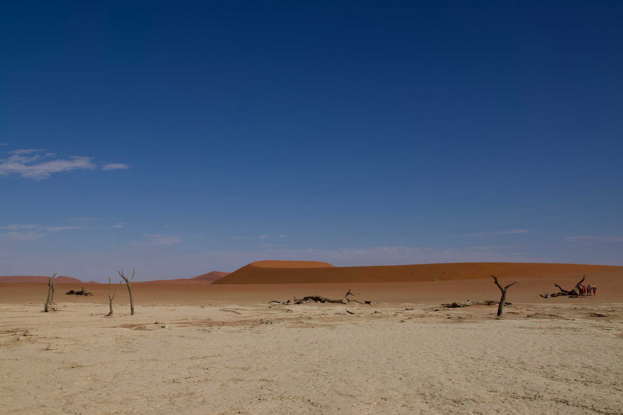 Voici un peu plus d’information sur Sossusvlei : il est un désert de sel et d'argile dans le désert du Namib, se trouvant dans le parc de Namib Naukluft en Namibie. Alimenté par la rivière Tsauchab, l'endroit est connu pour ses hautes dunes de sable rouge entourant l'endroit, formant une mer de sable (dunes de Sossusvlei). La faible végétation comprend notamment l'Acacia erioloba, n'est que peu arrosée par la rivière Tsauchab, dont l'eau se perd rapidement dans l'argile asséchée. Sossusvlei est le site touristique le plus visité de Namibie. Sossuvlei se trouve à côté du canyon de Sesriem, à l’intérieur du parc de Namib Naukluft. Les dunes s’élèvent à plus de 375 mètres au-dessus de la rivière Sesriem qui coule d’est en ouest pour mourir dans le désert à quelques kilomètres de l’océan Atlantique. Elles figurent parmi les plus hautes dunes du monde. Ces dunes se trouvent au-dessus d’un ancien désert pétrifié qui forme un soubassement de grès. Les dunes de Sossusvlei se sont formées par l’accumulation de grains de sable transportés par les vents d’est sur des distances assez considérables, parfois depuis l’intérieur du Kalahari. Ces sables proviennent de l’érosion de grès anciens. La présence de dunes étoilées est due à l’action de vents soufflant à partir de différentes directions. La couleur rouge des sables est due à la présence de trioxyde de fer.
