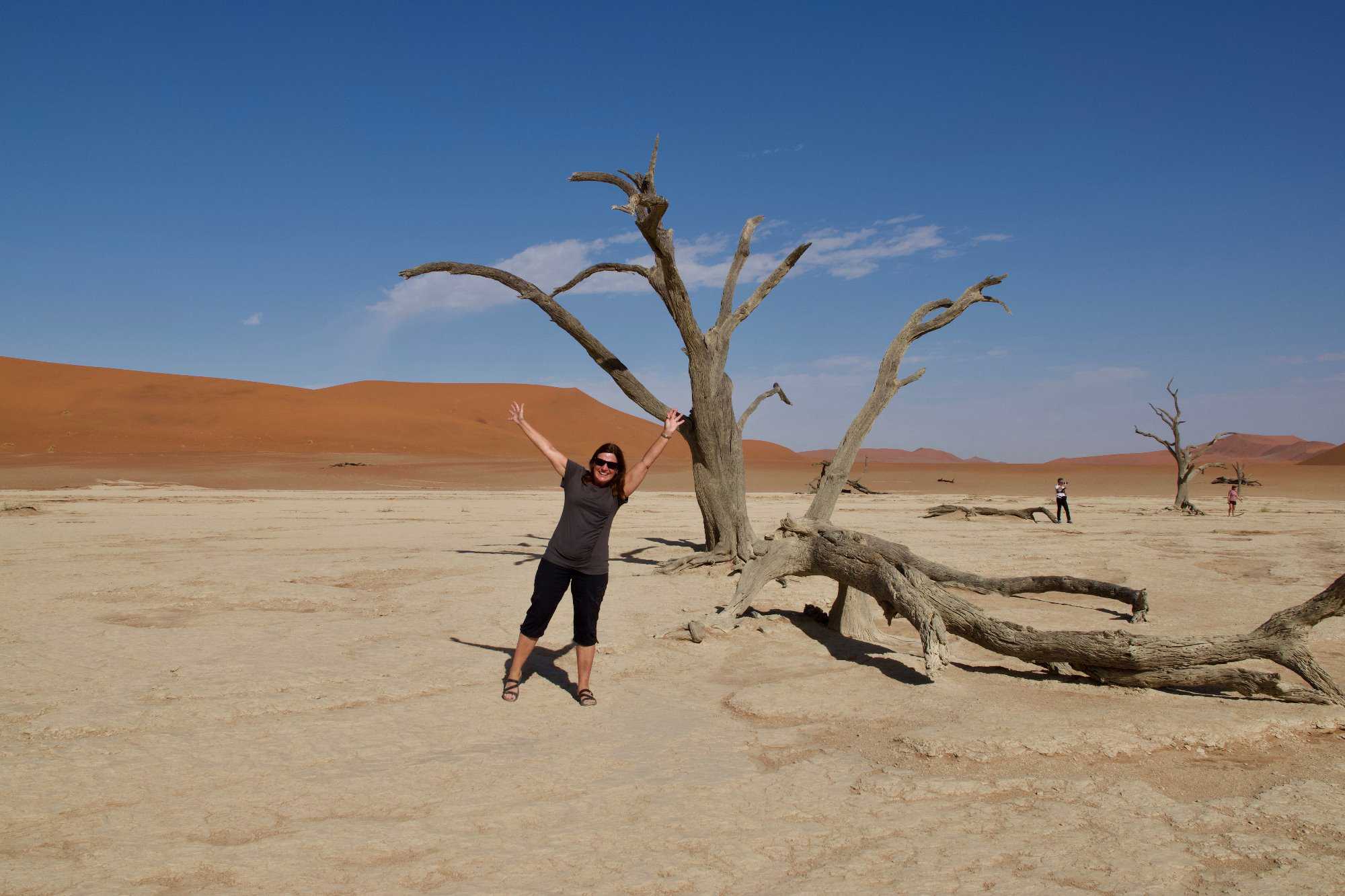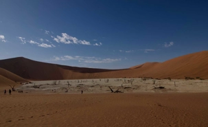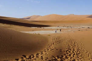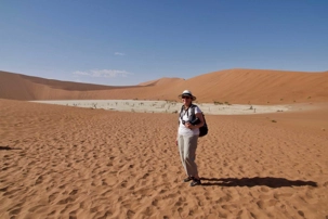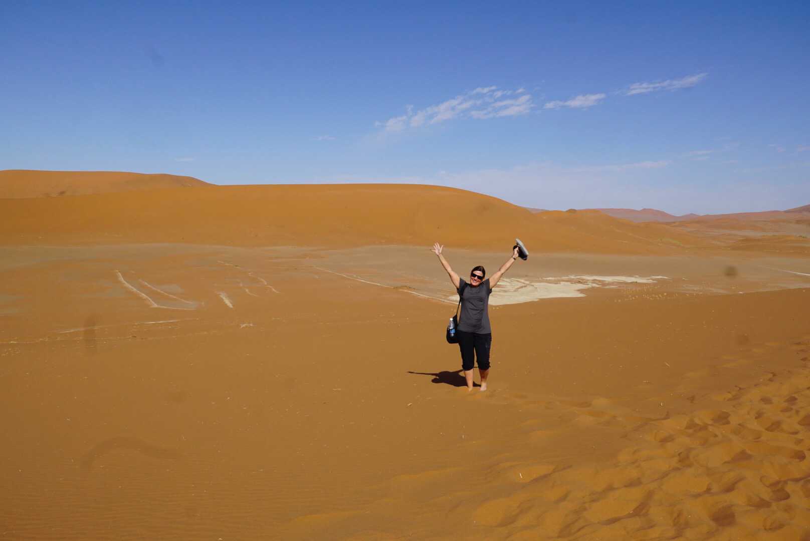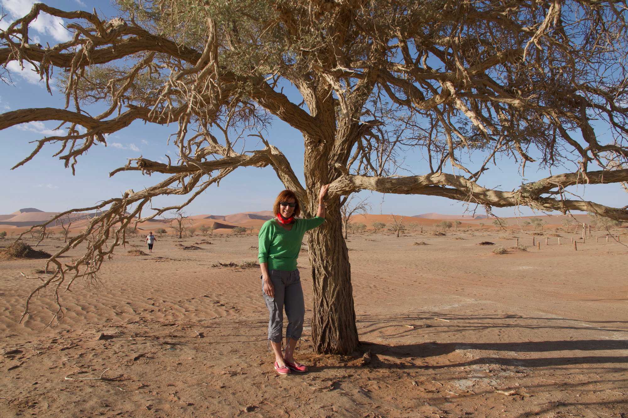 Voici un peu plus d’information sur Sossusvlei : il est un désert de sel et d'argile dans le désert du Namib, se trouvant dans le parc de Namib Naukluft en Namibie. Alimenté par la rivière Tsauchab, l'endroit est connu pour ses hautes dunes de sable rouge entourant l'endroit, formant une mer de sable (dunes de Sossusvlei). La faible végétation comprend notamment l'Acacia erioloba, n'est que peu arrosée par la rivière Tsauchab, dont l'eau se perd rapidement dans l'argile asséchée. Sossusvlei est le site touristique le plus visité de Namibie. Sossuvlei se trouve à côté du canyon de Sesriem, à l’intérieur du parc de Namib Naukluft. Les dunes s’élèvent à plus de 375 mètres au-dessus de la rivière Sesriem qui coule d’est en ouest pour mourir dans le désert à quelques kilomètres de l’océan Atlantique. Elles figurent parmi les plus hautes dunes du monde. Ces dunes se trouvent au-dessus d’un ancien désert pétrifié qui forme un soubassement de grès. Les dunes de Sossusvlei se sont formées par l’accumulation de grains de sable transportés par les vents d’est sur des distances assez considérables, parfois depuis l’intérieur du Kalahari. Ces sables proviennent de l’érosion de grès anciens. La présence de dunes étoilées est due à l’action de vents soufflant à partir de différentes directions. La couleur rouge des sables est due à la présence de trioxyde de fer.