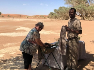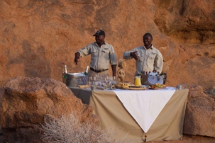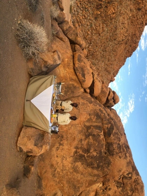 Les photos sont sublimes et c’est souvent une prise de vue que le pays utilise pour promouvoir ses beaux paysages. Comme c’est beau et si désertique, je suis sous le charme. Mais le charme de ce matin ne s’arrête pas là. Nous reprenons nos jeeps pensant aller prendre un petit café et une biscotte dans la nature comme lors de nos safaris. Mais non pas ici, j’avais choisi de leur faire vivre la totale: être attendus à l’ombre de magnifiques arbres, avec un arrangement pour le petit déjeuner, digne des revues de rêve. Tables rondes, chaises de banquet de couleur orange et un buffet pour au moins 60 personnes mais juste pour mon groupe de 18 personnes. Nous avons été accueillis par une équipe dédiée à nous faire vivre ce petit déjeuner de rêve d’une façon royale. Regardez les photos et vous allez comprendre. Le chef nous cuisinait nos œufs comme nous le désirions et tout était là pour nous. C’était un très gros WOW!!!! Juste la petite table avec de l’eau et savon pour nous laver les mains et les serviettes froides c’était parfait. Le café était succulent tout comme tout le reste. Après s’être rassasiés, nous avons quitté pour retourner au lodge et se reposer ou juste faire une petite baignade dans la piscine. La vie est belle! J’ai oublié, avant de revenir au lodge nous avons fait un bref arrêt au canyon de Sesriem, gorge de 50 m de profondeur, creusée par la rivière Tsauchab et résultant de millions d'années d'érosion. C’était très beau mais si chaud que nous ne nous y sommes pas trop attardés!