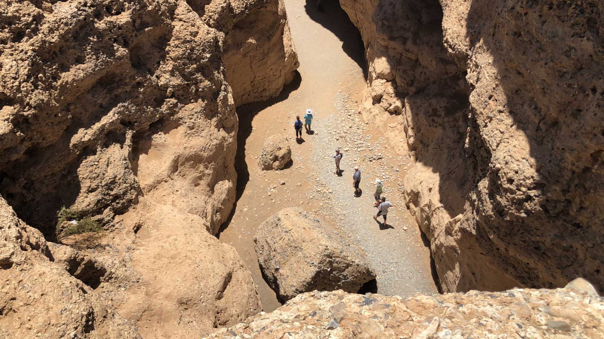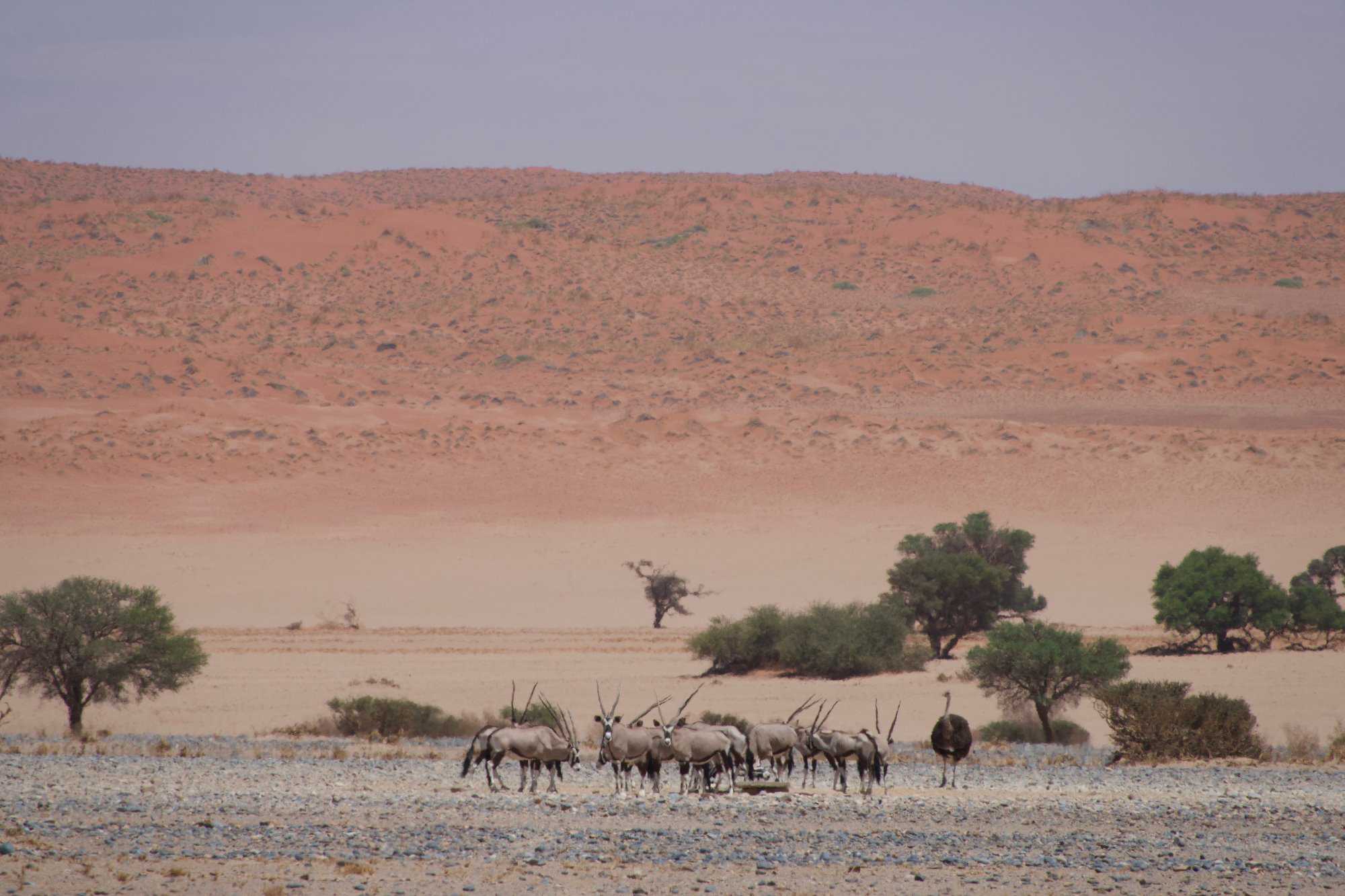 Nous sommes de passage à Sesriem, entrée du parc national du Namib-Naukluft, section Sud. À l'origine, le canyon de Sesriem, qui signifie en Afrikaans « six cordées » (en référence aux six cordes de cuir nécessaires pour remonter les seaux permettant aux pionniers européens de puiser de l'eau pour leur bétail), était un endroit vital pour les peuples Nama, Herero et Damara. En effet, la présence d'une source permanente a suscité́ au fil des siècles la convoitise de ces différents peuples. Aujourd'hui habitée principalement par des oiseaux, la source et le canyon sont un lieu d'excursion.