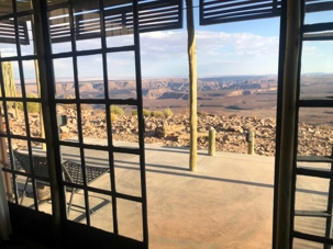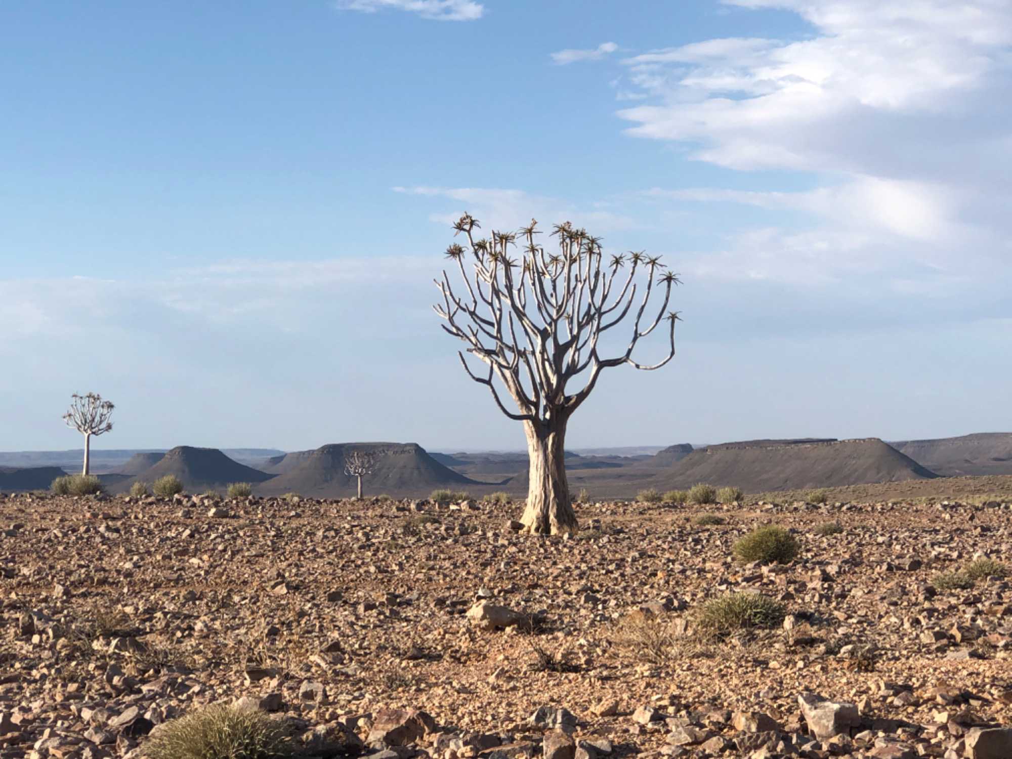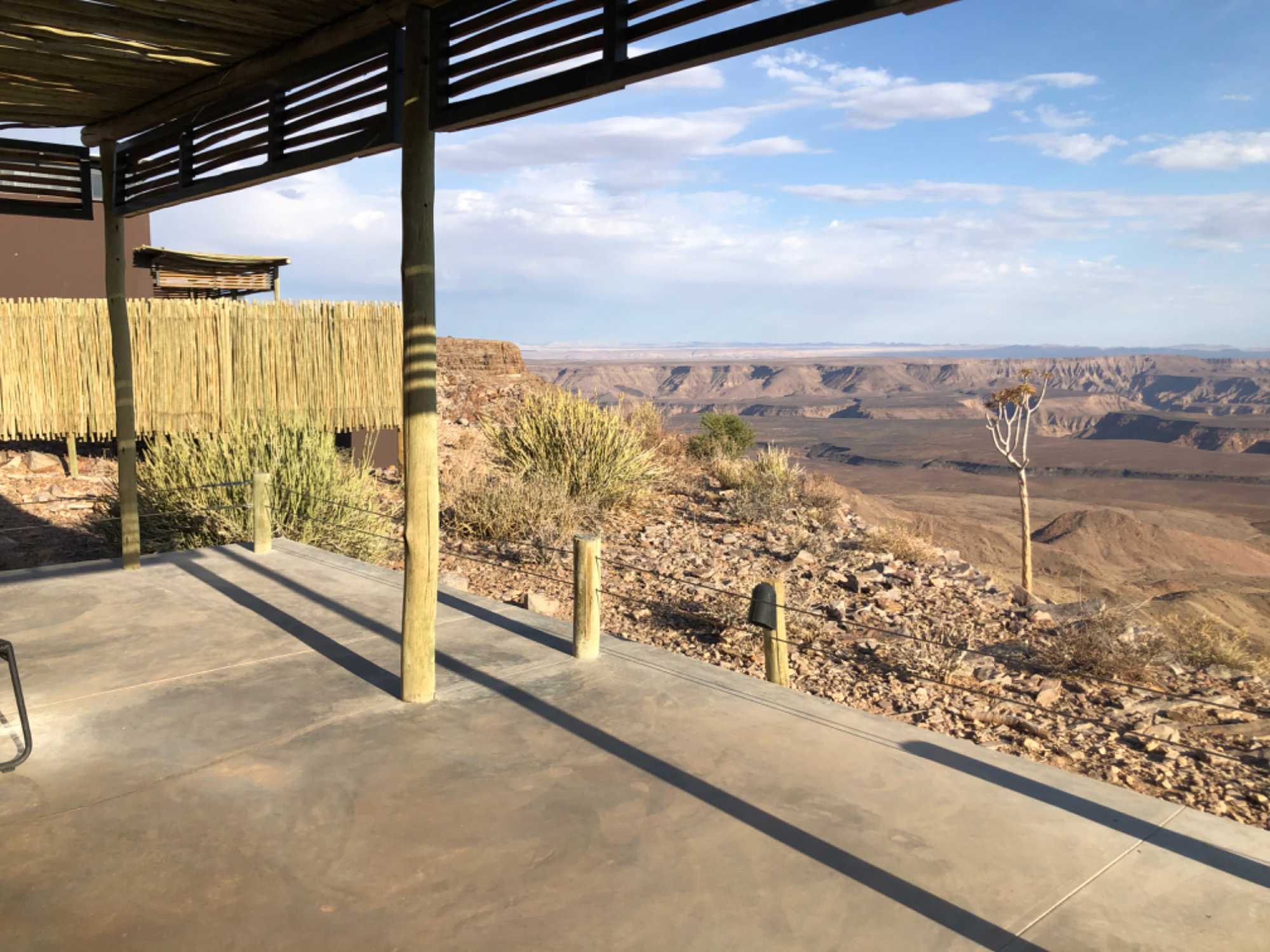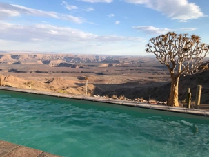 Nous avons continué jusqu’à Aus où nous avons mangé au Klein Aus Vista. Une superbe propriété perdue encore une fois au milieu de nulle part. Excellent buffet fait pour nous dans un cadre très agréable. Après le repas nous avions une bonne route à faire pour atteindre le Lodge de Fish River Canyon. La première partie sur une route asphaltée et ensuite de la piste. Vraiment on se demande souvent où l’on s’en va! On ne rencontre personne ou presque aucune voiture pendant des heures et pas âmes qui vivent comme on dit. Cette fois-ci c’était encore plus inquiétant...Oui, rien que le désert sur ce plateau avec seulement quelques arbustes et arbres. L’on aperçoit finalement l’indication de notre lodge et encore 27 kilomètres à faire. Où allons-nous??? Léonce nous dit de patienter et que nous serons récompensés. Il avait bien raison car nous apercevons au loin des petites maisonnettes semblant être suspendues dans le vide de l’horizon qui se dévoile. Nous sommes sous le choc quand on débarque dans le bâtiment principal qui nous montre des immenses canyons à perte de vue. Nous sommes sans mots et nous admirons la nature qui forme ce panorama unique. Le Fish River Canyon est le deuxième plus grand canyon au monde après le Grand Canyon d’Arizona. Nous sommes les privilégiés qui ont la chance de pouvoir dormir sur le bord du canyon.
