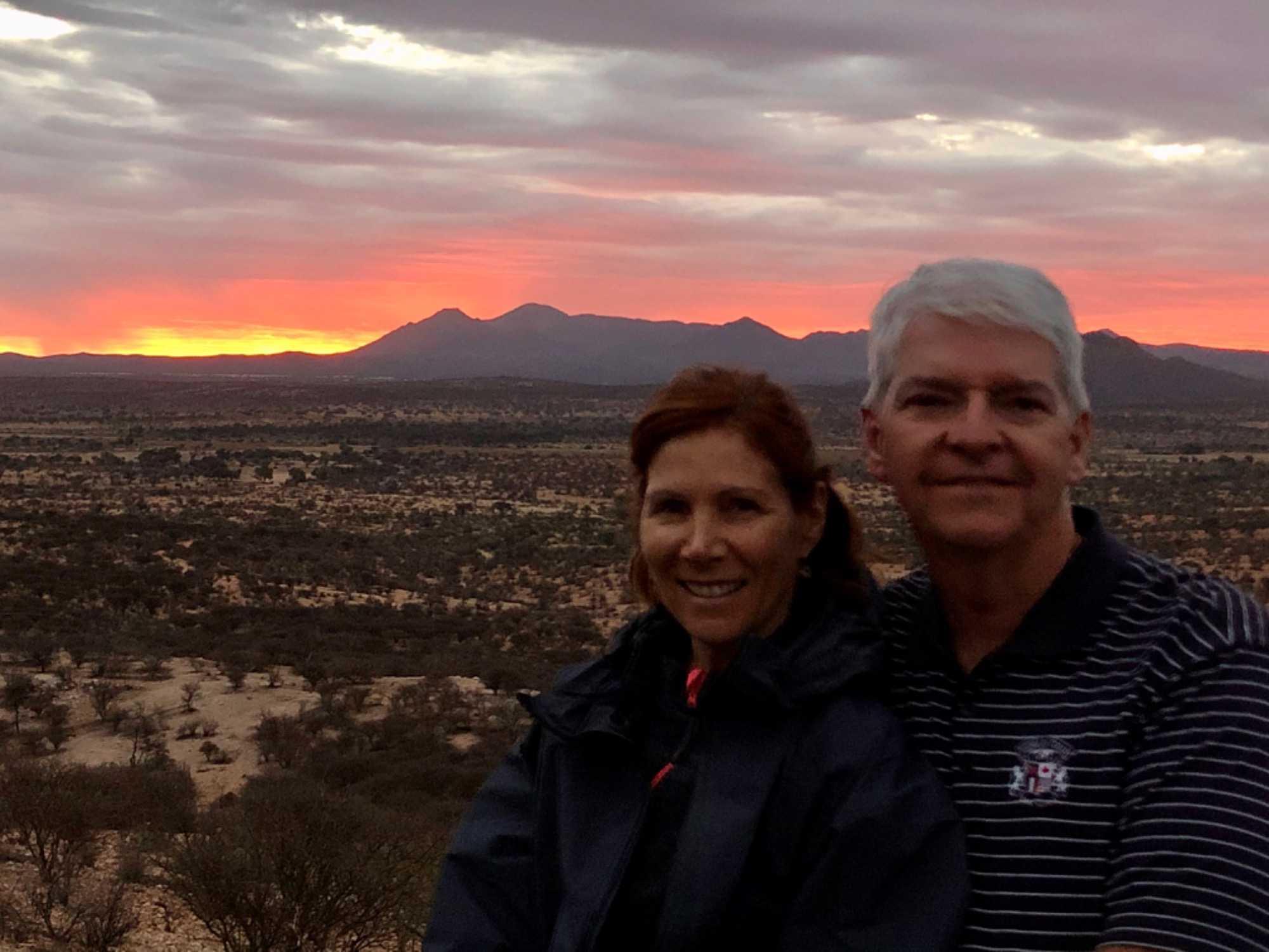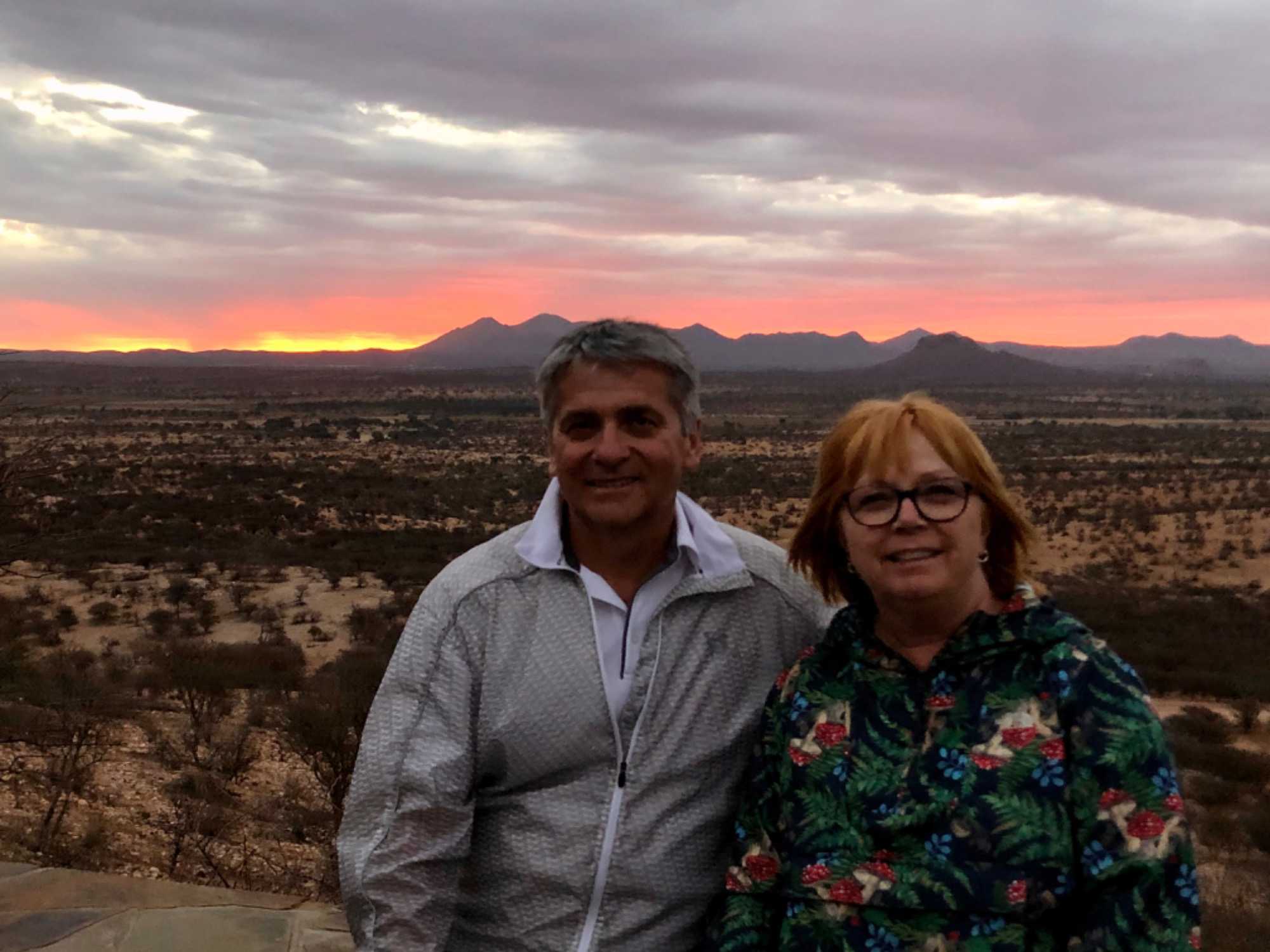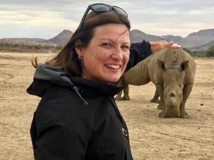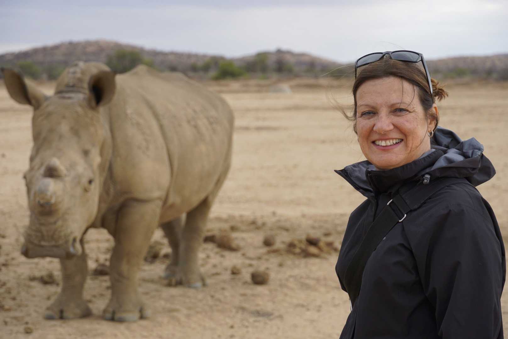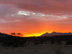 Notre arrivée à notre lodge que nous avions utilisé à notre arrivée en Namibie se fait plus facilement comme nous connaissons l’endroit. Le temps de nous installer dans nos beaux petits bungalows et nous voilà prêts pour faire notre dernier safari. Nous partons donc à la recherche des animaux du parc privé de Gocheganas qui sur 6000 hectares et plus de 25 espèces d’animaux. Ils possèdent plus de 300 girafes donc oui, nous avons eu la chance d’en voir beaucoup pour le plaisir d’Esther qui adore ces belles bêtes. Mais le clou de notre safari ce soir fût les rhinocéros. Nous avons été triste d’apprendre qu’il ne reste que 2 rhinocéros dans le parc sur les 6 rhinos qui habitaient l’endroit. Le braconnage est encore présent et la valeur des cornes de rhinocéros attire les braconniers. Tellement triste de savoir que l’on peut tuer ces animaux et leur enlever leur corne pour la revendre surtout en Asie. Une corne de rhinocéros peut valoir dépendamment de sa grosseur, 120 000$ sur le marché noir. Et l’achat pour une réserve d’un rhinocéros est d’environ $35 000. donc on peut s’imaginer ce qui attire les braconniers.