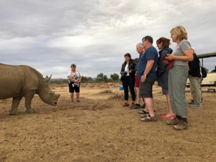 Revenons à notre safari et à notre arrivée pour notre apéro dans le bush. Nous arrivons et nos chauffeurs pisteurs nous permettent de descendre à proximité de leurs deux rhinocéros. Comme ils les nourrissent les rhinos sont habitués à l’homme et ils leur parlent tout le temps que nous sommes proches. Proches vous dites? Tellement proches que nous n’en revenons pas. Ils leur parlent et nous parlent en surveillant les mouvements des rhinocéros et les nôtres. Un grand moment que vous pourrez partager avec nous en regardant nos photos. C’était émouvant et unique de se retrouver si près de ces animaux. Nous revenons vers le lodge en admirant à nouveau, zèbres, gnous, girafes, et plein d’autres. Comme c’est beau! Un autre beau coucher de soleil nous attenait à notre retour et nous nous retrouvons pour le souper.