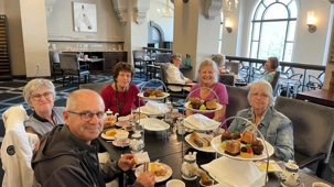 Direction le lac Louise. Son nom lui fut donné -non pas par Michel Louvain- mais bien en l’honneur de la princesse Louise, fille de la reine Victoria qui donna son nom au glacier qui le surplombe. Son eau, d’un bleu turquoise, nous charme au plus haut point. Puis nous prenons place au restaurant du château, le Fairview. L’hôtel a été nommé par la revue Gourmet, l’hôtel jouissant du meilleur paysage au monde. Nous sommes attendus pour prendre le thé et, selon René et Ginette, le repas qui nous est servi est de meilleure qualité et plus goûteux que celui qui leur a été servi à Londres! Les petits doigts se font aller. Nous sommes reconnaissants du repas qui nous est servi. Les petits gâteaux sont décadents, c’est bon vous n’avez pas idée. Après le repas, une balade le long du lac et nous reprenons place dans l’autobus en direction du lac Moraine.