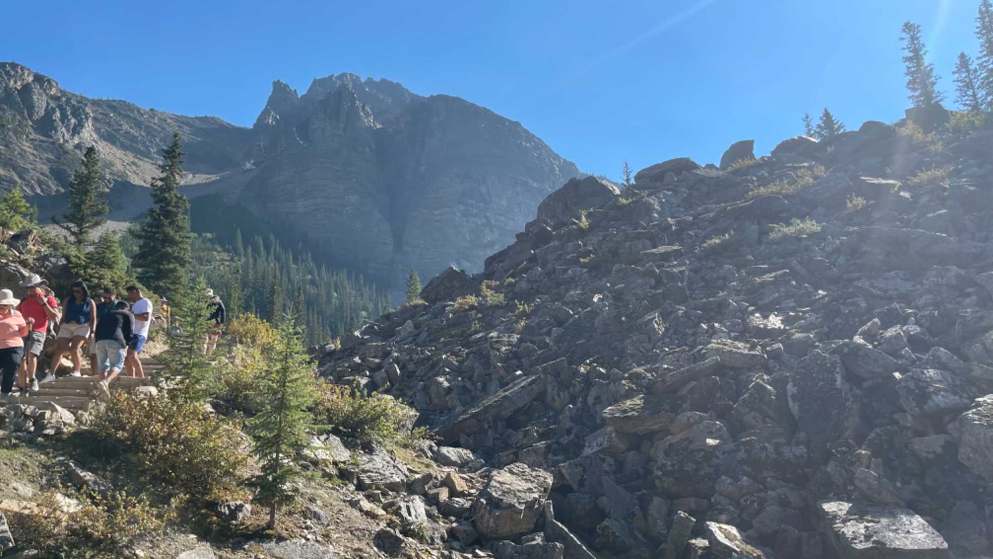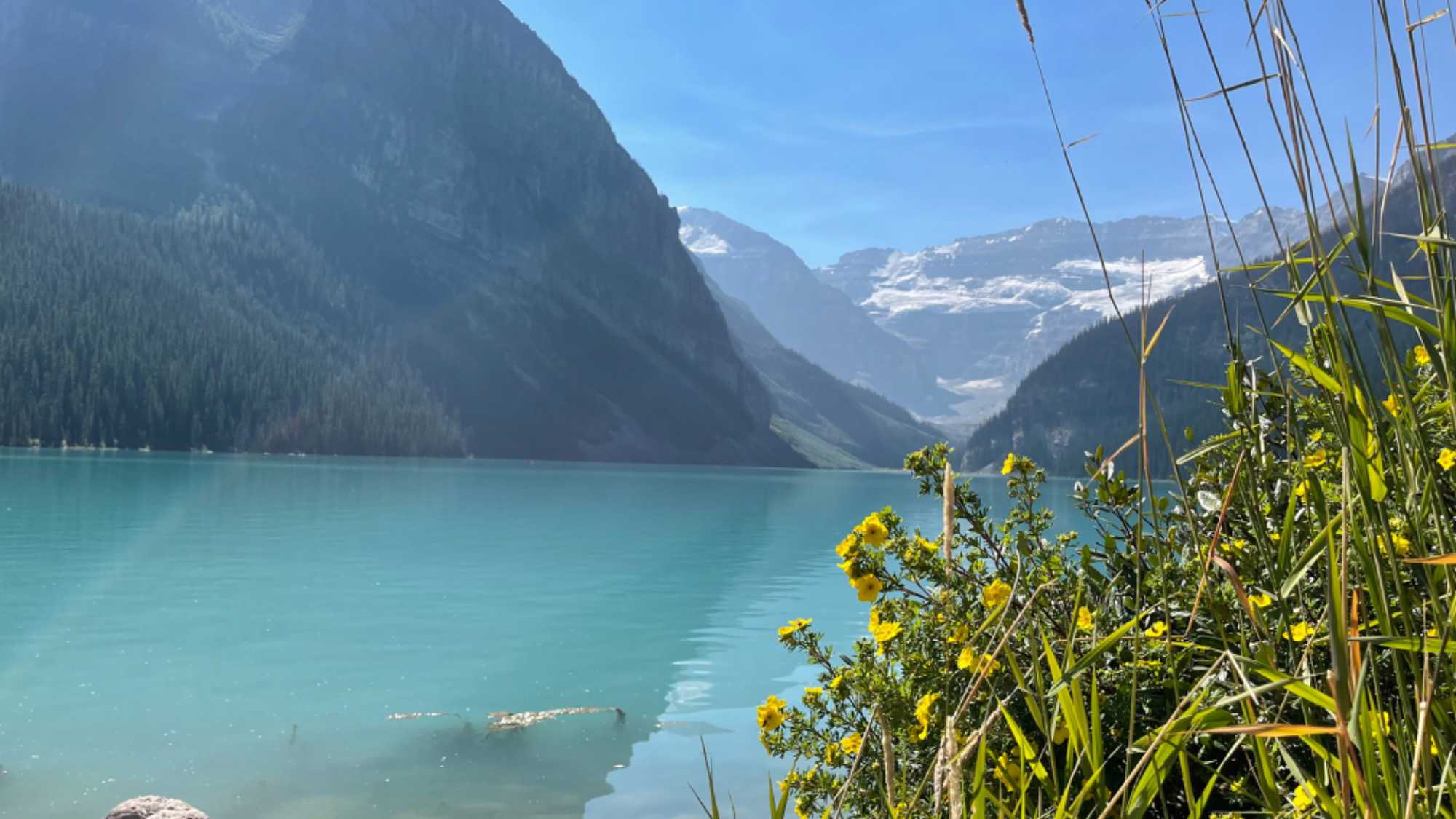 Ouf…c’est magnifique. Nous sommes dans la vallée des 10 Pics et pour s’y rendre, nous serpentons à travers la forêt, à une quinzaine de kilomètres du village du lac Louise, à une altitude de 6 183 pieds. Les vallées, les montagnes, les rares fleurs, les chutes, tout est captivant! Sa couleur, d’un bleu caractéristique, vient de la réfection de la lumière sur la poussière de roche en suspension dans l'eau. Nous sommes montés jusqu’en haut de la moraine afin d’observer le lac, la montée en valait la peine car ça monte! Ça nous a permis de digérer notre DÉLICIEUX repas 😉 on se sent moins coupable.