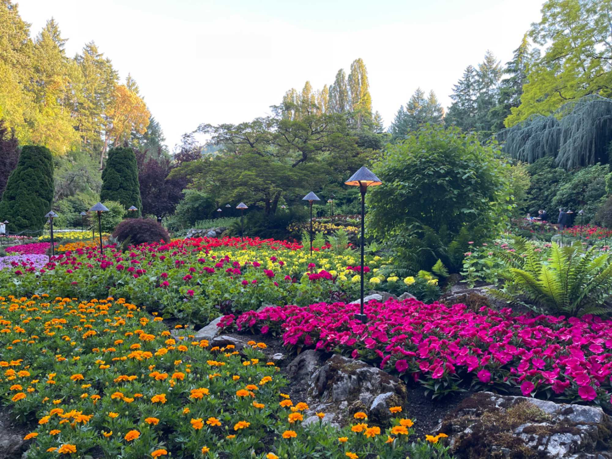 Départ vers 16 h pour les célèbres jardins Butchart. Tout a commencé avec la vision et la passion d’une femme…avec une ancienne carrière de calcaire comme arrière-cour. Jennie Butchart a imaginé aménager un jardin encaissé à sa place, transformant la propriété pour sa famille (et les visiteurs), pour les générations à venir. En 1904, le couple Ontarien déménage sur l’île de Vancouver pour y construire une cimenterie sur un riche gisement de calcaire. 1912, la production de ciment a épuisé les dépôts de calcaire. Jennie imagine un grand jardin à la place. Depuis, ils ont conçu les jardins japonais, italiens et méditerranéens ainsi qu’une roseraie parfumée et débordante. Dès 1939 leur petit-fils les a transformés en l’attraction de renommée mondiale ajoutant des concerts en plein air et un éclairage nocturne en été. Aujourd’hui, les jardins Butchart sont reconnus comme un site historique national du Canada. On y retrouve des millions de plantes à massif dans plus de 900 variétés.