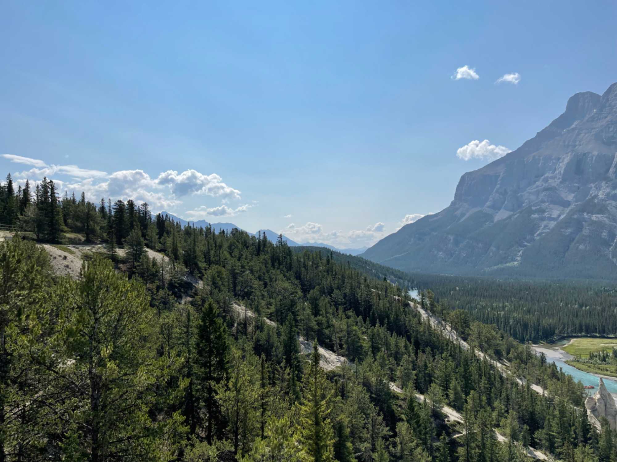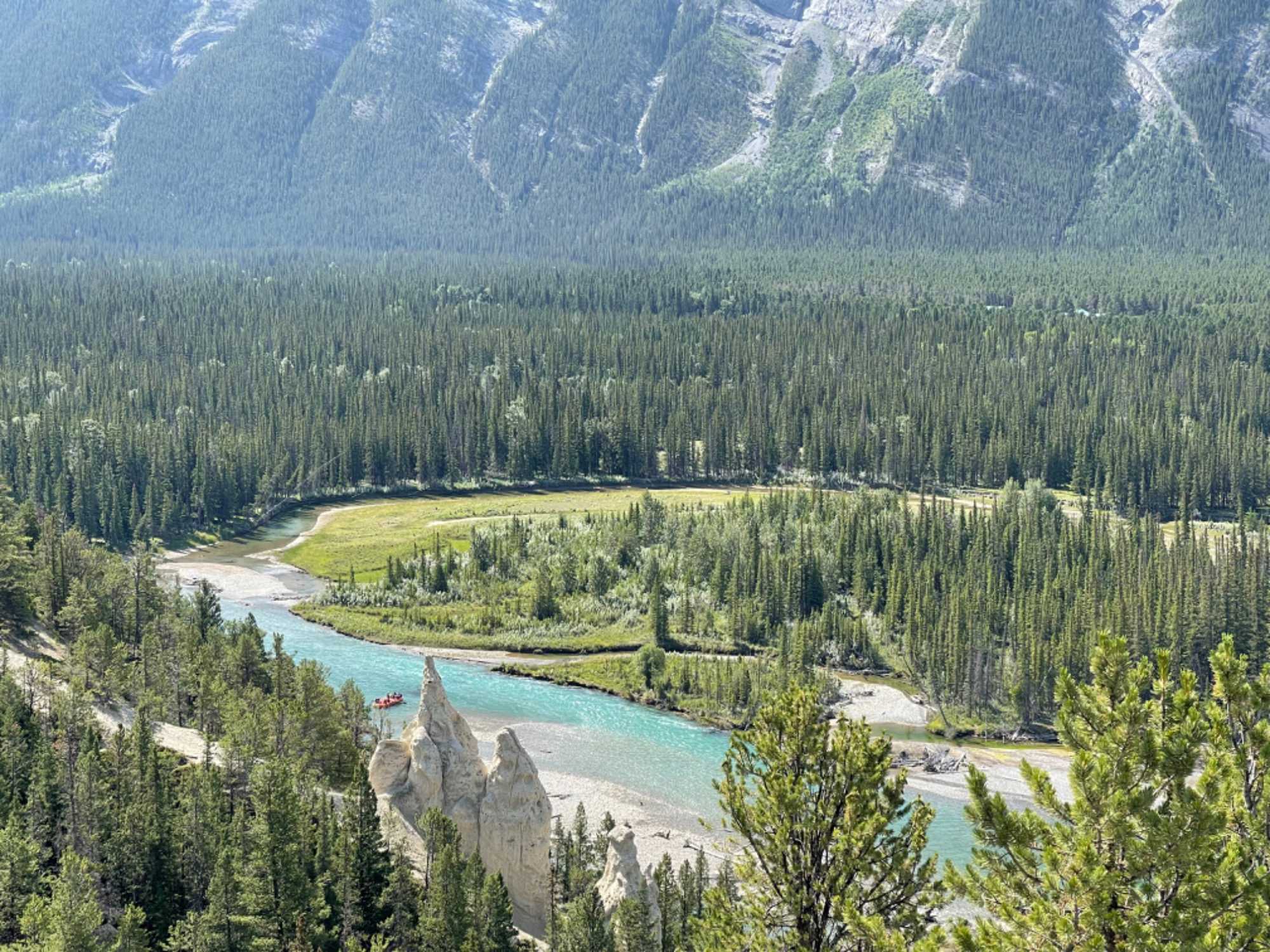 Premier arrêt : on se rend aux Hoodoos, les têtes de cheminées de fées, qui sont des colonnes rocheuses, de matériaux glaciaires, d’une beauté envoûtante, qui se dressent contre le mont Rundle et qui surplombent la rivière Bow, plus bas. Pendant des milliers d’années, la pluie, la fonte des neiges et le vent ont sculpté les matériaux glaciaires et creusé des ravines profondes et étroites. Ces crêtes abritent des plantes qui se sont adaptées à des conditions extrêmement sèches. Une petite marche en forêt nous fait découvrir encore plus de ces Hoodoos et l’hôtel Banff Springs, au loin, où nous avons rendez-vous pour le repas du midi.