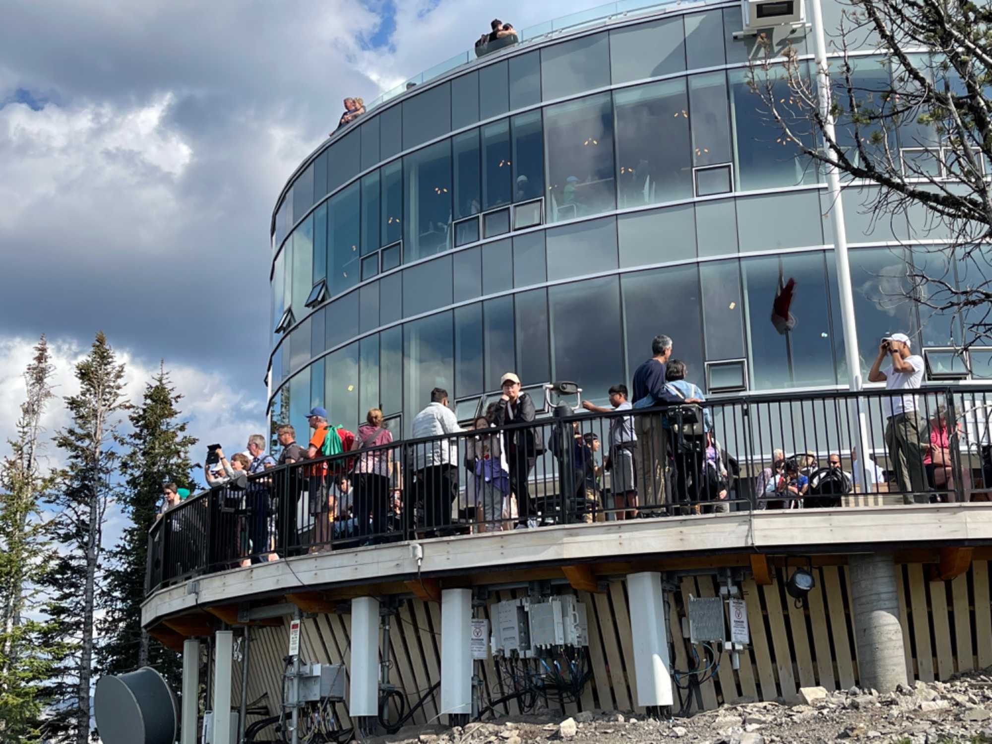 Par la suite, nous sommes allés souper en haut du mont Sulphur, à plus de 7 000 pi d’altitude. Auparavant, quelques voyageurs se sont baignés dans les eaux sulfureuses, l’eau étant à 40 degrés Celsius. On accède à la montagne en gondole seulement et l’ascension dure 10 minutes environ. Nous avons une vue EXTRAORDINAIRE à 360 degrés. On y voit les monts qui entourent la vallée. Nous étions attendus au restaurant Pursuit où une section du restaurant nous était réservée. Ce qui est pratique avec les voyages organisés, c’est que le guide s’occupe de tout et l’attente est minime, juste le temps que le guide aille nous annoncer.