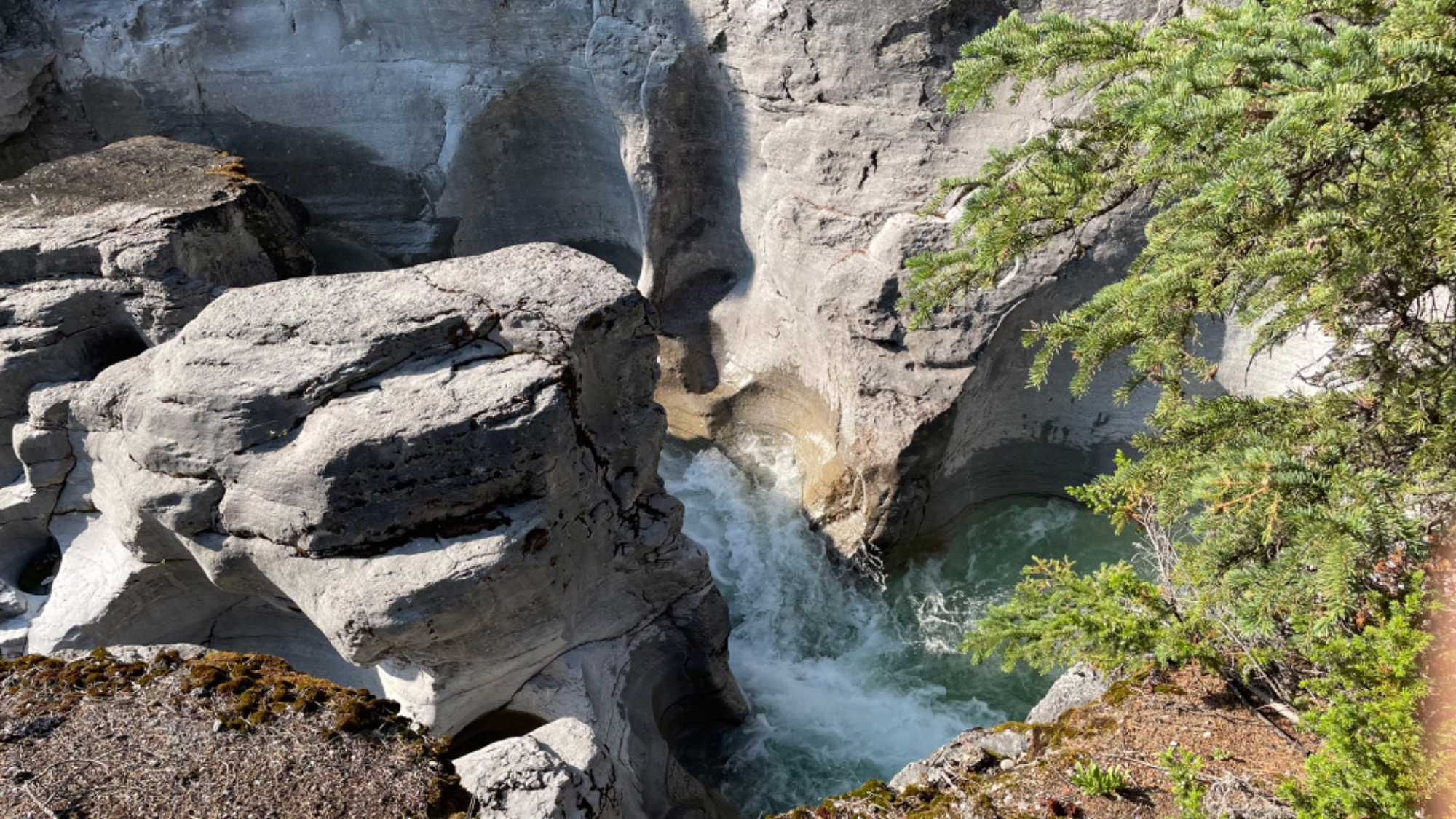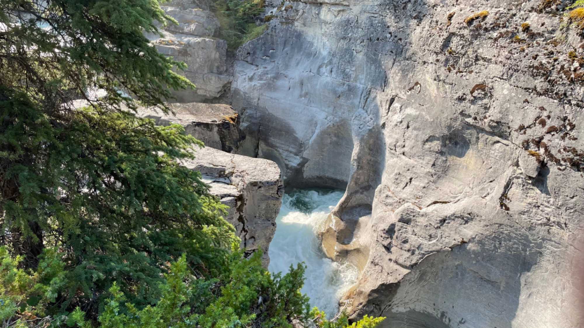 Notre premier arrêt est à Maligne Canyon, superbes chutes aux torrents d’une puissance étonnante. Il est intéressant de voir la force de l’eau qui a sculpté les rochers, des marmites, c’est beau à voir. Le site est un endroit où nous pouvons voir des fossiles imprégnés dans la pierre. On peut en déduire que le substrat rocheux de calcaire du canyon Maligne remonte à la période géologique du Dévonien (il y a de 366 à 362 millions d’années). Tout le secteur était vraisemblablement recouvert d’une grande mer intérieure peu profonde. On a pu apercevoir les fossiles marins dans la roche, entre le premier et le deuxième pont.