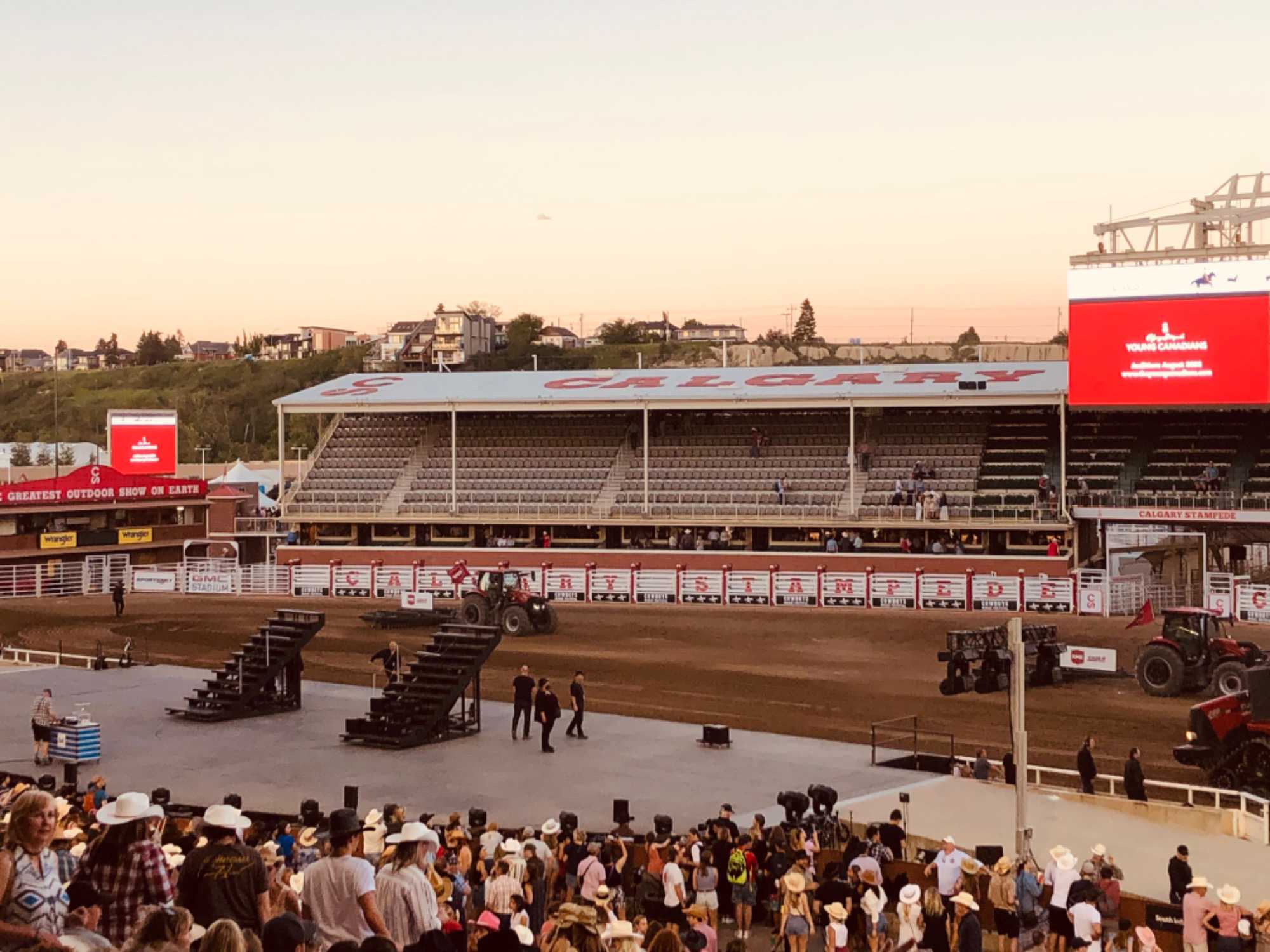 Le Stampede c’est un peu comme le festival western de Saint-Tite mais en plus gros, il se vante d’être « Le plus grand spectacle extérieur au monde ». Près de 17 000 personnes sont présentes ce soir pour assister au fameux « chuckwagon race » et plus de 100 000 personnes assistent aux différentes compétitions de rodéos, aux concerts, aux compétitions agricoles, aux courses de cantines ambulantes, aux compétitions autochtones sans oublier les nombreux kiosques. Chaque soir, un spectacle musical et pyrotechnique d’une qualité exceptionnelle est présenté aux visiteurs. En un temps record, le personnel nettoie la scène, installe une seconde scène avec un tracteur, il se passe à peine 20 minutes que tout est prêt! Le Stampede est complètement transformé et nous le serons également à la vue de ce spectacle grandiose, digne des spectacles présentés à Las Vegas. Le son est d’une pureté et d’une justesse incroyable. Des dizaines de jeunes artistes dansent et chantent, un cowboy fait tournoyer sa corde en feu, les feux d’artifice explosent en coeur. On est sous le charme, sidérés, fébriles. Bravo.
