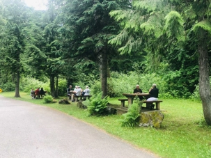 Poursuivant notre route, nous sommes passés près d’un site typique, un hôtel qui est situé à Three Valley Gap. Nous débutons notre ascension dans ces montagnes majestueuses débutant avec les Monashees pour nous rendre dans le parc national de Revelstoke. On voit déjà la différence avec la vallée de l’Okanagan, c’est vert à perte de vue! Arrêt au Giants Cedars (cèdres géants) où nous dînons avec nos boîtes à lunch.