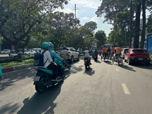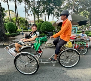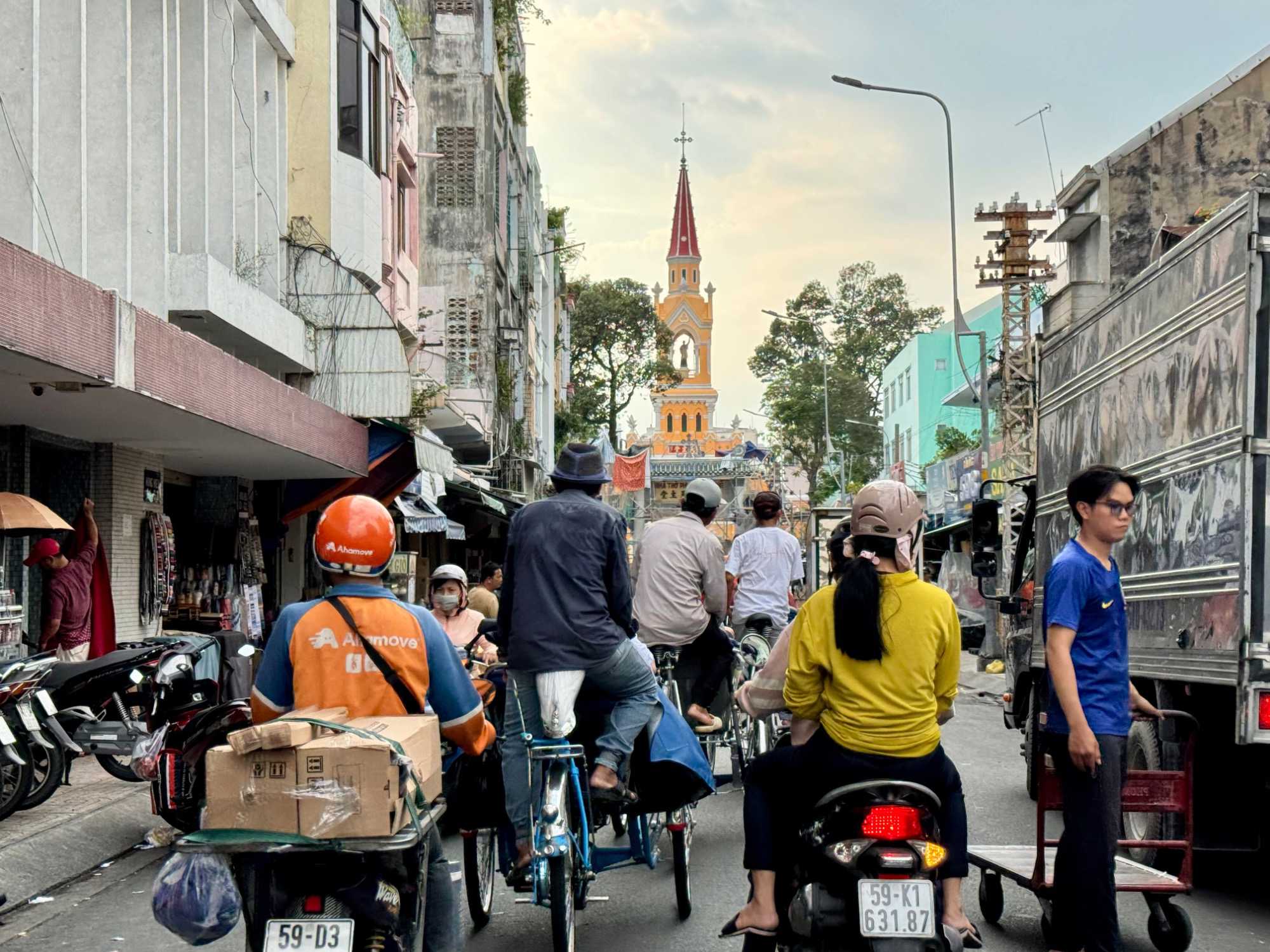 Après notre dîner, nous allons nous promener à pied pour visiter le Marché aux fleurs Hô thi ky. De nombreux kiosques proposent une très grande variété de fleurs de toutes les couleurs. Ensuite, nous allons visiter le quartier chinois de Saigon. Pour ce faire, chaque voyageur monte à bord d’un cyclo-pousse et nous vivons l’expérience mouvementée du déplacement à vélo au travers une circulation très achalandée. Ici, voitures, scooters, autobus, automobiles et vélos tentent de se frayer un chemin sans qu’aucun accrochage ne se produise. Nous vivons une expérience unique et ressentons vraiment bien l’ambiance d’une promenade dans une grande ville asiatique ! À certains carrefours, on ne savait plus où regarder tellement la circulation venait de tous les côtés. Heureusement que les conducteurs de nos cyclo-pousses n’en étaient pas à leurs premières randonnées.