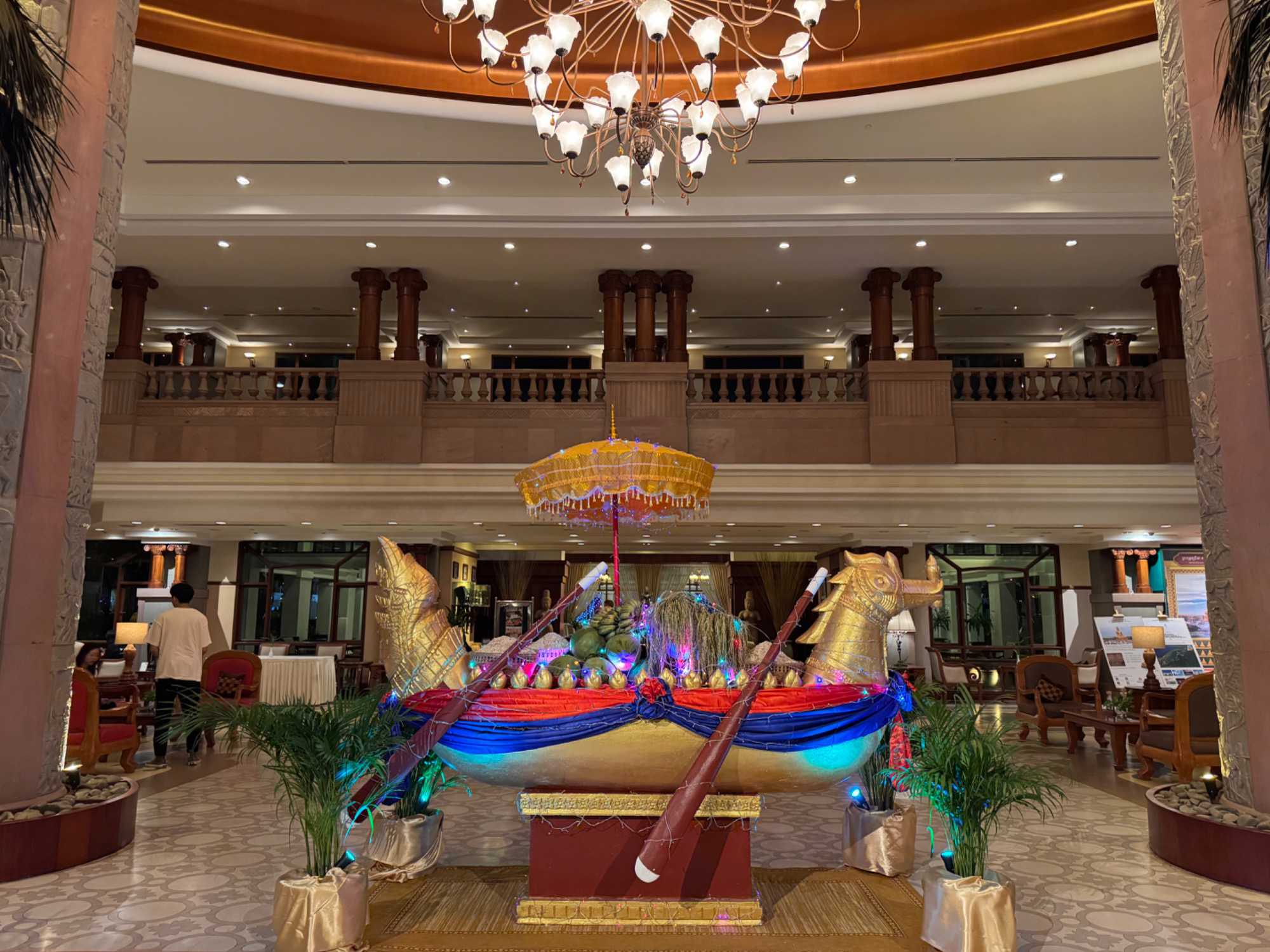 Arrivés au tout récent aéroport international de Siem Reap, ouvert depuis une année à peine, l’enregistrement s’effectue en deux temps et trois mouvements. Un agent nous prend en charge pour les formalités d’immigration parce que l’agence Voyage Louise Drouin a déjà payé pour le visa du cambodge. Les procédures se font de manière accélérée. Nous retrouvons l’ensemble de nos bagages et partons rencontrer Toek, notre guide francophone pour notre séjour à Siem Reap. Toek et son chauffeur nous amènent au très chic Hôtel Sokha Resort pour les 3 prochaines nuits. Nos bagages sont transportés dans nos chambres et nous nous rendons à la très belle salle à manger où on nous attend. Les serveurs et serveuses nous accueillent en s’inclinant les mains jointes. C’est très chaleureux et respectueux ! On nous a préparé un délicieux repas composé d’une excellente salade césar, un délicieux potage, un très bon poisson et une crème caramel pour terminer le tout !