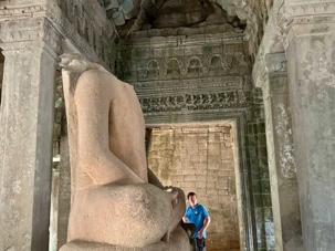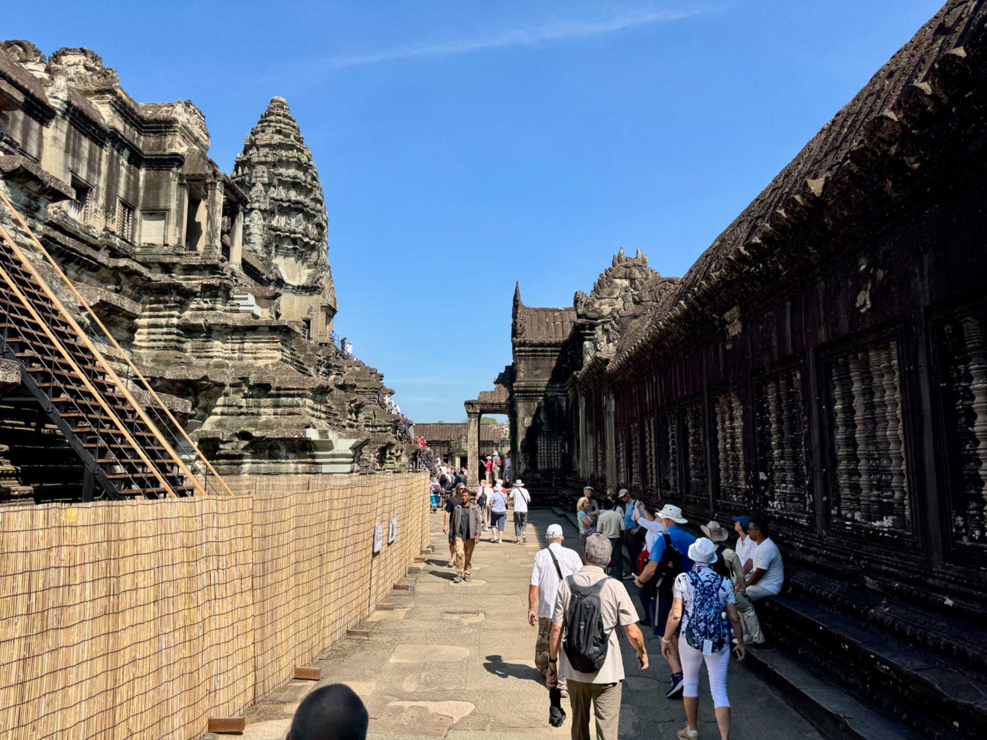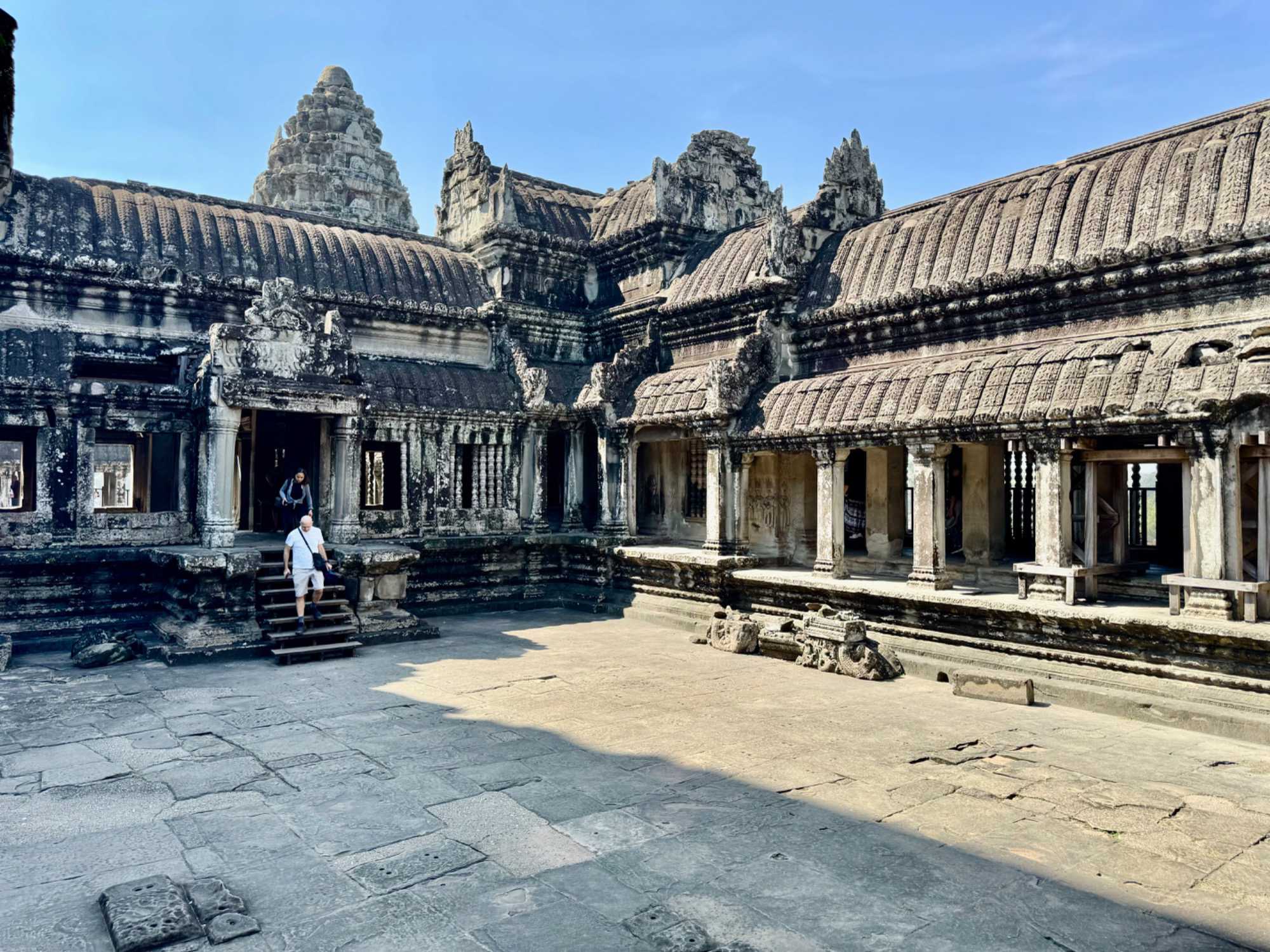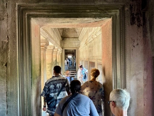 Puis, notre guide Toek nous propose de commencer par la visite du fabuleux temple du complexe d’Angkor Wat. Construit entre 1131 et 1150 par le Roi Suryavarman iI est dédié au dieu hindou Vishnou. Le complexe couvre 200 acres, ce qui en fait probablement le plus grand monument religieux au monde. Il signifie « Temple Cité Royale » et en khmer « la ville pagode ». Il est considéré comme l’une des Sept Merveilles du Monde. D’autres diront, qu’il est la représentation de l’univers terrestre ! Sa partie centrale est le mont Meru, la demeure des dieux principaux de la mythologie hindoue. Le parc environnant représente les continents et le canal externe les océans cosmiques. Le chemin vers l’entrée principale, côté ouest, mène à la zone centrale du complexe. Il est le pont par lequel nous entrons dans la demeure des dieux.