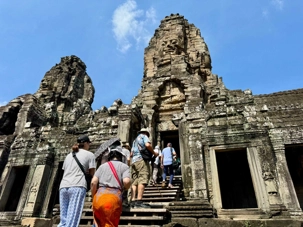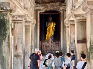 Ensuite, nous visitons l’impressionnant temple Ta Phrom. C’est le temple le plus romantique du site d’Angkor. Au XIIIe siècle, il y avait 12 000 personnes qui vivaient dans l’enceinte du temple. Aujourd’hui, la nature a repris ses droits et a disloqué l’oeuvre des hommes. Les arbres et les racines ont envahi le site et cela n’a pas été « nettoyé ». C’est ainsi que les archéologues ont trouvé la majorité des temples avant leur restauration. Deux espèces d’arbres sont très présentes sur le terrain : le gommier, arbre très haut, très droit qui donne une sève très noire et le fromager qui a des racines tentaculaires et envahissantes.