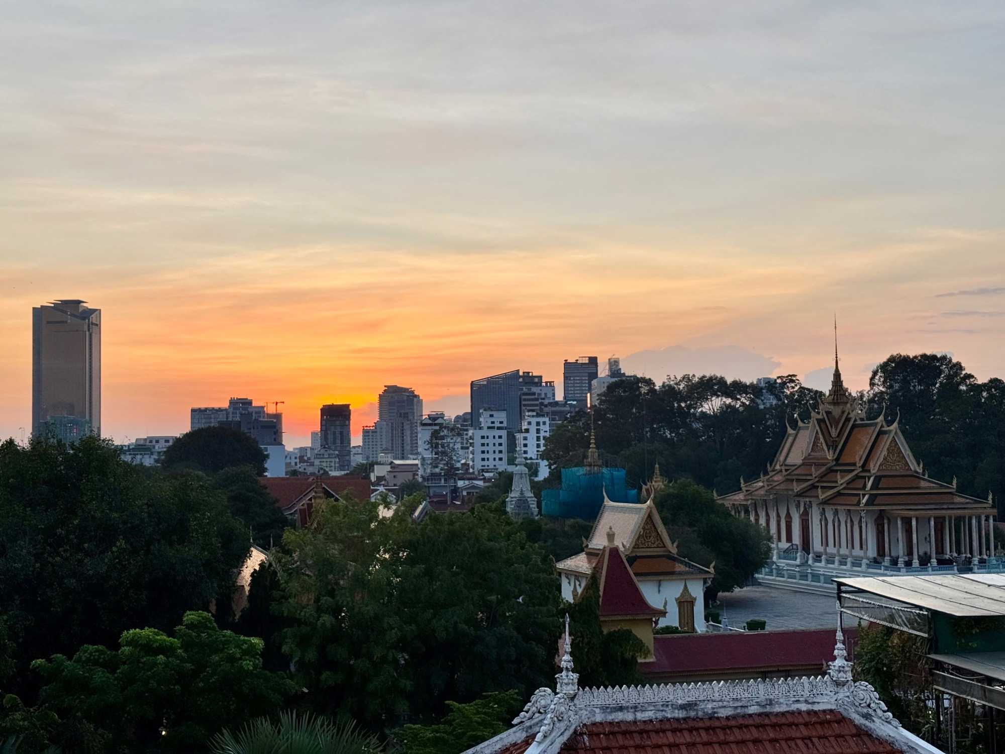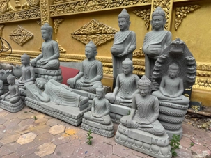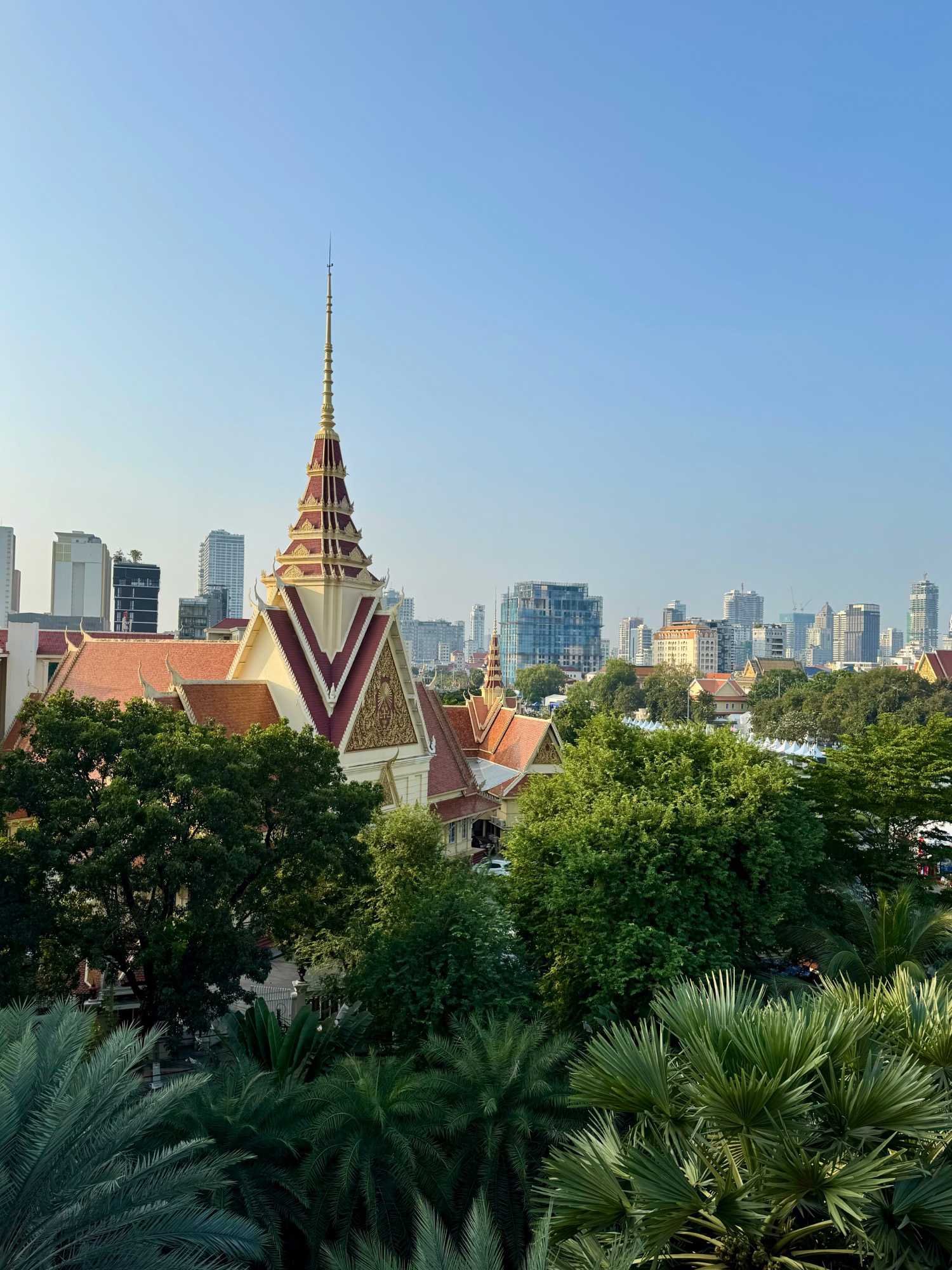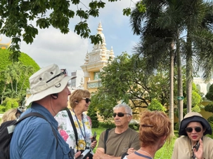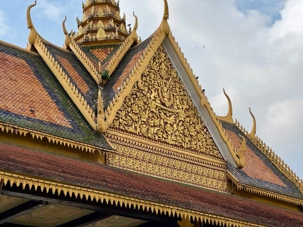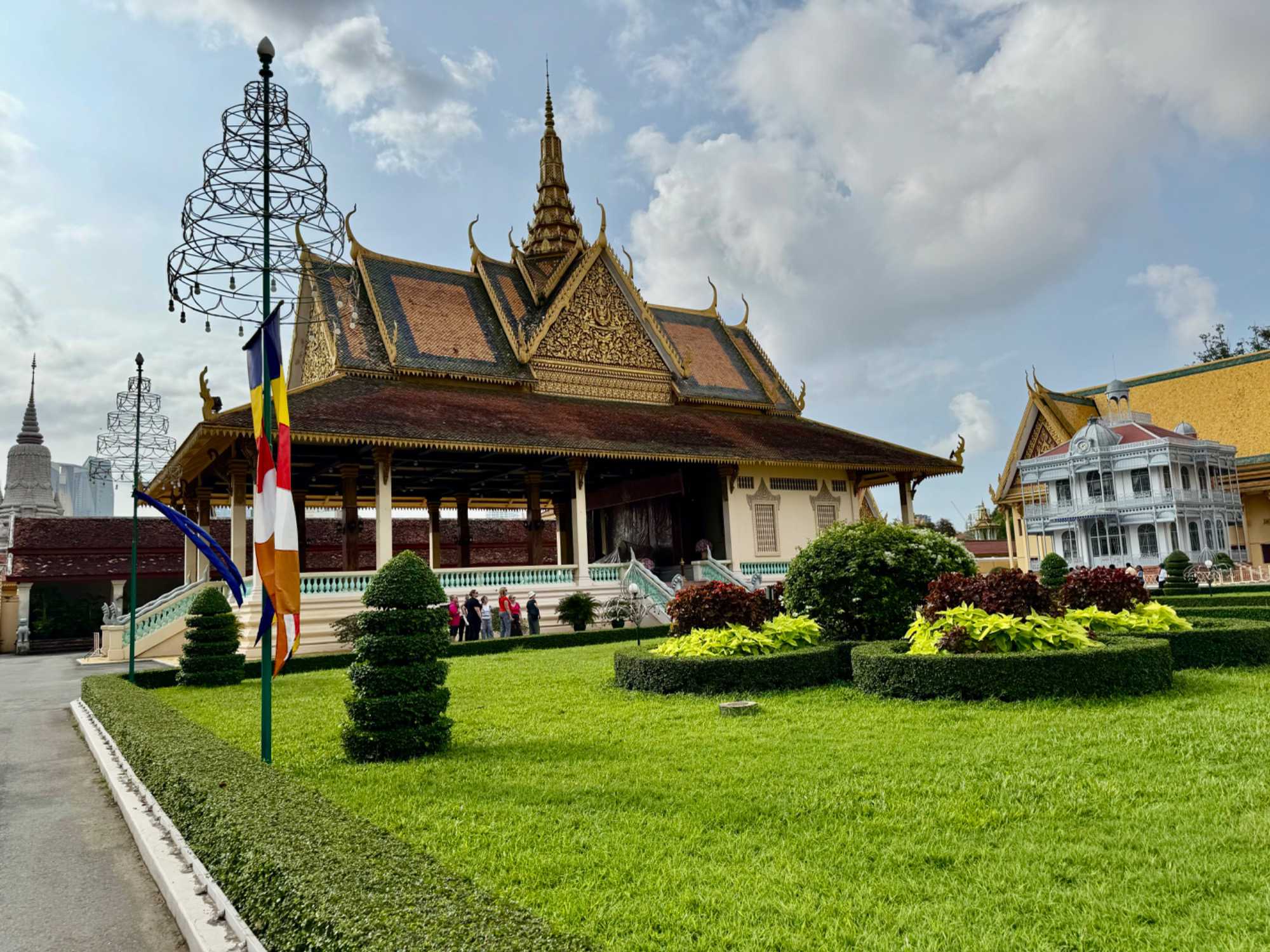 Après un autre très copieux petit-déjeuner, nous nous rejoignons tous dans le lobby de l’hôtel pour partir ensemble à pied visiter le Palais Royal. C’est un majestueux complexe de bâtiments situé sur les rives du Mékong, au coeur de la capitale cambodgienne. Il occupe une surface de 18 hectares. Construit dans un style architectural khmer traditionnel, ce palais sert de résidence principale au roi du Cambodge et abrite plusieurs édifices d’une grande valeur historique et culturelle. Ses jardins luxuriants, ses pagodes dorées et ses sculptures ornées d’or font du Palais Royal un symbole éclatant de l’héritage et de la grandeur du royaume cambodgien. Il se compose de plusieurs pavillons réparties en deux grandes enceintes : celle du Palais Royal au nord, et celle de la Pagode d’Argent au sud. Il n’est pas possible de visiter le Palais Royal puisqu’il est toujours habité par la famille royale. D’ailleurs, aujourd’hui nous savons que le roi est chez-lui puisque le drapeau bleu est hissé sur son mat. Il est présent aussi parce que c’est la Fête de l’Eau et les heureux vainqueurs des courses de bateaux dragons auront l’opportunité de se joindre à sa majesté pour une photo ! C’est pour eux la récompense ultime ! Nous prenons beaucoup de photos du Palais Royal. La Pagode d’Argent ce prestigieux et précieux édifice doit son nom à son pavement composé de 5 000 dalles d’argent, don de Napoléon III, chacune pesant plus de 1 kg.