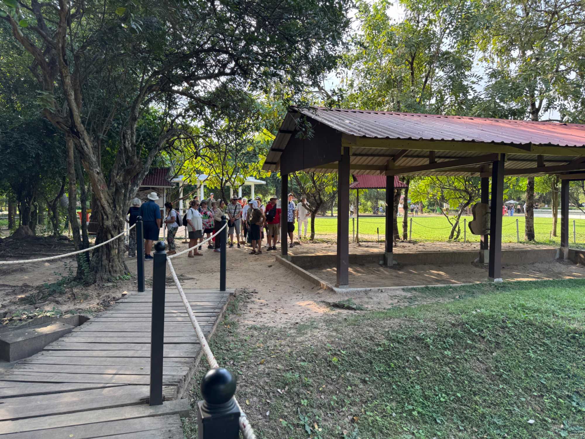 Ensuite, nous visitons le site Choeung Ek, le site d’extermination des prisonniers du régime de Pol Pot ayant été détenus et torturés dans la prison S-21. Avant de devenir le centre d’exécution des Khmers rouges, le site Choeung Ek était un cimetière chinois. En arrivant sur le site, nous voyons un mémorial érigé sous la forme d’un stupa avec des côtés vitrés permettant de voir les crânes humains des victimes des Khmers rouges. Sela nous raconte l’histoire du régime de Pol Pot et de la dictature, déguisée sous forme de démocratie, responsable de cette abomination transformée en génocide et responsable de la mort d’environ trois millions de cambodgiens à travers le pays. Ils auraient découvert 129 fosses communes dont 80 ont été fouillées. Aujourd’hui, Choeung Ek est un lieu de recueillement. Le gouvernement cambodgien encourage les visiteurs à voir le site et à ne jamais oublier les atrocités commises par le régime des khmers rouges. Entre 1975 et 1978 environ 17 000 hommes, femmes, enfants et bébés détenus et torturés à la prison S-21 ont été transportés vers le camp d’extermination de Choeung Ek. Nous quittons le coeur triste et l’esprit tourné vers une réflexion profonde.