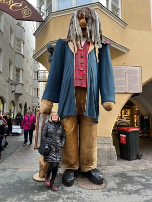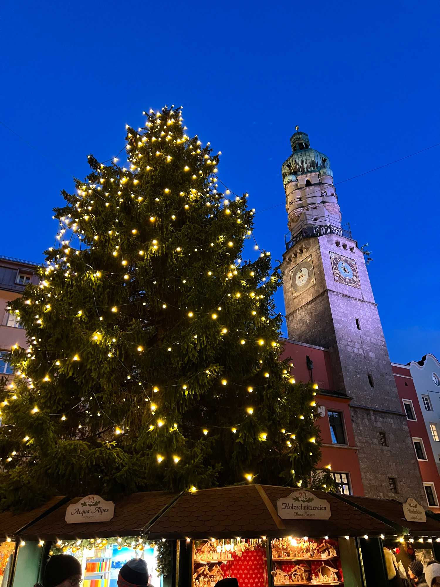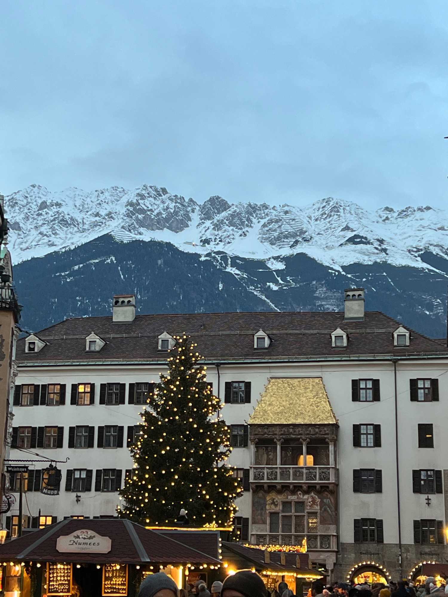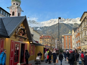 En après-midi, nous redescendons les deux pieds sur terre (!), et on se dirige vers notre premier marché de Noël officiel! On choisit le marché de Noël de la vieille ville, un des plus anciens et populaires. Dans le centre historique d’Innsbruck, la période de Noël se présente sous sa forme traditionnelle, romantique et pleine d’ambiance. Installés directement devant le Petit Toit d’or, les stands du marché de Noël sont joliment nichés entre les maisons médiévales. Les stands sont une véritable mine aux trésors, de décorations pour l’arbre de Noël, d’artisanat d’art, de lainages et de cadeaux-souvenirs de toutes sortes. On se donne du temps pour parcourir ce marché. Les tentations d’achat sont immenses… c’est quand même bien pour cela qu’on est venu non?