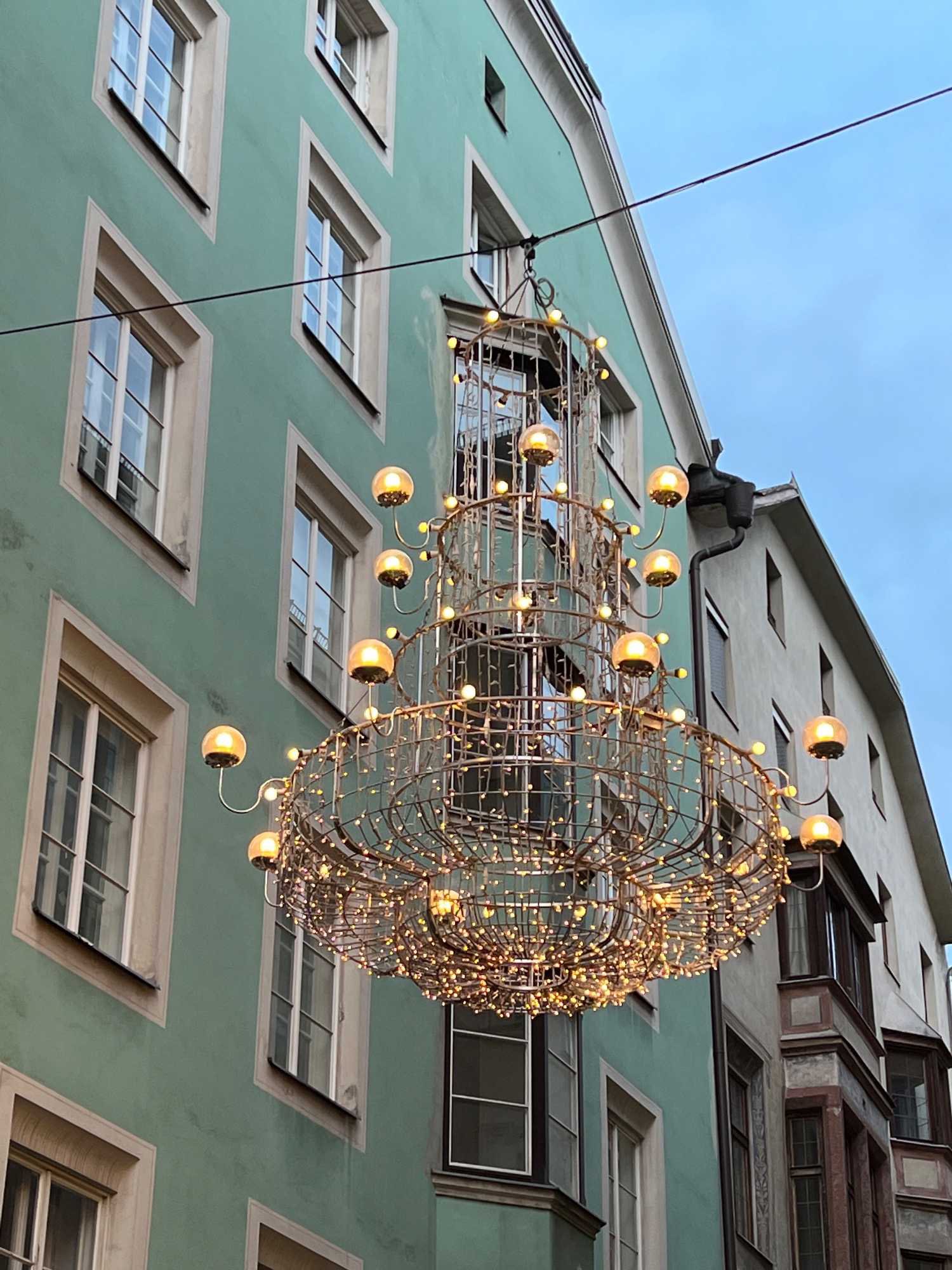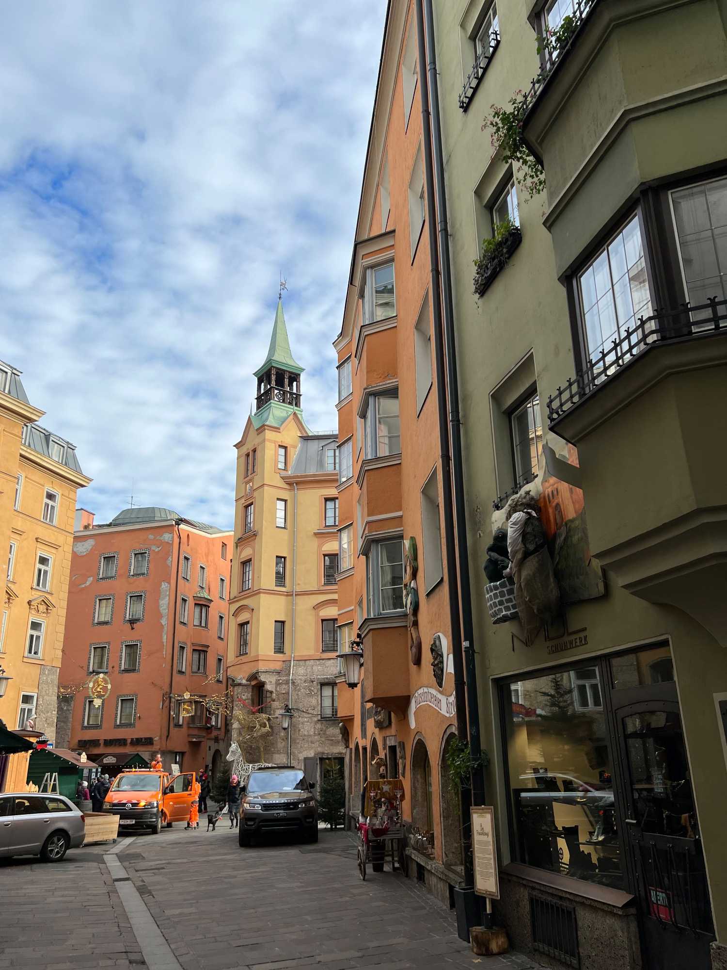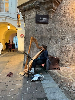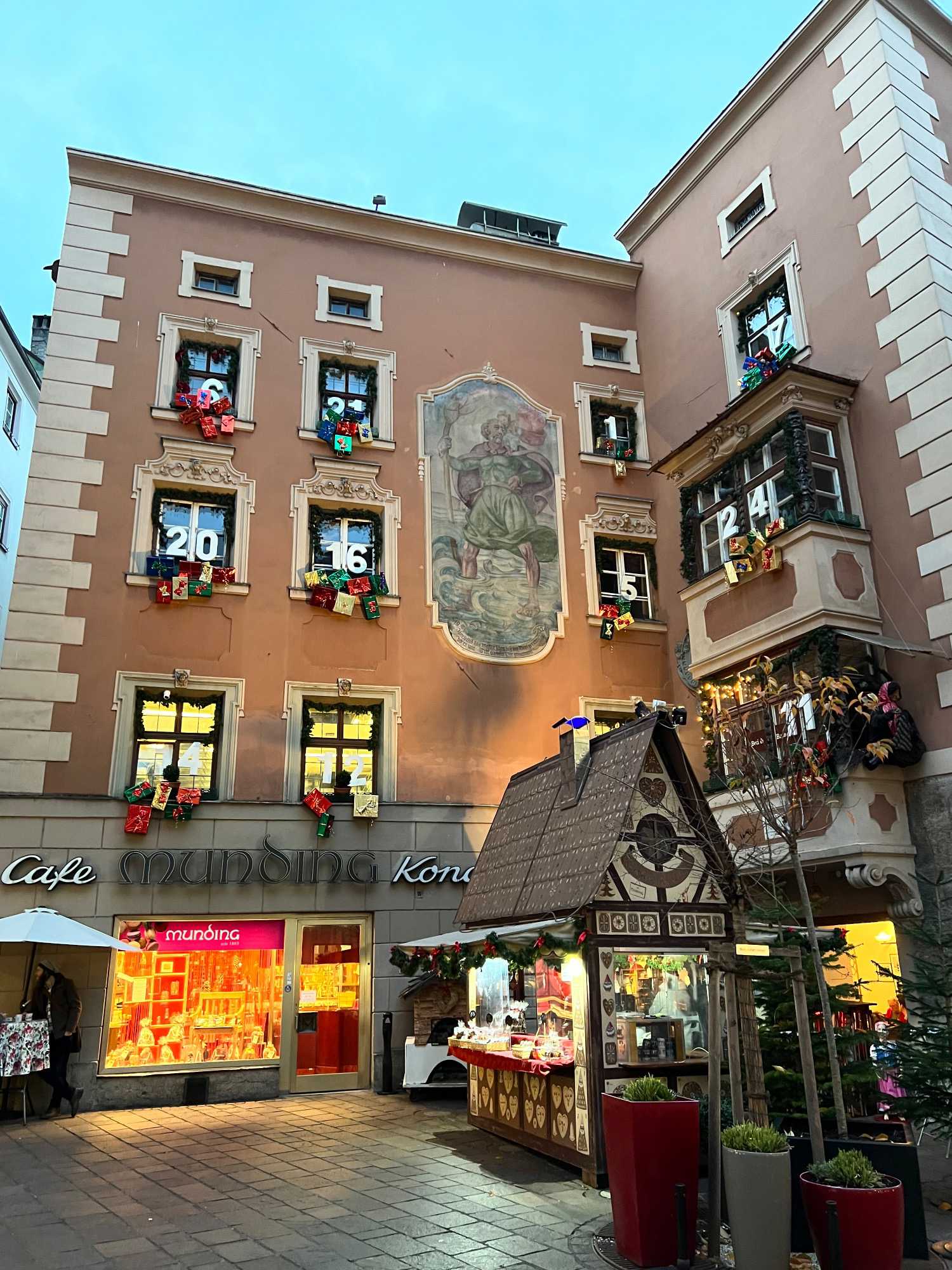 En après-midi, nous redescendons les deux pieds sur terre (!), et on se dirige vers notre premier marché de Noël officiel! On choisit le marché de Noël de la vieille ville, un des plus anciens et populaires. Dans le centre historique d’Innsbruck, la période de Noël se présente sous sa forme traditionnelle, romantique et pleine d’ambiance. Installés directement devant le Petit Toit d’or, les stands du marché de Noël sont joliment nichés entre les maisons médiévales. Les stands sont une véritable mine aux trésors, de décorations pour l’arbre de Noël, d’artisanat d’art, de lainages et de cadeaux-souvenirs de toutes sortes. On se donne du temps pour parcourir ce marché. Les tentations d’achat sont immenses… c’est quand même bien pour cela qu’on est venu non?