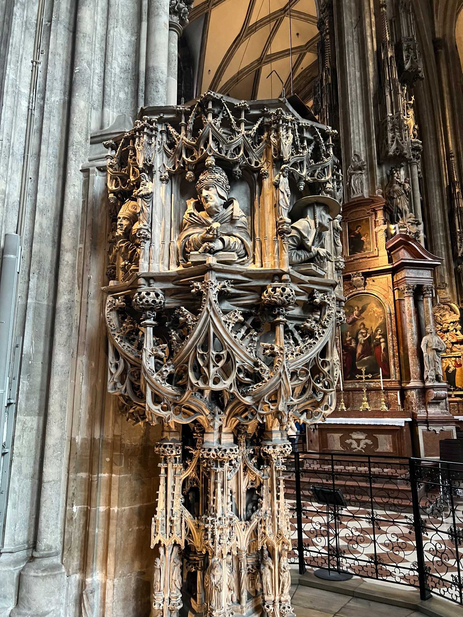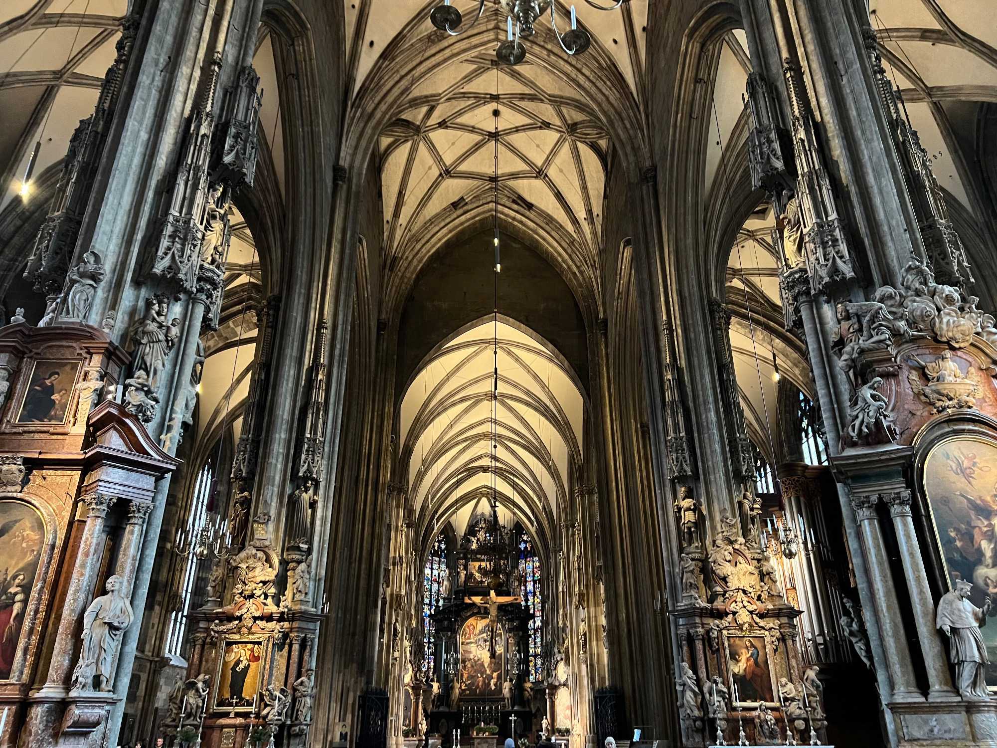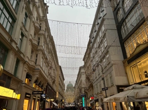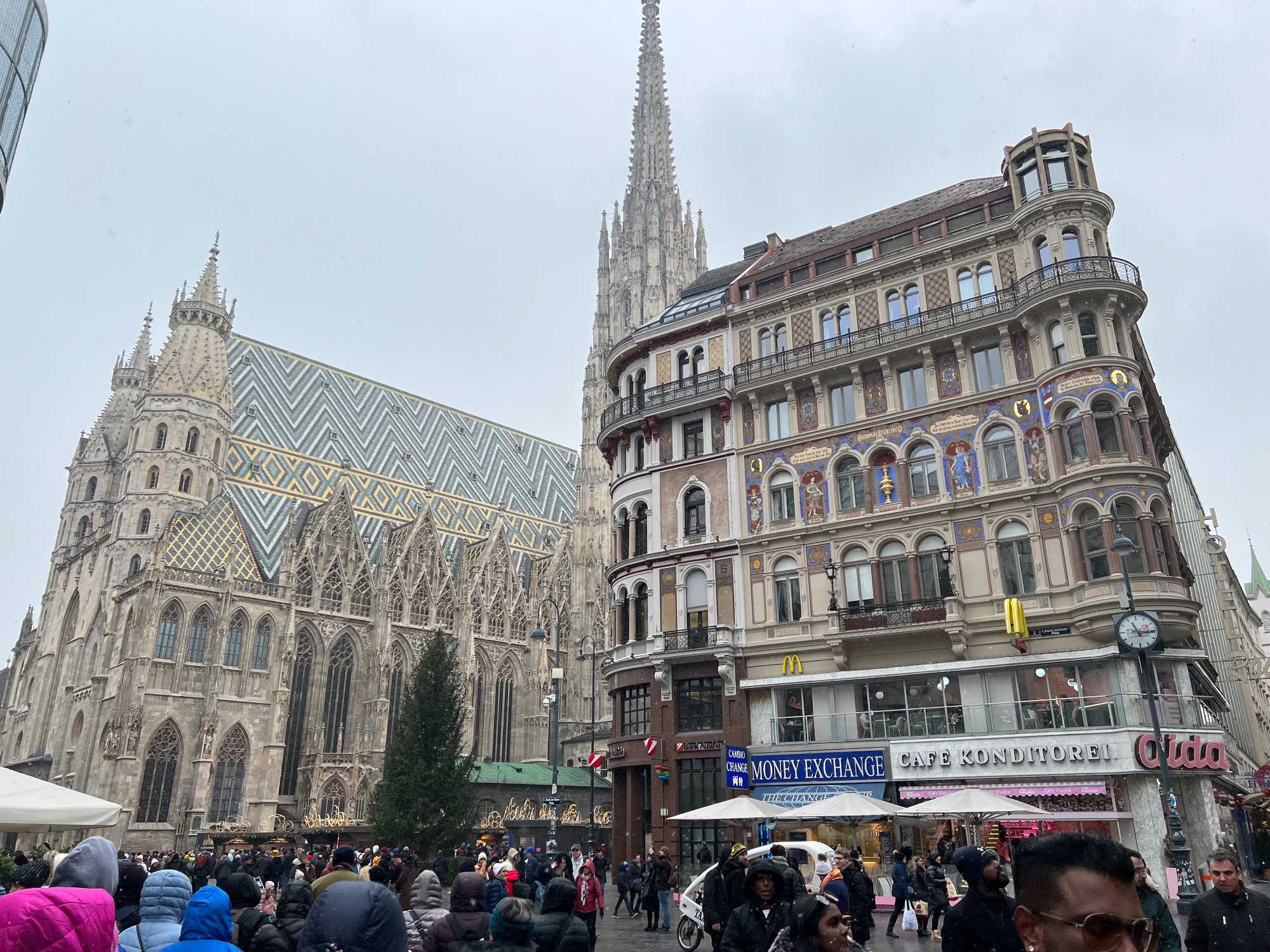 Nous poursuivons notre balade à pied dans la vieille ville de Vienne. Il y a plein de belles décorations de Noël, nous en avons plein la vue. On visite aussi la cathédrale St-Étienne. Cette cathédrale est de style gothique, mais au centre d'un quartier baroque. Son bourdon « Die Pummerin » (la cloche) pèse 20 tonnes. Sa toiture est composée de tuiles vernissées, disposées en motifs linéaires, en diagonale. Sur le toit de la partie Est se trouve l'emblème de l'Empire d'Autriche-Hongrie : l'aigle à deux têtes. La flèche la plus haute de la cathédrale culmine à 136 mètres de hauteur, faisant de la cathédrale Saint-Étienne le plus haut monument religieux de Vienne. La construction de la première église romane a débutée en 1137. Par la suite il y a eu plusieurs feux et plusieurs reconstructions au fil des années. Sévèrement endommagée pendant la Seconde Guerre mondiale, la cathédrale a été restaurée en sept ans et a rouvert dès 1952. Philipp est des plus intéressant. Il nous amène jusqu’au restaurant et nous le retrouverons demain matin.