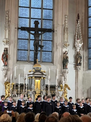 Bonjour! Aujourd’hui, nous assistons à de belles prestations typiquement viennoises. Tout d’abord, nous allons à la messe de la chapelle du Palais Impérial afin d’entendre les petits chanteurs de Vienne. Une institution à Vienne! Les Petits Chanteurs de Vienne est un des plus anciens et prestigieux chœurs de garçons puisqu'il a été fondé en 1498 par l'empereur Maximilien, qui souhaitait entendre des voix de garçons parmi les musiciens officiels de la cour. Aujourd'hui, le chœur est composé d'une centaine de choristes, tous garçons entre dix et quatorze ans, divisés en quatre formations. Le Wiener Sängerknaben donne environ 300 concerts par an. Il effectue de nombreuses tournées à travers le monde, en plus des messes traditionnelles chantées chaque dimanche à la Chapelle impériale de Vienne. Mais la formation n'est pas seulement un chœur : elle possède sa propre école mixte où deux cent cinquante enfants reçoivent une éducation complète en plus de l'éducation musicale, depuis la maternelle jusqu'à la fin du collège, dans un palais baroque de Vienne, le Palais Augarten. Seuls les plus talentueux des garçons de l'école rejoignent le chœur à l'âge de dix ans. Ce fut un vrai beau moment. La messe était principalement en latin, avec des explications/traductions en allemand et en anglais.