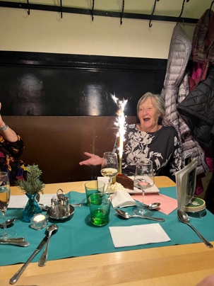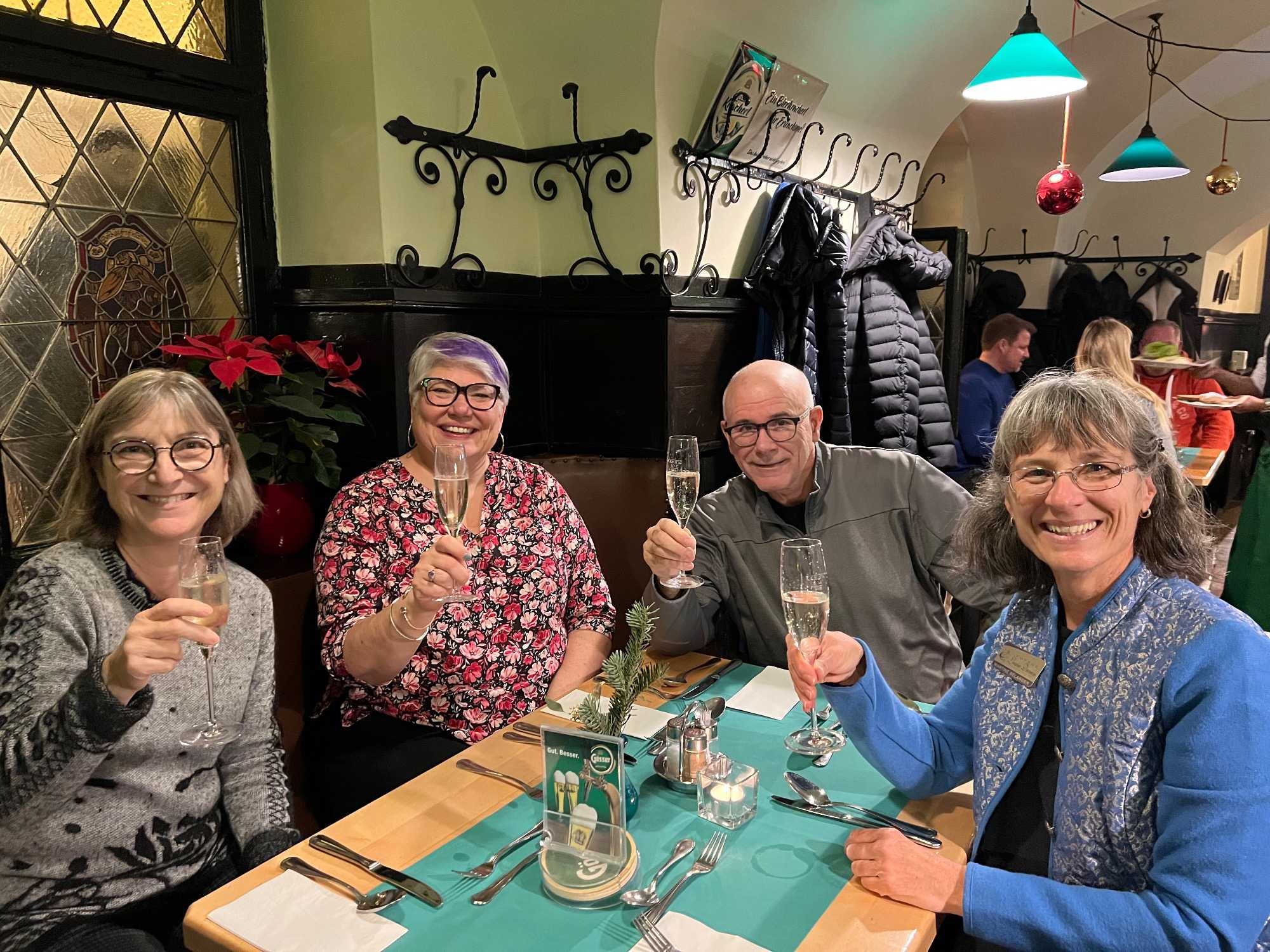 Et ce soir, comme souper « d’adieu » (je n’aime pas ce terme car on se reverra au brunch VLD!), nous allons au Gösser Bierklinik, le plus ancien restaurant encore exploité à Vienne. Le bâtiment est un point de repère traditionnel depuis plusieurs siècles. La première fois que le bâtiment a été enregistré dans un document écrit, c'était en 1406. Depuis 1566, il est utilisé comme auberge, faisant de la Gösser Bierklinik l'une des plus anciennes auberges de Vienne aussi. On nous sert un apéritif en arrivant. On a bien du plaisir tous ensemble. On peut dire que la chimie du groupe a été excellente durant ce voyage. On profite de ce dernier repas pour souligner l’anniversaire de Claudette (FB) et de Alain qui sera demain. Bonne fête à vous deux!