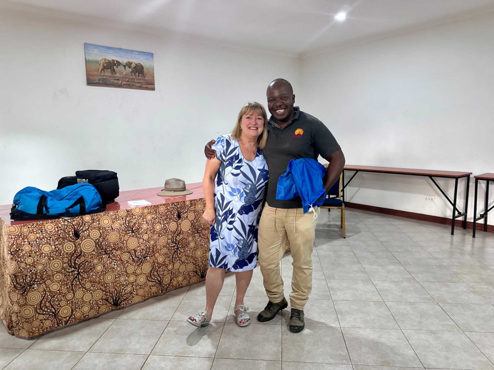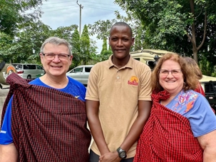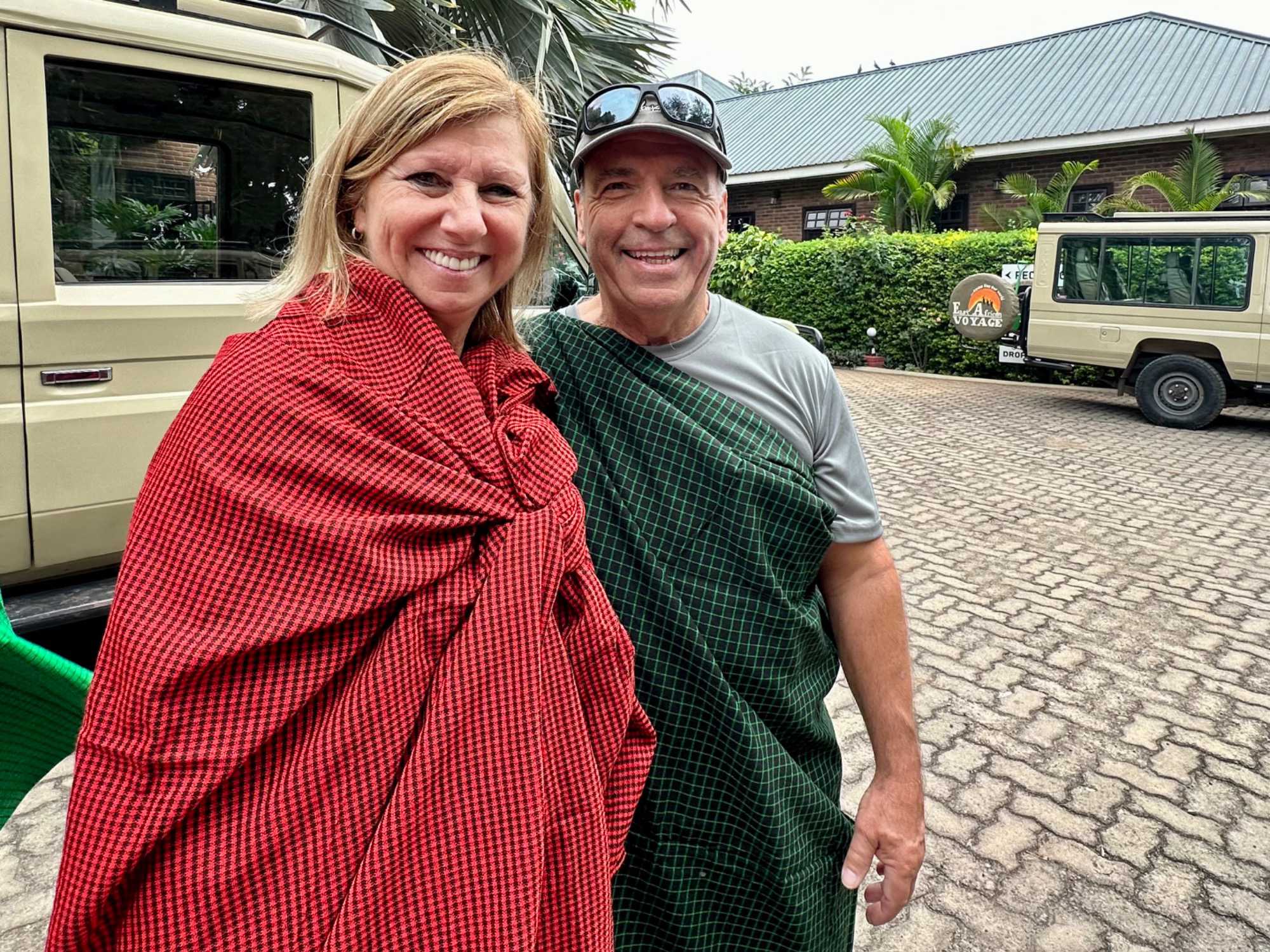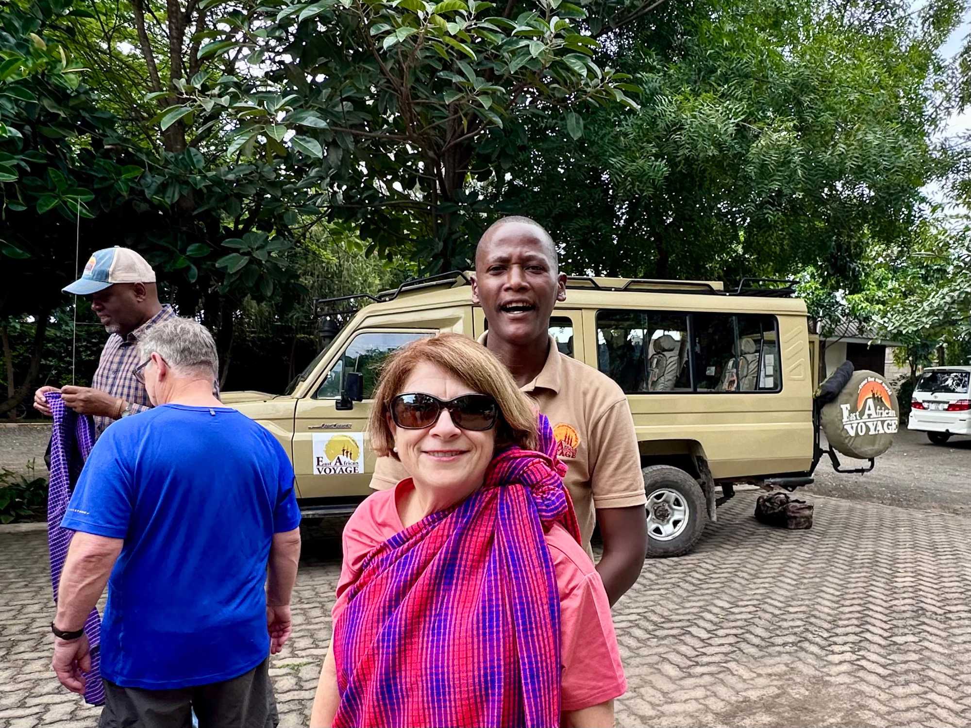 Nous nous retrouvons pour une rencontre afin de bien débuter notre voyage. Nos guides sont là et Fidélis et Alex nous parlent du voyage qui nous attend. Wow que de belles aventures en prévisions. Nous sortons dans la cour ou nos jeeps nous attendent et Onesmo le propriétaire nous a fait un joli cadeau. Obama est là avec des tissus maasai qui sont des pièces de tissus colorées qui servent de vêtement, de couverture ou de nappe. Nous sommes donc costumés pour notre départ mais comme la chaleur arrive nous les plions pour les placer dans nos sacs.
