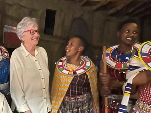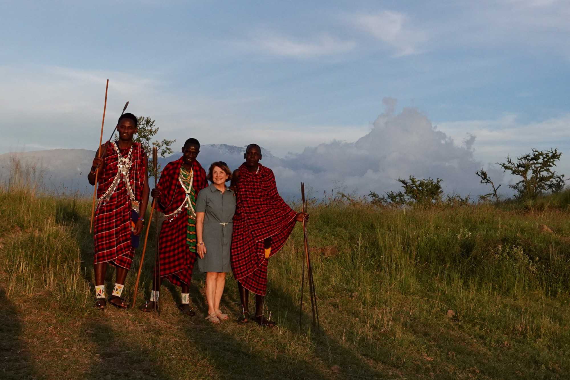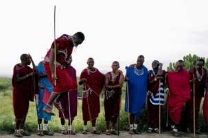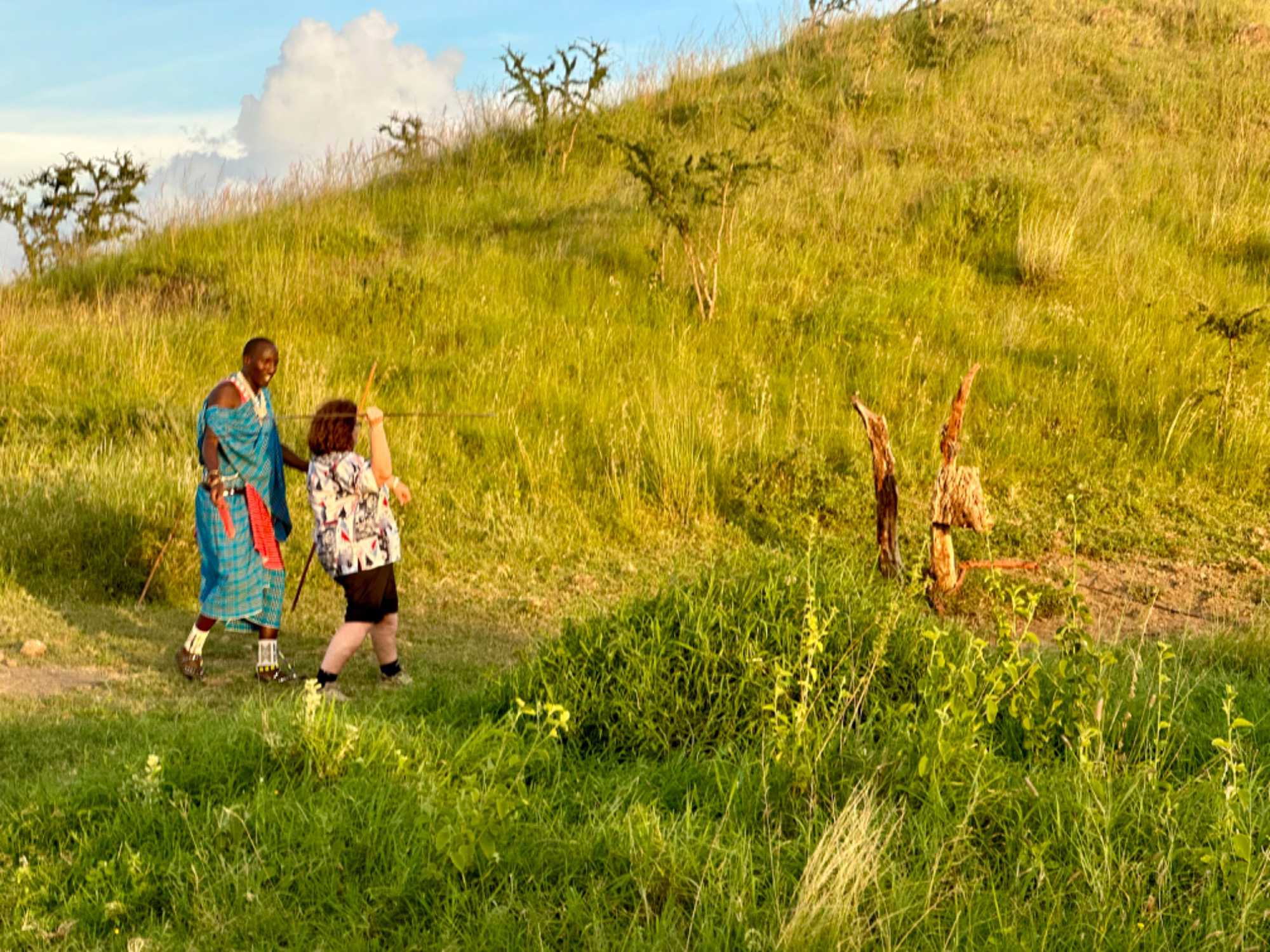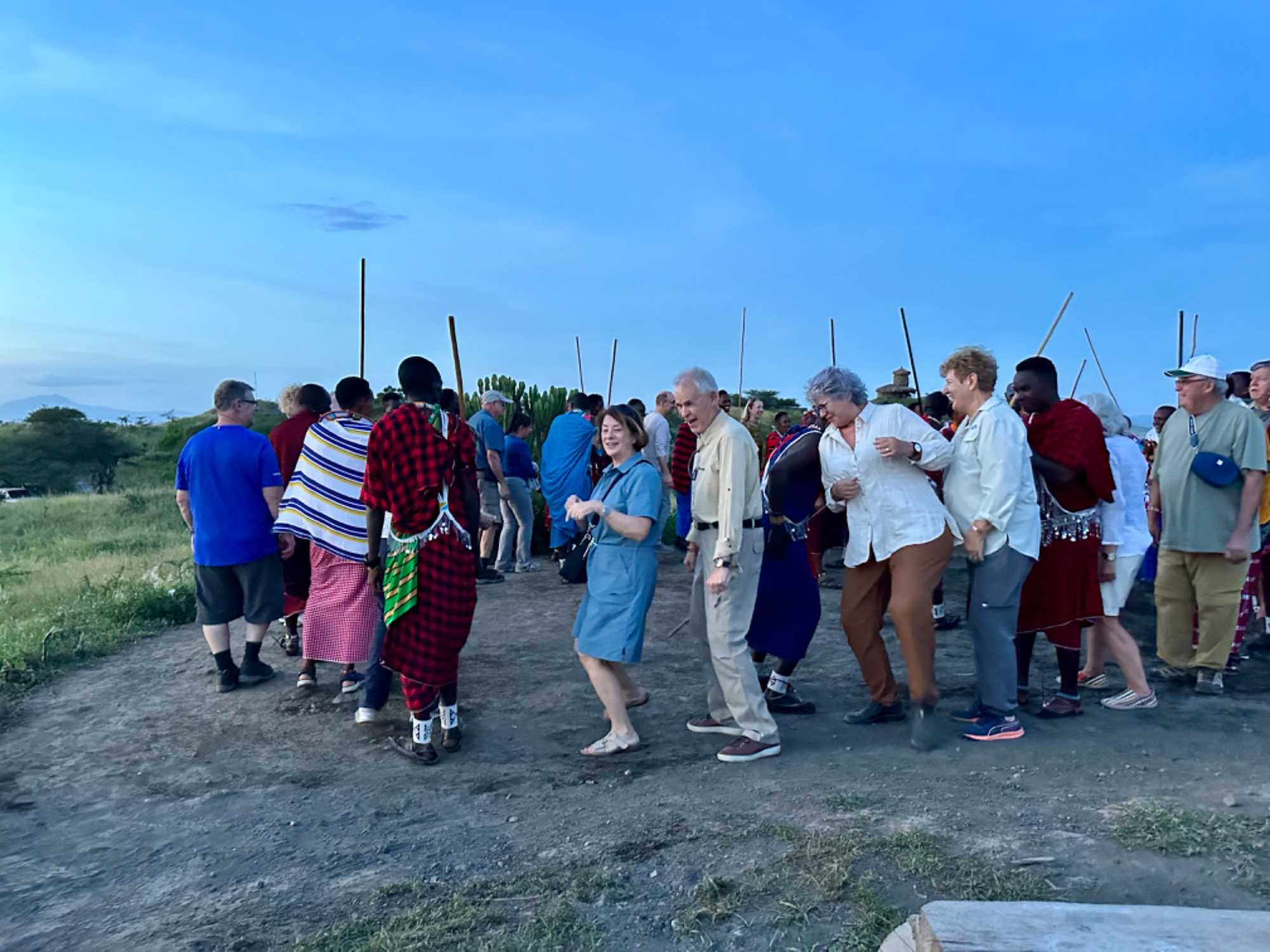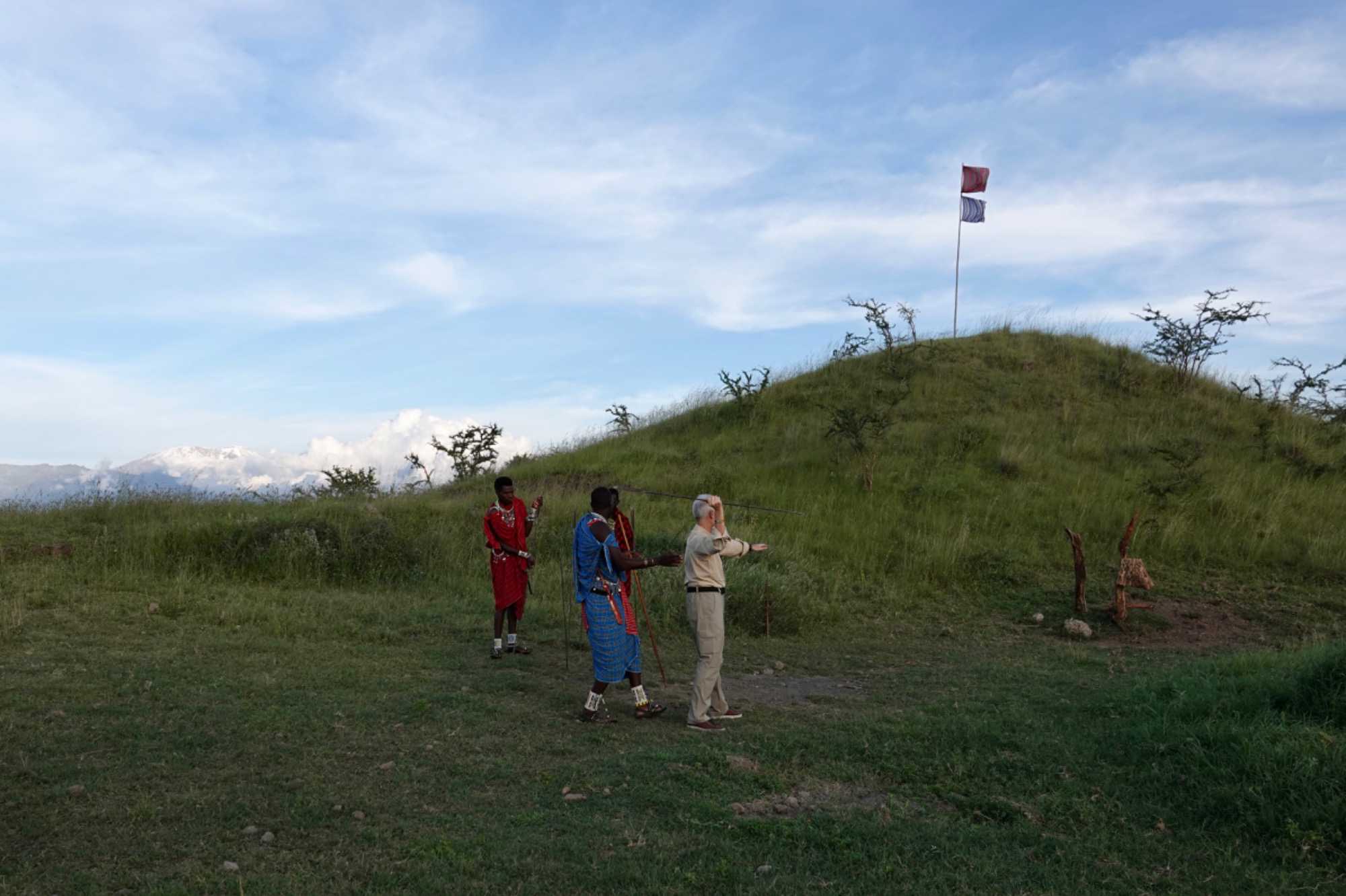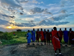 À 17 h 00 c’est une rencontre avec des membres du clan massaï, afin de participer à certaines des activités quotidiennes des Massaïs aux environs du Lodge. L’on nous apprend sur les cultures médicinales et sur les plantes. À 17h30, c'est l'heure de l'excitant concours de lancer de lance ! Nous avons eu droit à des essais intéressants par nos voyageurs. Ce qui semblait facile finalement ne l’est pas toujours…À 18 heures, nous nous installons avec une boisson fraîche pendant que les Massaïs exécutent leur danse du coucher du soleil. C’est magique de les voir danser entre le Mt Meru et le Mt Kilimandjaro, quelle belle énergie ils ont ces maasaï ! Sophie prend plusieurs photos qui vous plairont assurément, la soirée est parfaite, tout le groupe apprécie ce moment. Nous avons même dansé avec eux avant de retourner au lodge pour l'heure de MTV (Maasaï TV).