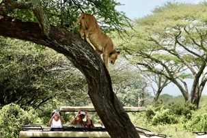 C’est le Maramboï tented lodge qui nous accueille ce soir. Situé entre le lac Manyara et le parc national du Tarangire, ce campement permanent offre des vues imprenables sur le paysage aride de la région, avec ses prairies vallonnées et ses déserts bordés de palmiers. Ses 30 tentes spacieuses sont surélevées et disposent d'une salle de bain et d’une véranda privée. Situé dans un endroit exceptionnel, ce campement donne un avant-goût de cette région où peu de visiteurs s’aventurent. L’apéro au coucher de soleil sur le lac était très beau et surtout unique, car il y a des animaux partout tout autour. Nous nous installons dans nos jolies tentes de luxe et pour revenir au souper nous devons nous faire escorter, car nous sommes oui cette fois-ci chez nos amis les animaux. C’est tout un sentiment que celui de partager leur résidence et d’être leurs invités. Nous vous en parlerons demain après une nuit avec eux. Le souper était délicieux et nous avons bien du plaisir à nous raconter les anecdotes de la journée.