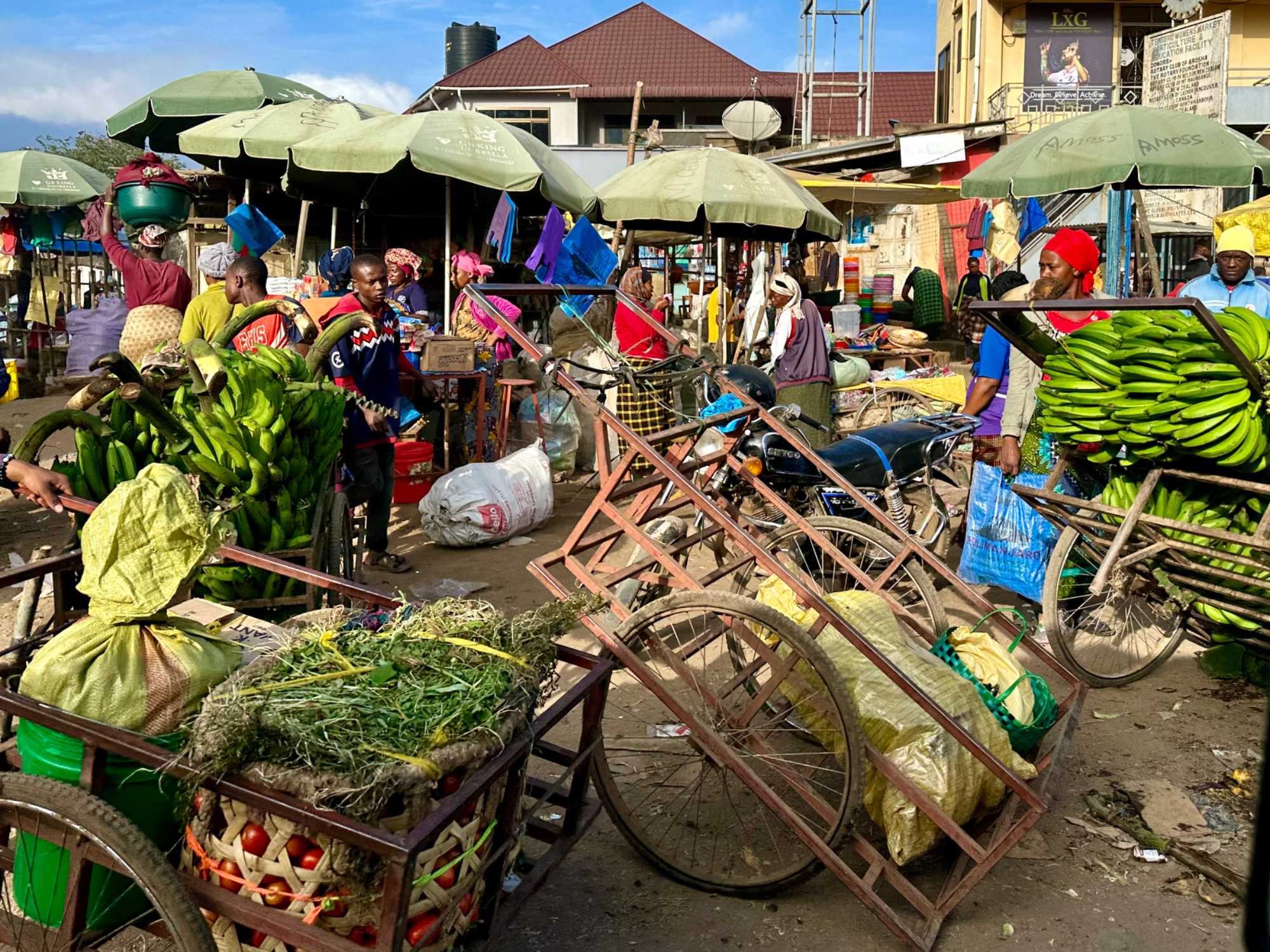 Aujourd'hui, nous quittons notre lodge Duluti et nous devons dire au revoir au personnel qui nous a si bien accueillis. Ils chantent pour nous à notre arrivée et au départ. Il n’y a pas beaucoup d’endroits dans le monde comme cela ! Je me répète, mais leurs mélodies sont tellement envoûtantes. À bord de nos jeeps nous nous dirigeons vers le Parc de Tarangire pour toute la journée. Nous traversons un petit village où se déroule un marché local et où l’on peut se procurer des vêtements d’occasion. Comme c’est samedi nous avons droit à tout un spectacle de ce grand marché où se déplace tellement de monde. Nos photos sont très représentatives de l’activité que nous y découvrons. Nos véhicules se faufilent sur la route avant d’atteindre la route principale. Nous aurons environ 2 h 30 de route avant d’atteindre le parc de Tarangire.