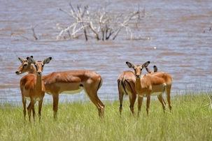 C’est quelque chose quand même de dire que nous avons dormi dans une tente au milieu des animaux en Afrique. Je souhaite à tous de vivre cela un jour. Nous devons quitter aujourd’hui ce lieu, mais pour d’autres aventures assurément. Le temps est merveilleux. À notre réveil nous avions le bonheur de photographier un attroupement de gnous voisin d’un autre groupe de zébres. Mais le plus joli était de voir une cinquantaine d’impalas brouter juste au pied de notre balcon. Moment féérique et même s’il est tôt l’excitation est au rendez-vous. Ça commence bien notre journée! Tout le monde est heureux ce matin, car ils ont eu la même chance que nous de débuter avec ces images de nos rêves d’Afrique. Même les phacochères sont venus avec leurs bébés nous saluer. J’ai même appris par une de nos voyageuses qu’hier un zébre avait décidé de monter sur le perron de leur campement. Tout une surprise d’entendre des sabots sur le plancher de bois du balcon.
