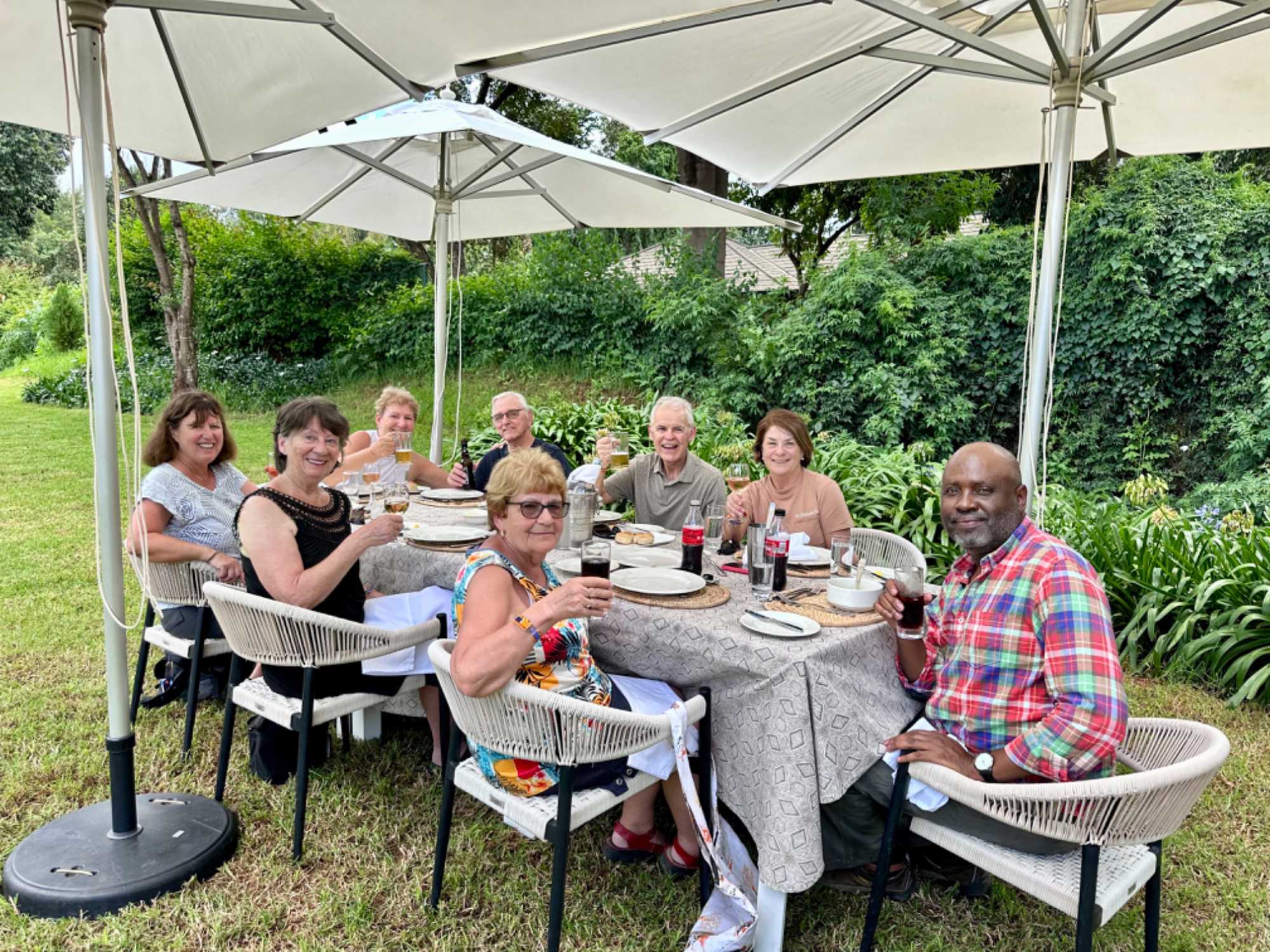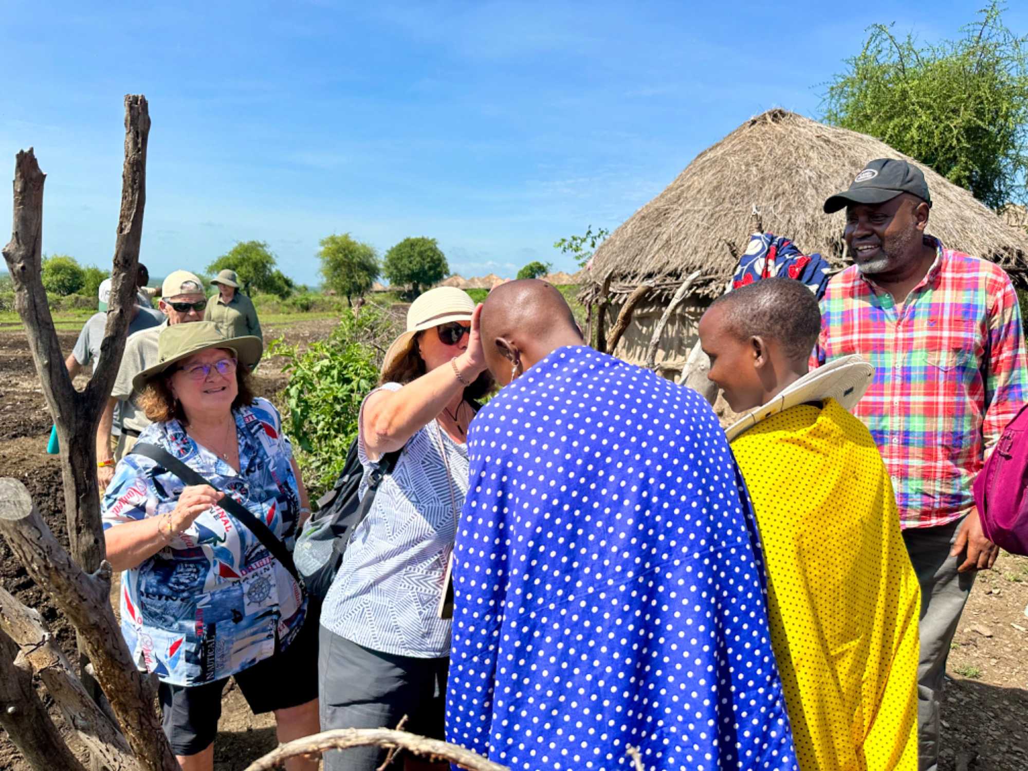 L’expérience m’a démontré au cours des années qu’un tel voyage d’aventure nécessite de réserver quelques moments de détente pour reprendre notre souffle. Nous avons donc donner le choix à mes voyageurs. Celui de profiter d'une matinée tranquille au lodge ou bien de se joindre à ceux qui voulaient découvrir un village Maasaï authentique. Comme notre fournisseur est un maasaï et qui connaît certaines communautés de la région ayant de la famille, il nous a proposé une visite authentique du village d’un membre de la famille. Nous étions donc 13 personnes qui sont venus vivre cette expérience. Le village était situé à environ 1 heure de notre lodge mais la route pour s’y rendre était tout simplement superbe tout comme la température et le ciel bleu. En passant nous sommes au jour 10 et le soleil est des nôtres depuis le début du voyage pour notre grand bonheur. Nous arrivons donc au village et nous sommes accueillis par le chef du village et sa tante. On nous explique la vie de la communauté, la circoncision chez les jeunes Maasaï à l’âge de 14 à 16 ans et surtout le rituel de ce moment bien important pour les hommes. Nous visitons une habitation pour une famille dans toute sa simplicité. On nous parle de leur vie et de leur coutume. Comme c’est intéressant et instructif pour nous. Ils sont très ouverts et nous pouvons leur poser toutes les questions que nous désirons. Les enfants sont si beaux tout comme les jeunes mamans et les jeunes hommes. C’est un beau peuple pacifique et adorable. Nous sommes si bien accueillis parmi eux et l’on nous fait une démonstration de danses faites par les femmes. Le temps passe bien vite et nous nous rendons dans la colline pour aller à la rencontre des hommes Maasaï qui nous attendaient pour partager un BBQ fait de chèvre pour y goûter. Après ces moments de découvertes nous retournons à notre lodge pour le lunch. Nous retrouvons autour de la piscine nos autres voyageurs et pour notre grand bonheur, les tables pour le lunch sont installées dans les jardins autour de la piscine. Un décor de rêve nous attendait et la température était parfaite avec une belle brise. Comme le dit Carole : « J’aime me faire caresser par le vent qui est mon amant. Quel beau moment nous avons passé tous ensemble en partageant cet excellent repas accompagné d’un excellent vin rosé sud-africain.