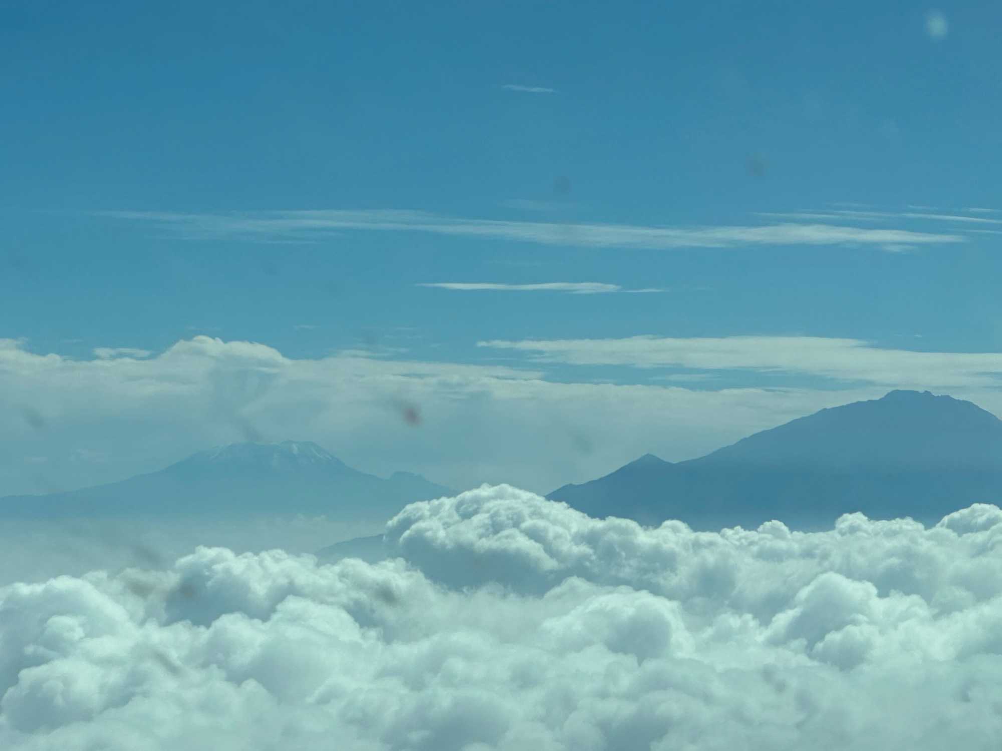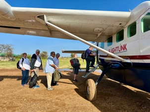 Après avoir dit au revoir à ce paysage époustouflant, nous prenons la route vers l'aéroport pour notre vol. Il s’agit d’un petit aéroport de brousse et il est surprenant que tout soit si simple. Même pas besoin de montrer nos passeports et nous embarquons directement sur la piste dans deux petits avions de 13 places chacun. J’ai même la chance de m’asseoir à côté du pilote pour ce court vol d’une heure vers Arusha où nous changerons d’appareil en marchant toujours sur la piste. Nous profitons au décollage de la vue panoramique sur les plaines du Serengeti. Ce parc national restera à jamais gravé dans nos mémoires comme l'un des endroits les plus extraordinaires que nous ayons jamais visités. Un survol très agréable surtout que le temps est clair. J’ai pu photographier le mont Méru et le Kilimandjaro à l’approche d’Arusha. Nous avons aussi vu le cratère du Ngorongoro du haut des airs, ce fût magnifique de voir toutes les montagnes et aussi la migration.