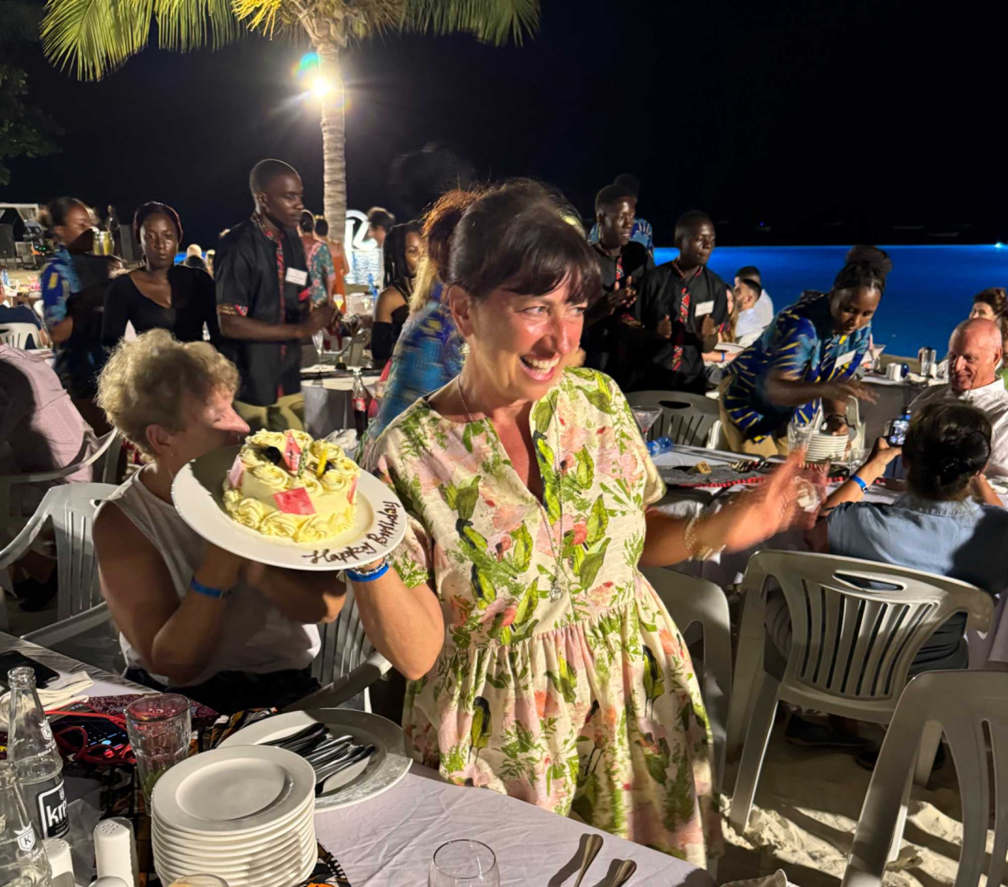 Pour conclure cette journée de rêve à Zanzibar, nous nous rejoignons pour l’apéro et pour notre dernier souper de groupe qui ce soir sera fêté en grand dans ce beau complexe. Les employés se sont activés toute la journée pour préparer les tables près de la mer pour un souper sous les étoiles afin de fêter la St-Valentin. Nous sommes émerveillés par le décor qu’ils ont crée pour nous. Nos tables nous attendent et le souper est digne d’une grande réception. Pour ceux qui aiment les fruits de mer, nous sommes servis royalement, les langoustes grillées devant nous sont tout simplement délicieuse. Le buffet est magnifique et exceptionnel de marcher les pieds dans le sable pour aller se servir. Le spectacle est aussi grandiose avec des prestations de danses, de chants et d’acrobatie. Ils n’ont rien négligé pour nous faire rêver et en plus c’est notre dernier souper. J’ai profité à nouveau de faire préparer deux gâteaux d’anniversaire, un pour Claude qui aujourd’hui a son anniversaire et un autre pour ma petite sœur Sophie qui fêtera prochainement aussi sa fête. Je voulais souligner son anniversaire avec tout le groupe qui l’apprécie beaucoup tout comme moi sa grande sœur. Merci ma petite sœur de venir égayer mes voyages et de me permettre de partager du si bon temps toutes les deux. Merci aussi pour les superbes photos que tu nous partages et pour tes recommandations photographiques que je mettrai encore en pratique durant les futurs voyages. Toutes les deux nous faisons un super team!
