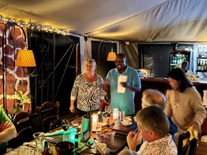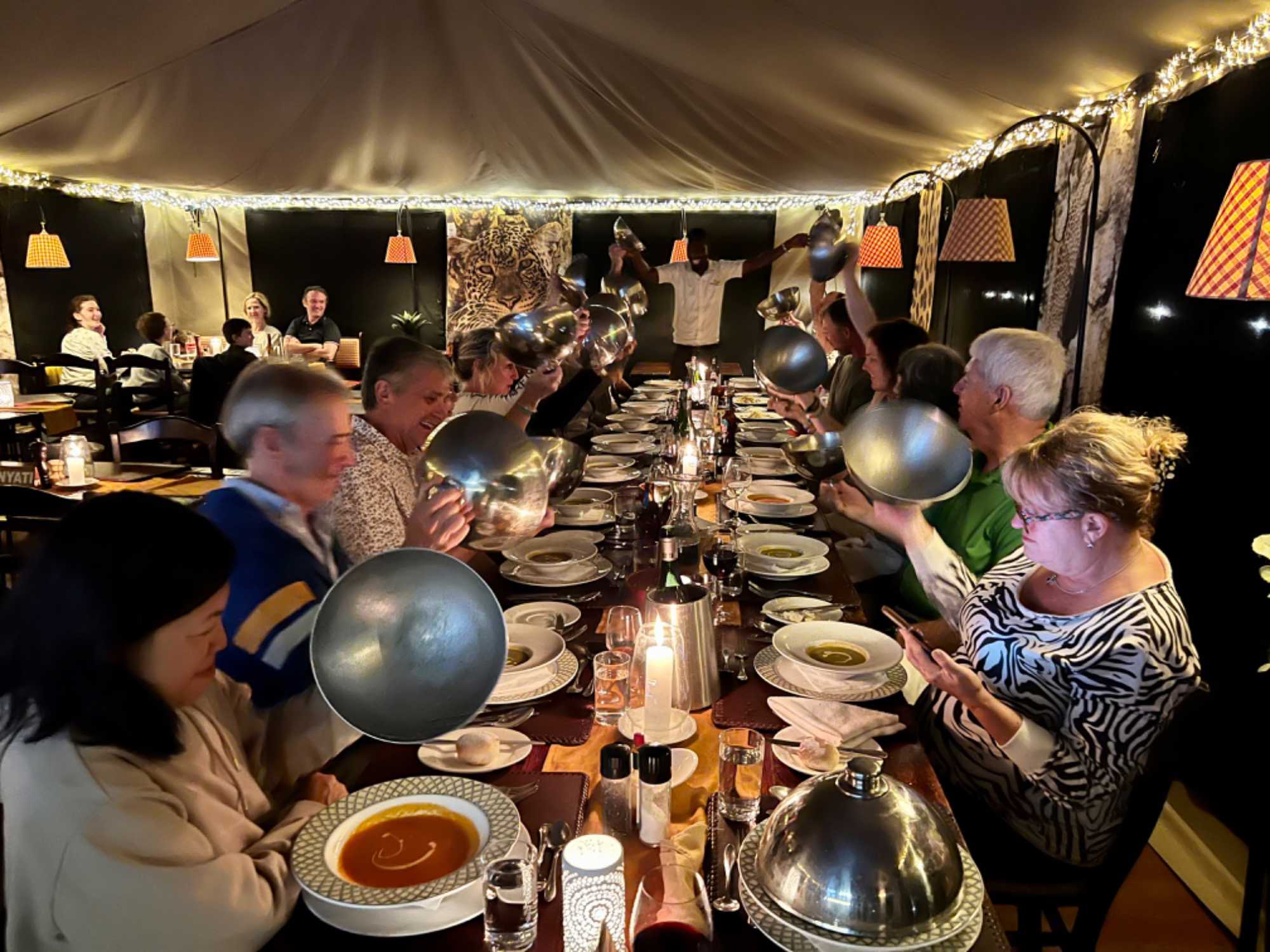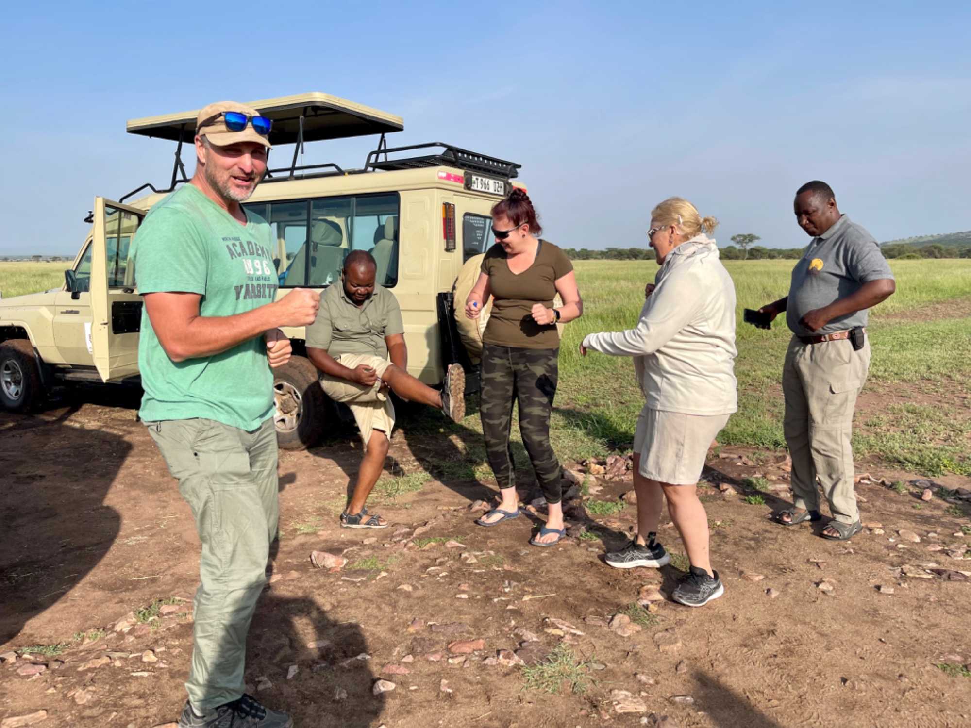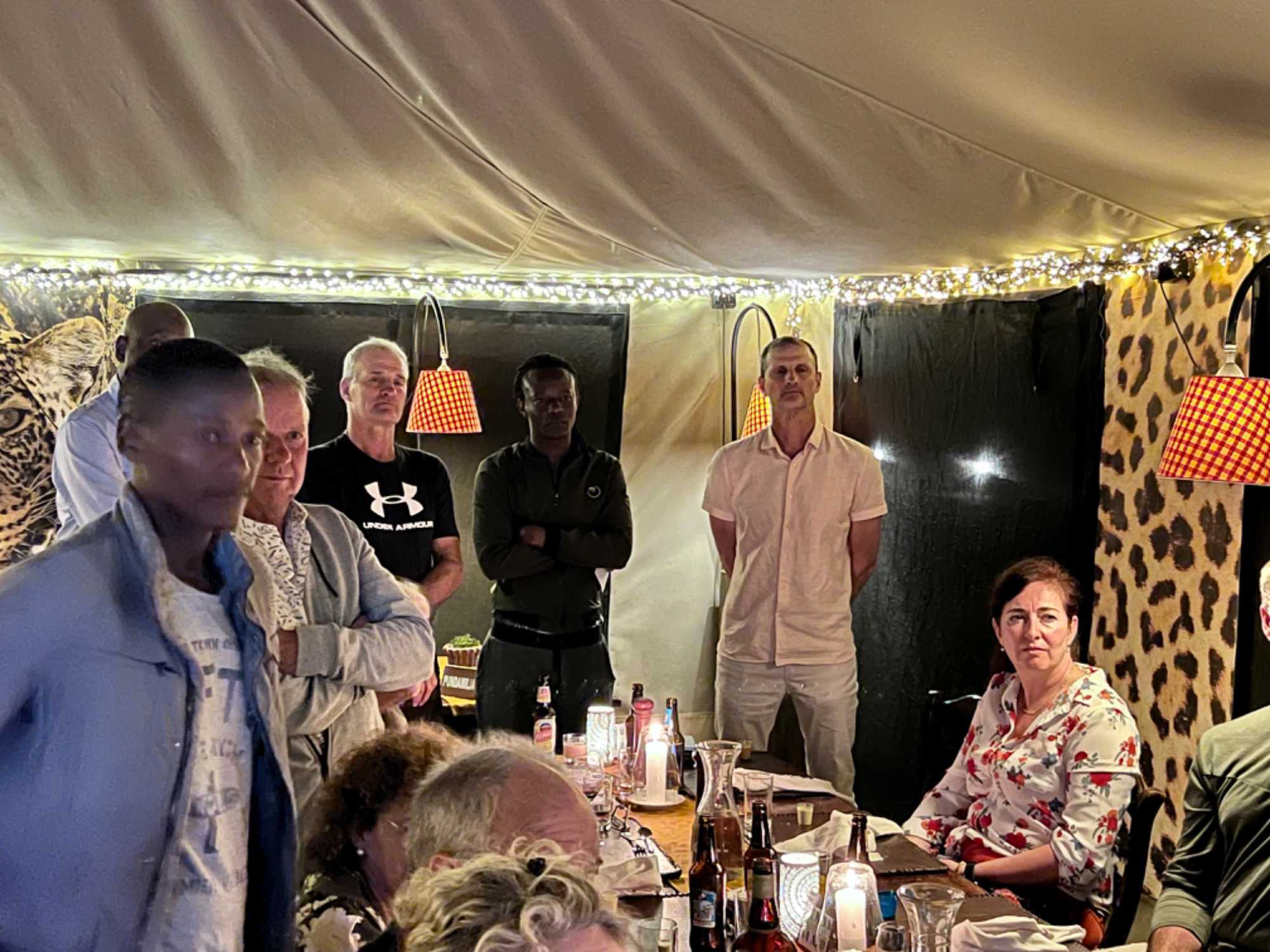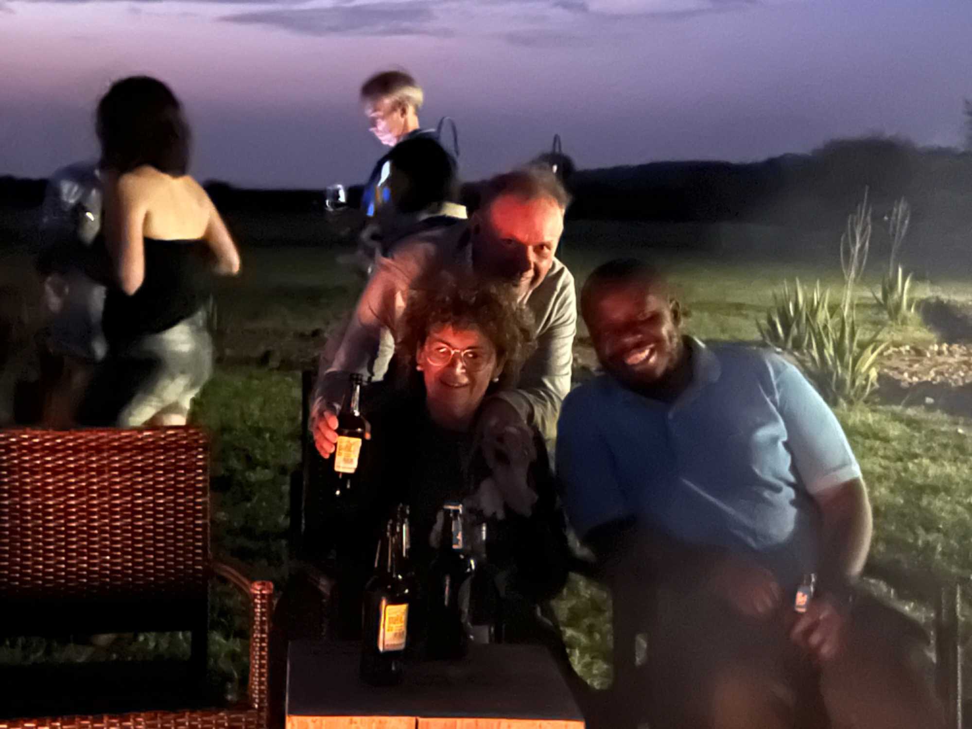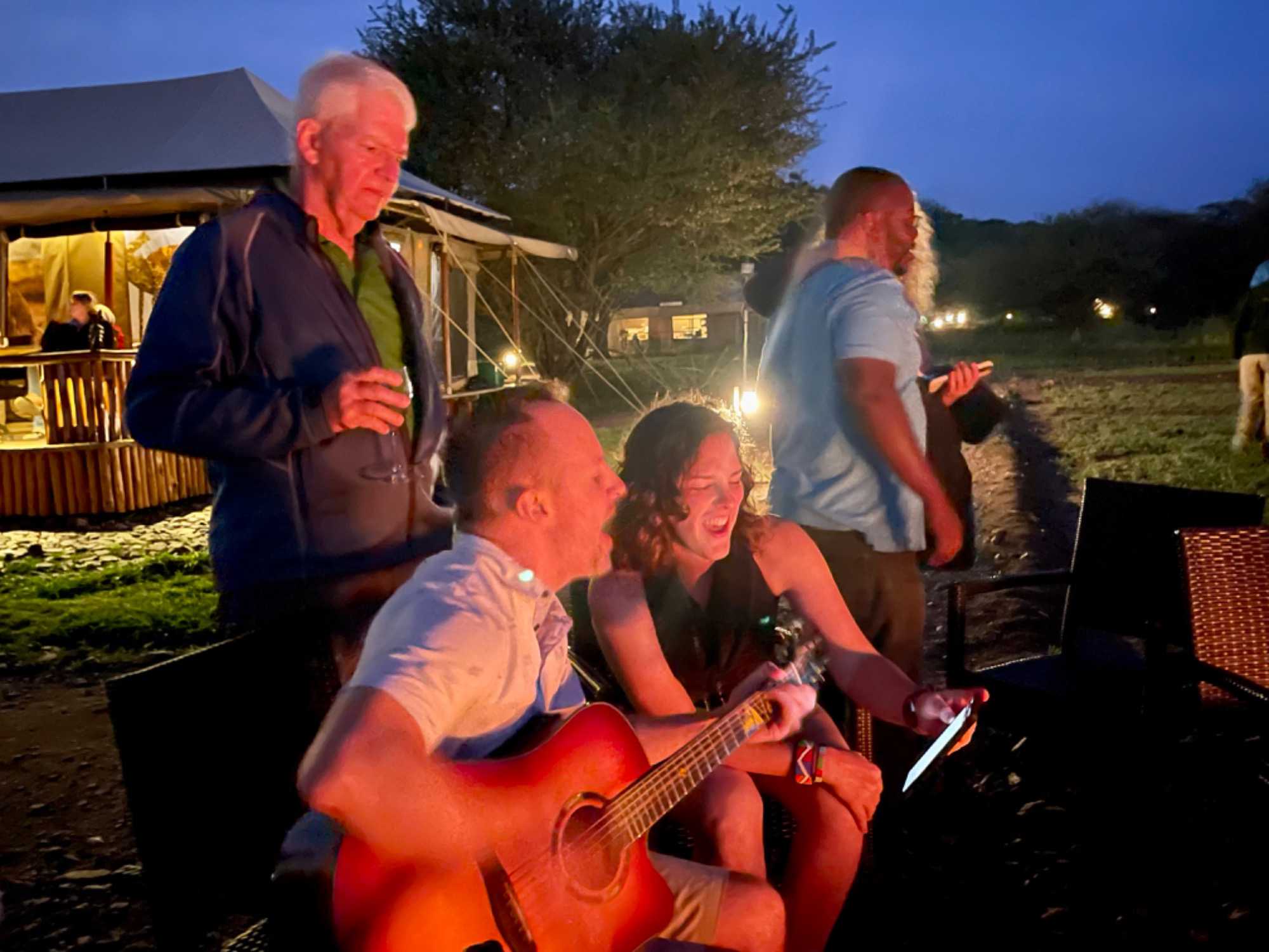 Nous avons poursuivi notre journée avec à nouveau de belles découvertes que celles des léopards. Un peu plus loin, on y observe une maman léopard couchée sur une branche avec ses petits bébés qui s’amusent à marcher sur celle-ci. Les paysages rocheux du Serengeti sont des endroits favoris pour les léopards. Nous sommes comblés, les big five ont tous été vus durant notre voyage. De retour au lodge pour un peu de repos avant de se retrouver autour du feu de camp pour l’apéro. Michael et Félicia nous accompagnent en chansons et musique. Que demander de plus! Des moments magiques accompagnés du ciel d’Afrique que j’aime tant photographier. Une autre magnifique soirée ou nous profitons de notre délicieux souper pour remercier nos excellents guides, Mandela, Obama, Fidélis et Alex et aussi le propriétaire de la compagnie qui nous accompagnait depuis le début, Onesmo. Nous avions eu le bonheur de le rencontrer avec le groupe au Québec en novembre dernier et comme il voyait que nous serions un groupe bien amusant, il en a profité pour venir à nouveau faire le voyage et revoir ses amis responsables des lodges. Nous étions bien entourés avec tout ce beau monde pour découvrir la Tanzanie. Merci infiniment à vous 5 de nous avoir fait vivre les plus moments en Tanzanie.