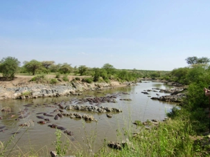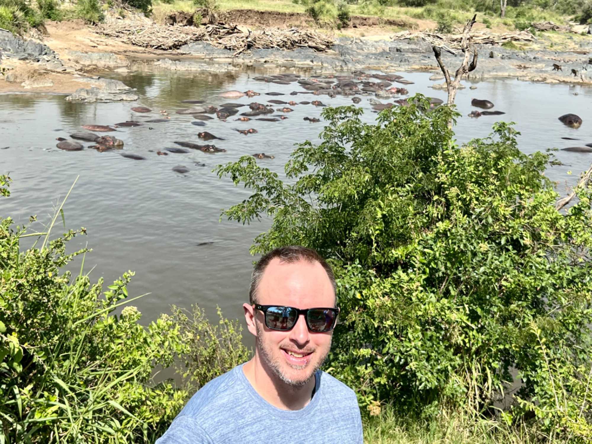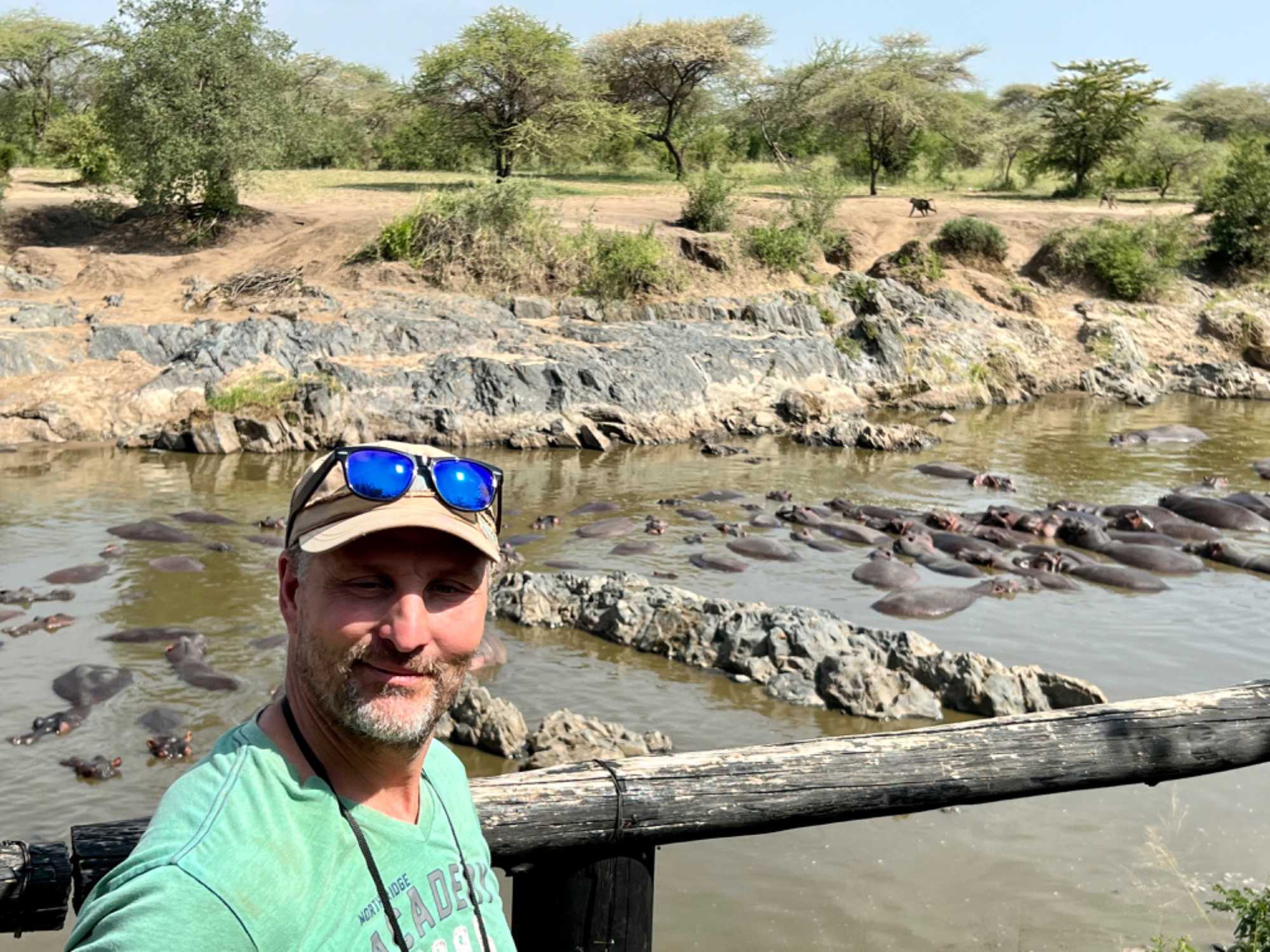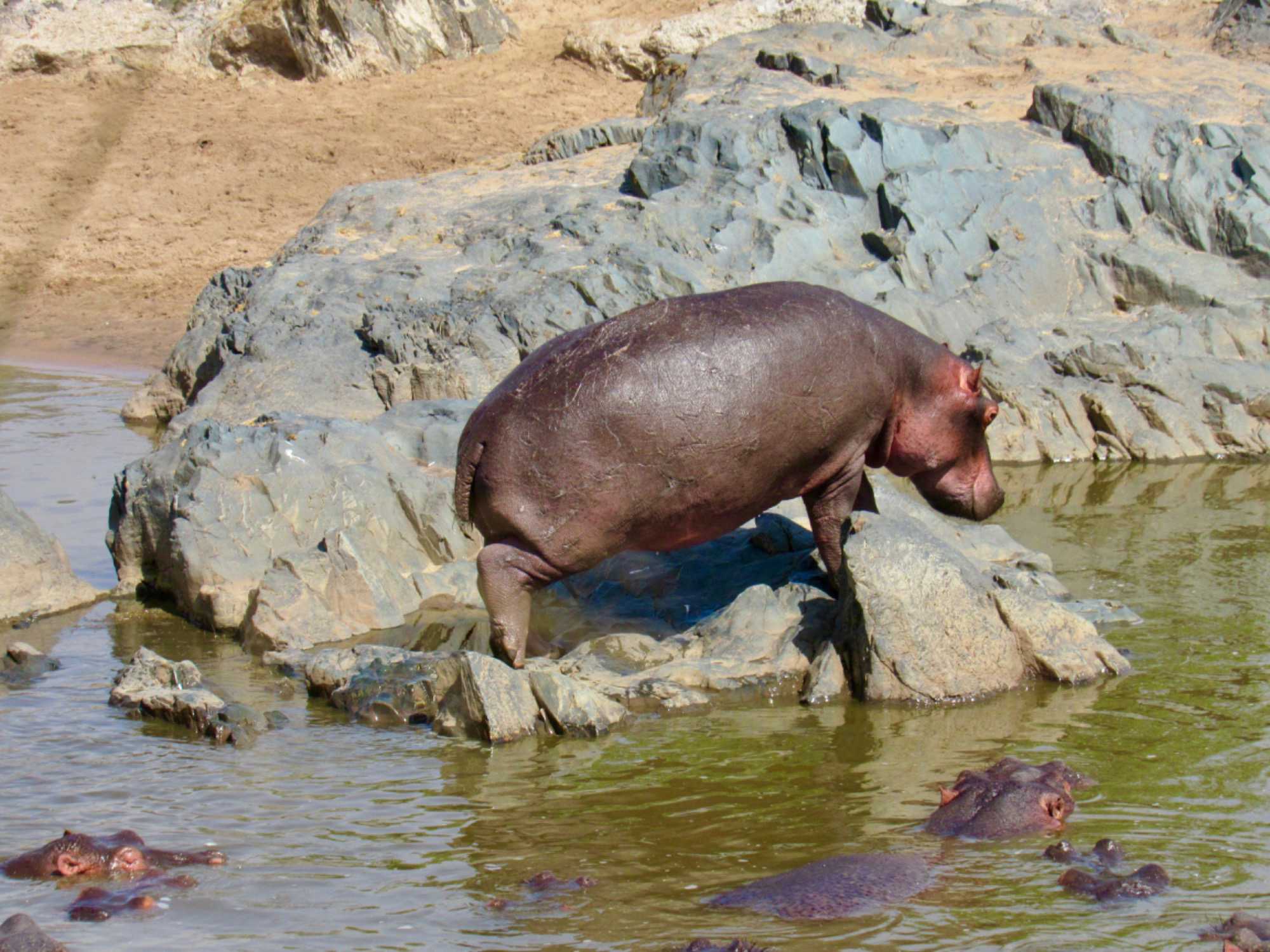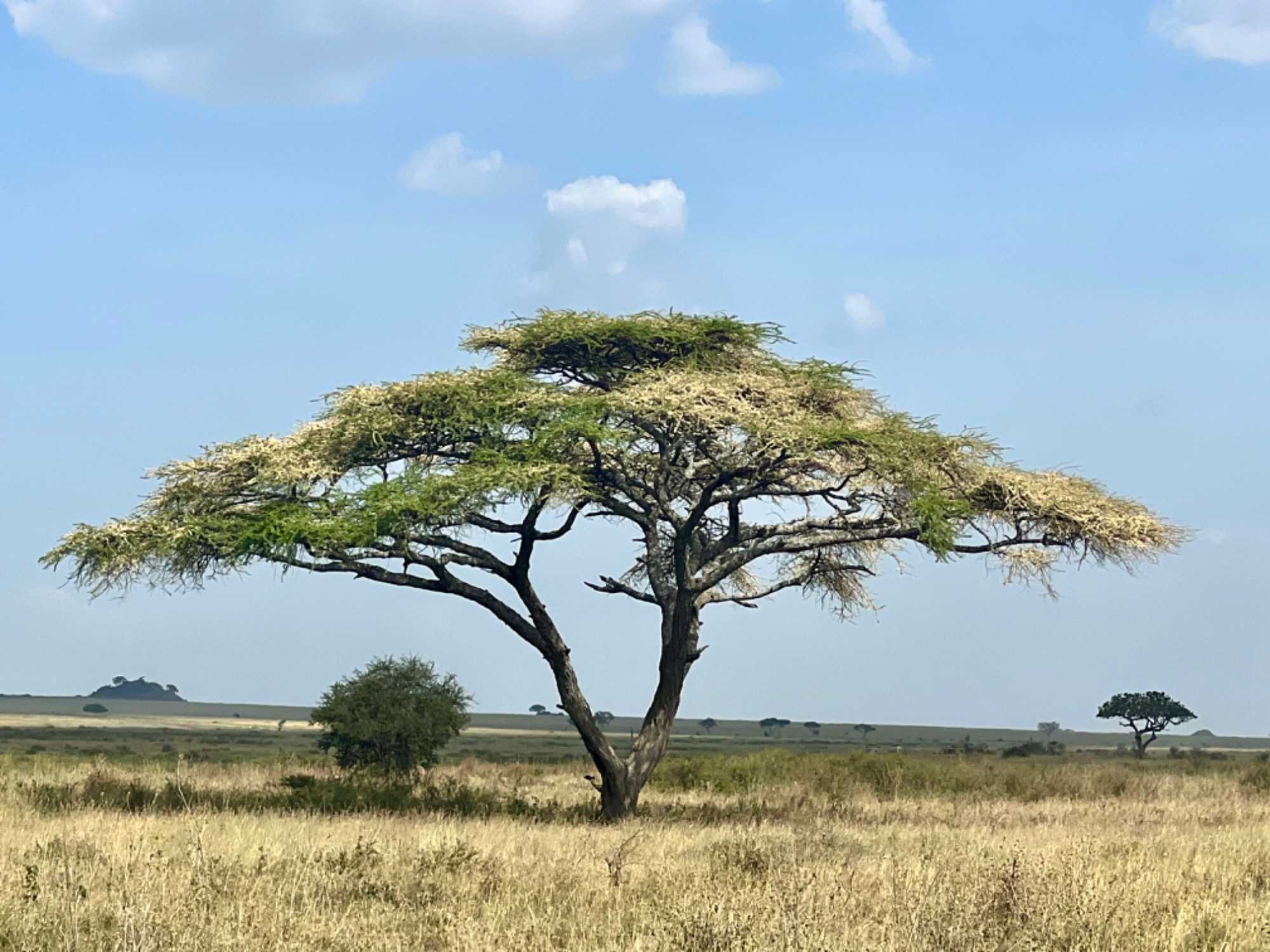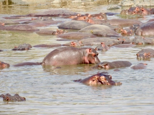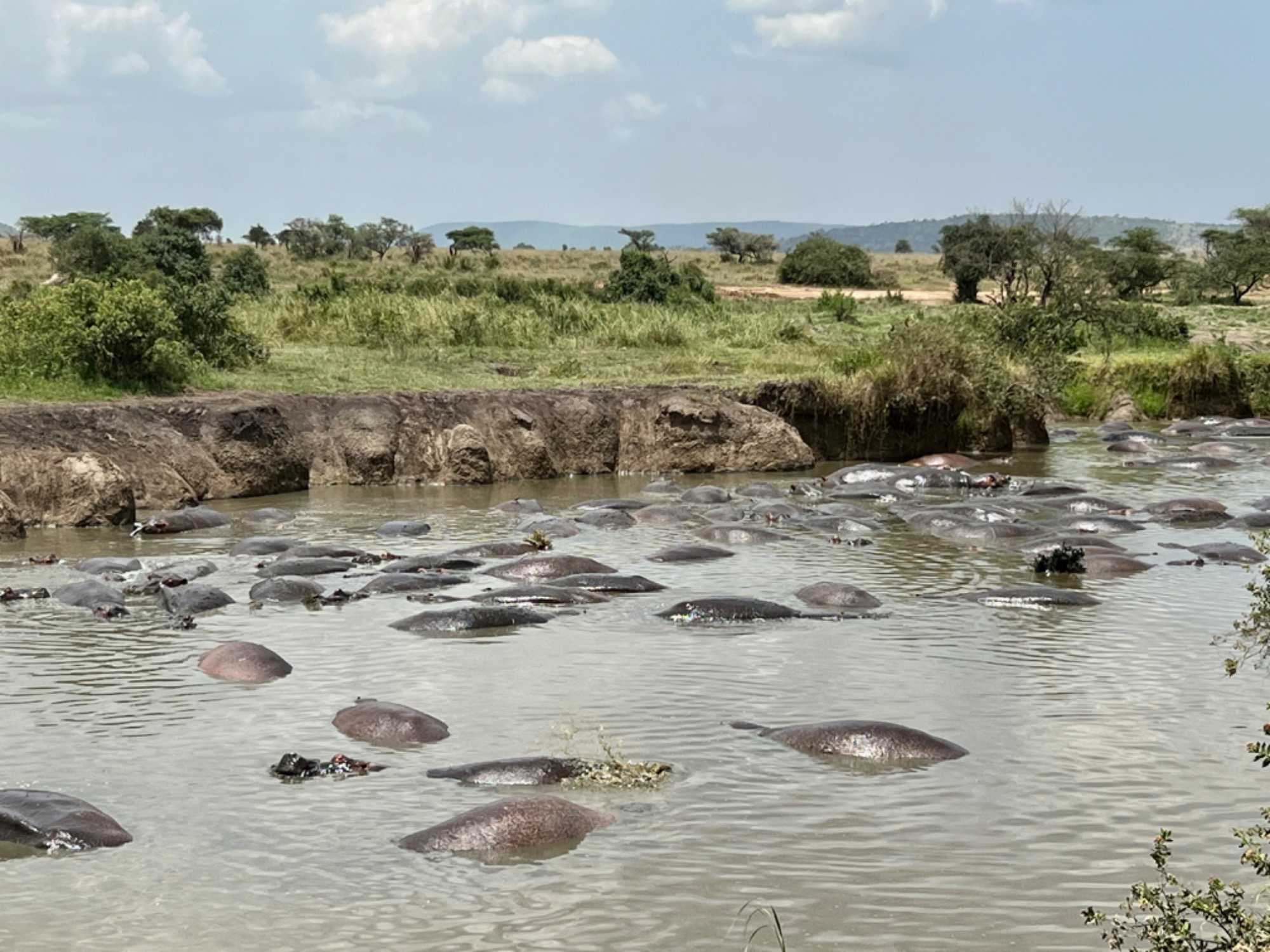 Maintenant venu le temps de quitter pour la découverte du parc en safari. Nous voilà partis à la découverte de cette faune. La magnifique journée d’hier nous a créé un peu de pression…mais comme les jours se suivent mais ne se ressemblent pas, le territoire que nous parcourons ne nous offre pas d’autre choix que constater qu’il y a moins d’activité. C’est beaucoup plus tranquille. Mais c’est la nature et c’est comme cela les safaris. Comme dit notre guide, un safari, c’est comme une boite de chocolat! Nous parcourons plusieurs kilomètres, sans trop voir d’animaux, dans le sens qu’on y rencontre des animaux, comme les gazelles, girafes, phacochères, zèbres, quelques gnous…et après quelques heures nous arrivons sur un plan de vue avec une baignoire remplie d’hippopotames. Tout un spectacle de les voir se rafraîchir collés les uns contre les autres. Nous surveillons les mouvements en quête de la meilleure photo. Notre guide nous mentionne qu’un hippopotame peut ouvrir la gueule d’environ 1 mètres d’ouverture. Et peut croquer et séparer en deux un crocodile qui serait sur son passage. Ce sont les animaux les plus dangereux de la savane. Nous profitons de notre déplacement aujourd’hui pour photographier les magnifiques acacias d’Afrique. Ils ont environ 70 sortes juste en Afrique. Plusieurs sont en fleurs à ce moment, nourriture appréciée des petits singes. Ces arbres sont si beaux et ajoutent au décor féérique des savanes africaines.