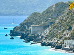 Nous avons aussi appris sur l’industrie de la Pierre Ponce de Lipari. Ce produit volcanique : la pierre ponce, est une variété poreuse de l’obsidienne, dont elle a la même composition ; elle a une couleur gris blanchâtre et est très légère à tel point qu’elle flotte sur l’eau. Dans la préhistoire, elle était utilisée comme pierre abrasive sur laquelle on polissait les ustensiles. Aujourd’hui, elle est utilisée comme abrasif industriel, comme matériel de construction et comme isolant acoustique. Les grandes carrières de pierre ponce qui ont éventré et blanchi les flancs du Mont Pelato ont fourni du travail à des générations de Liparotes, mais l’extraction a pris fin en début des année 2000. L’on découvre les carrières de pierre ponce qui ont entre autres fait la richesse de l’île. Ces carrières, issues des coulées volcaniques, ont été exploitées jusqu’à il y a une dizaine d’années, date à laquelle l’UNESCO a classé les îles Éoliennes. Il en résulte un sentiment d’abandon sur le champ des différentes installations. C’est aussi sur ce même site, en contrebas de la route que l’on trouve la plus jolie plage de l’île, sablonneuse et dont les fonds sont saupoudrés de poussière de ponce. L’on se retrouve donc avec des eaux turquoise là où partout ailleurs la profondeur importante des fonds rend l’eau des Éoliennes très sombre.