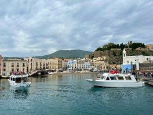 Nous nous levons ce matin avec l’espoir de faire notre balade en mer vers les îles de Panarea et de Stromboli. La température est de notre bord ce matin et notre sortie en mer sera réalisable. Nous sommes bien heureux car pour plusieurs comme moi pouvoir aller sur le volcan Stromboli est un rêve. Le soleil est au rendez-vous et il fait environ 18 degrés, ce qui est anormal pour la période mais c’est partout en Europe et même chez nous ce froid inhabituel. Nous sommes préparés pour faire notre journée en mer. Nous mangeons à notre restaurant sur le bord de la jetée et nous sommes prêts pour le départ prévu à 13h30. Dans la baie nous remarquons le magnifique navire de luxe de Scenic, l’Éclipse. Un navire haut de gamme qui passera la journée à Lipari. Nous quittons à bord de notre petit bateau pour notre expédition et notre premier arrêt sera pour la découverte de l’île de Panarea.