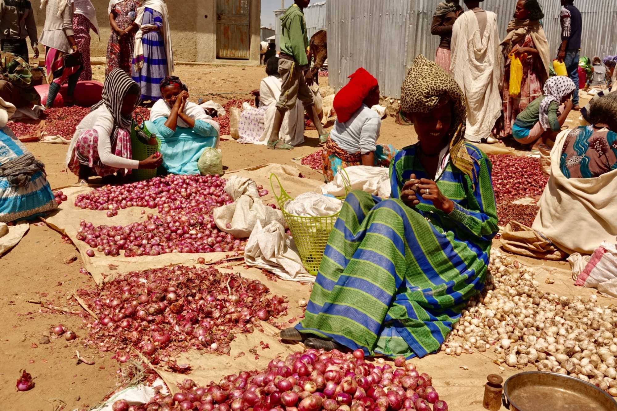 Par la suite, nous nous sommes dirigés vers le marché local de Hawzen (petite ville d’environ 5000 habitants). Heureusement pour nous, ce marché se tient tous les mercredis et samedis. Nous pouvons donc en profiter aujourd’hui mercredi. Nous sommes hors du temps en voyant ce marché. Les produits offerts par les gens assis par terre nous étonnent. La quantité d’oignons, d’ail, de piments ….. nous fascinent. On y vend des oeufs à l’unité!