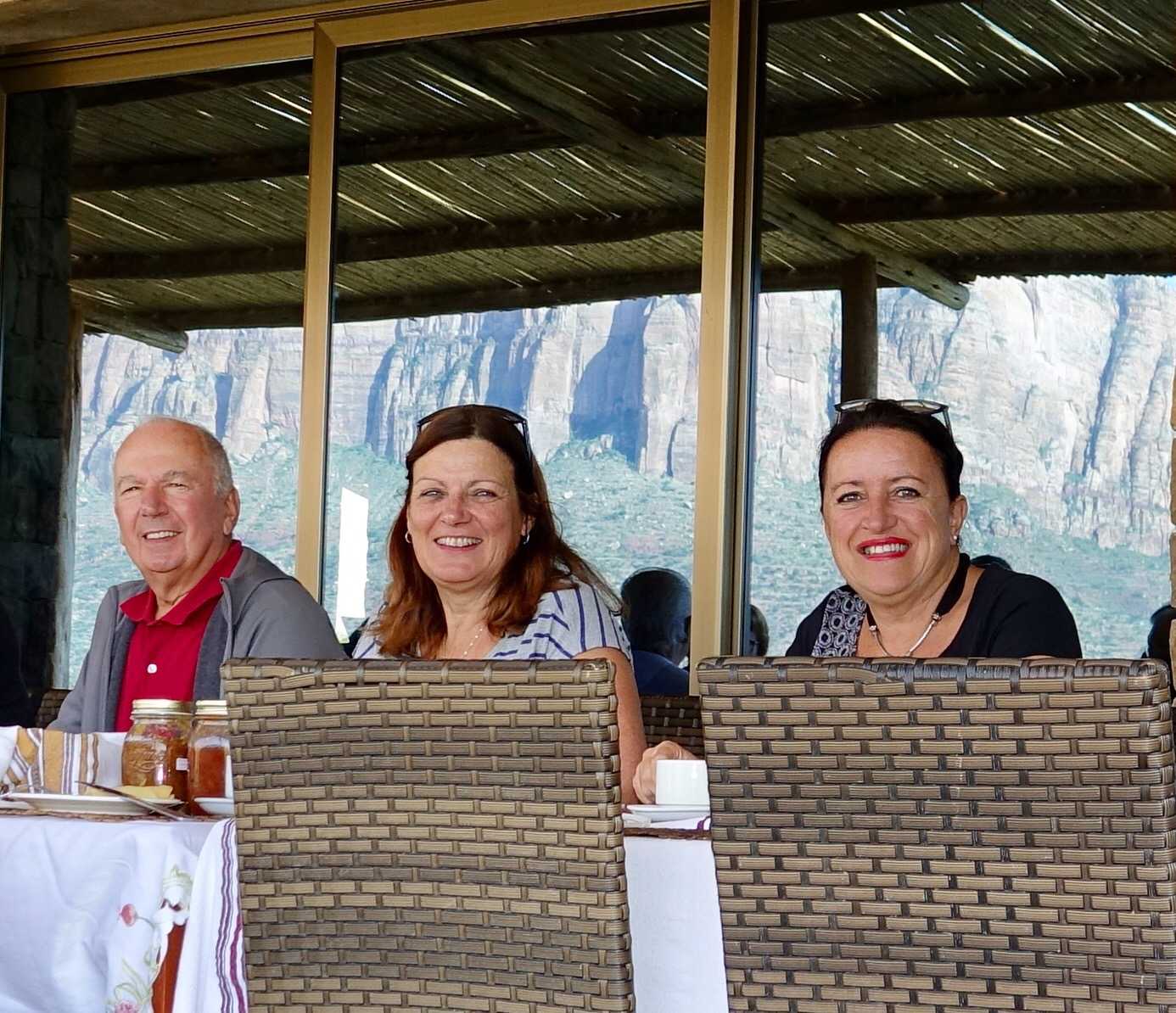 Après avoir profité du site ce matin, mes joyeux voyageurs se sont retrouvés sur la table extérieure pour partager le petit déjeuner avec nos hôtes, et le plaisir était au rendez-vous.