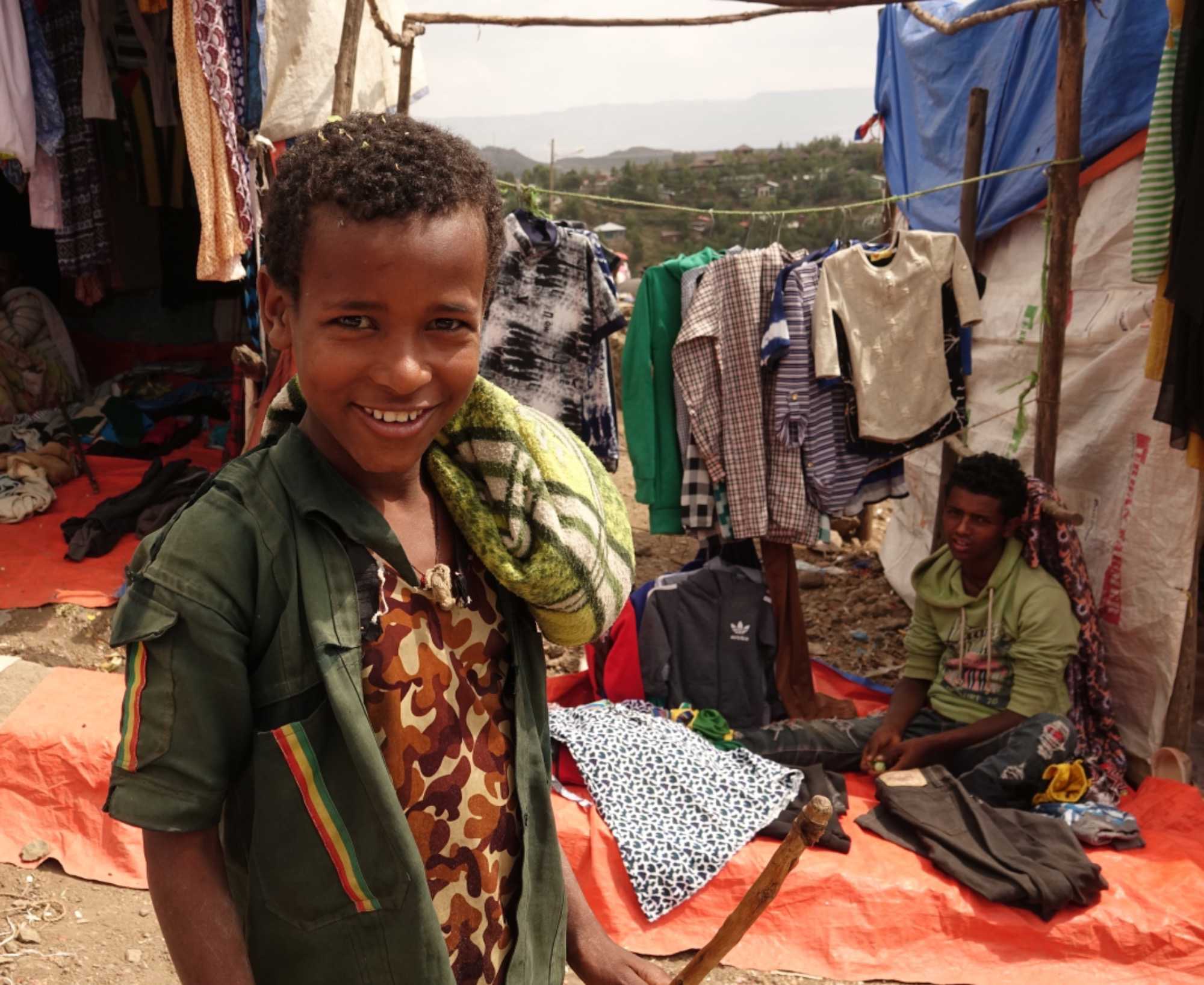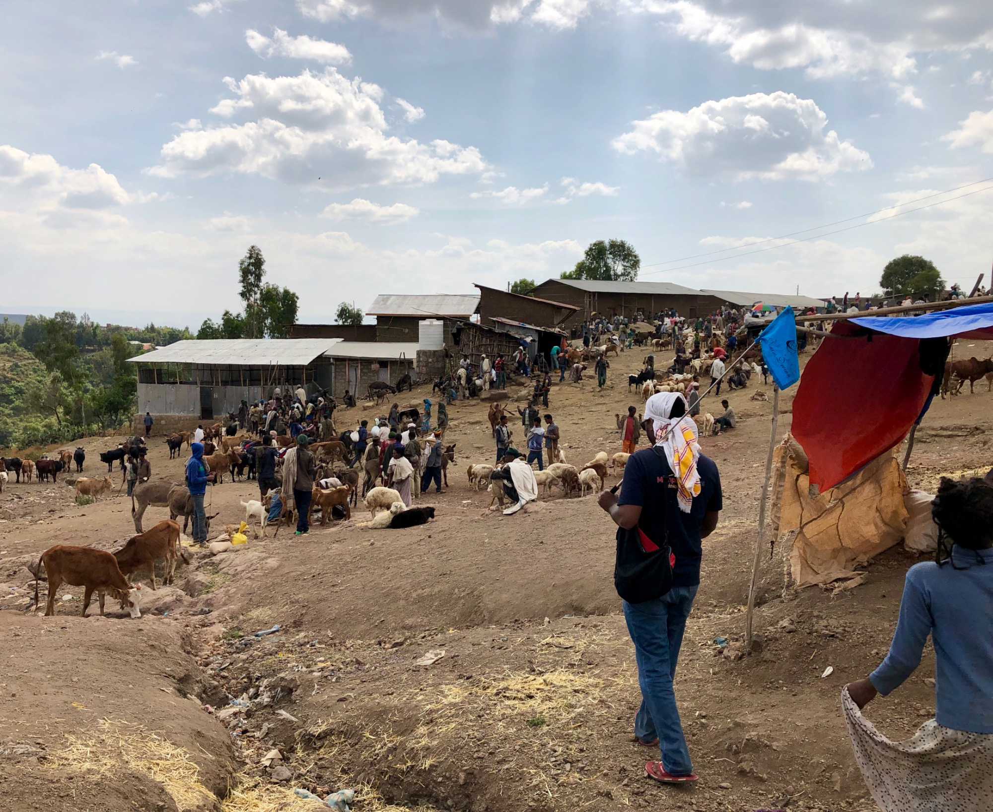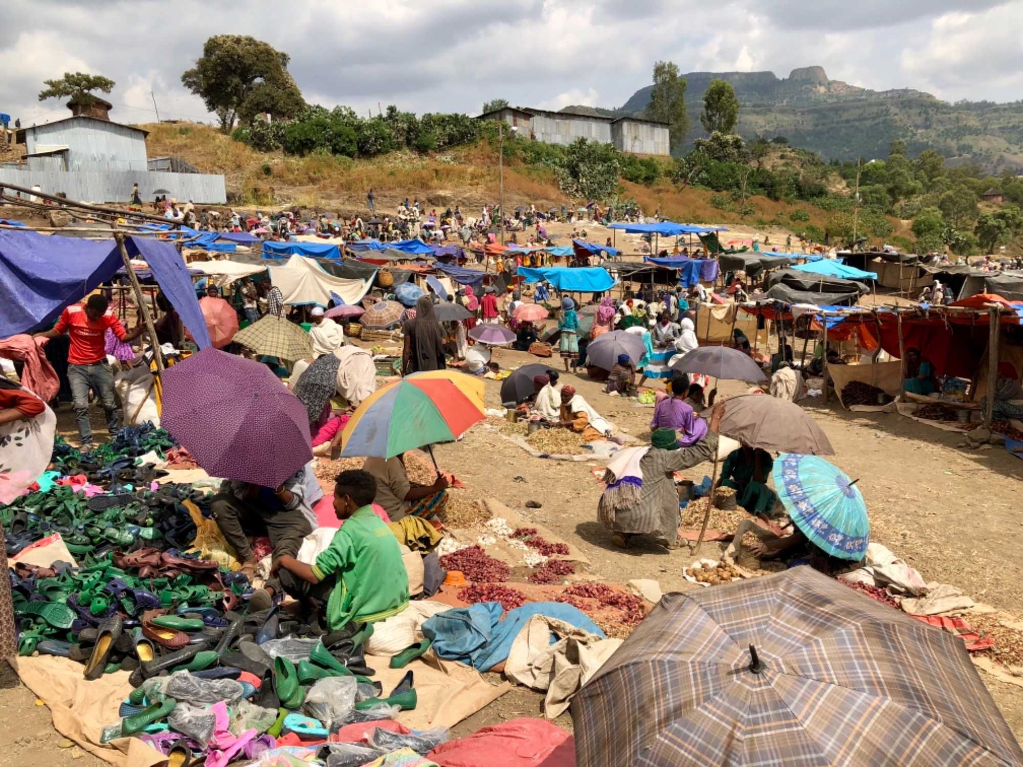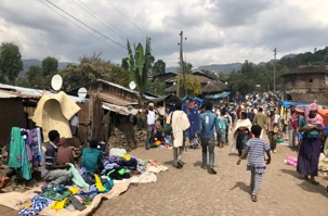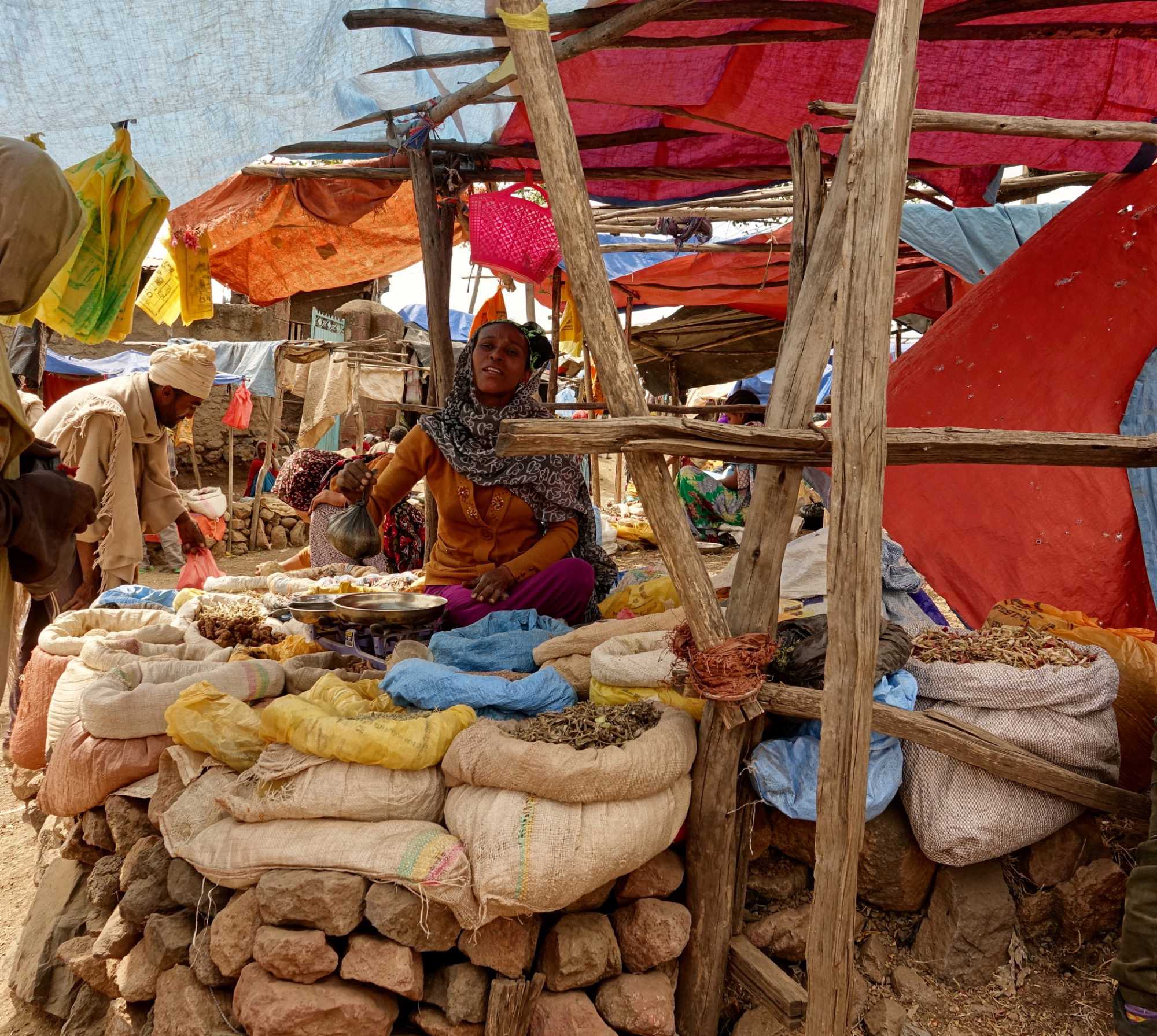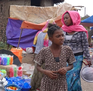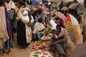 Au retour vers Lalibela, nous nous arrêtons au marché local. Une belle frénésie y existe et on voit différentes communautés y cohabiter (on le voit à leurs costumes différents). Nous déambulons avec notre guide à travers les étalages, les animaux, le peuple qui vend ou achète. C’est tout un bain de foule mais bien intéressant pour nous occidentaux. Les gens sont sympathiques et nous pouvons photographier plusieurs vendeurs ou vendeuses durant leur travail. Les enfants prennent plaisir à tenter de nous parler et cela nous amuse de les voir essayer de communiquer. Ils nous suivent comme des mouches par contre…. Il faut voir cela avec amusement. Quel plaisir nous avons à vivre ces beaux moments.