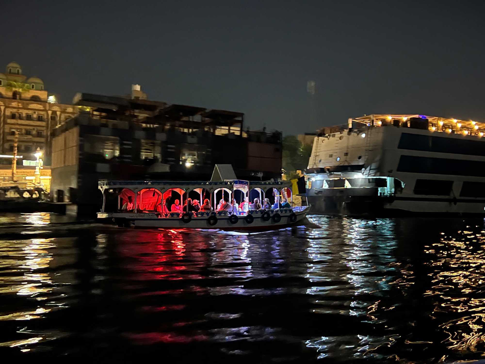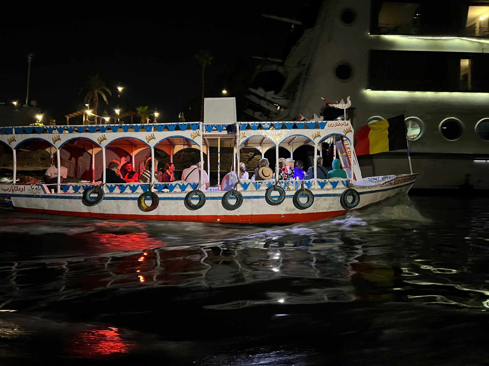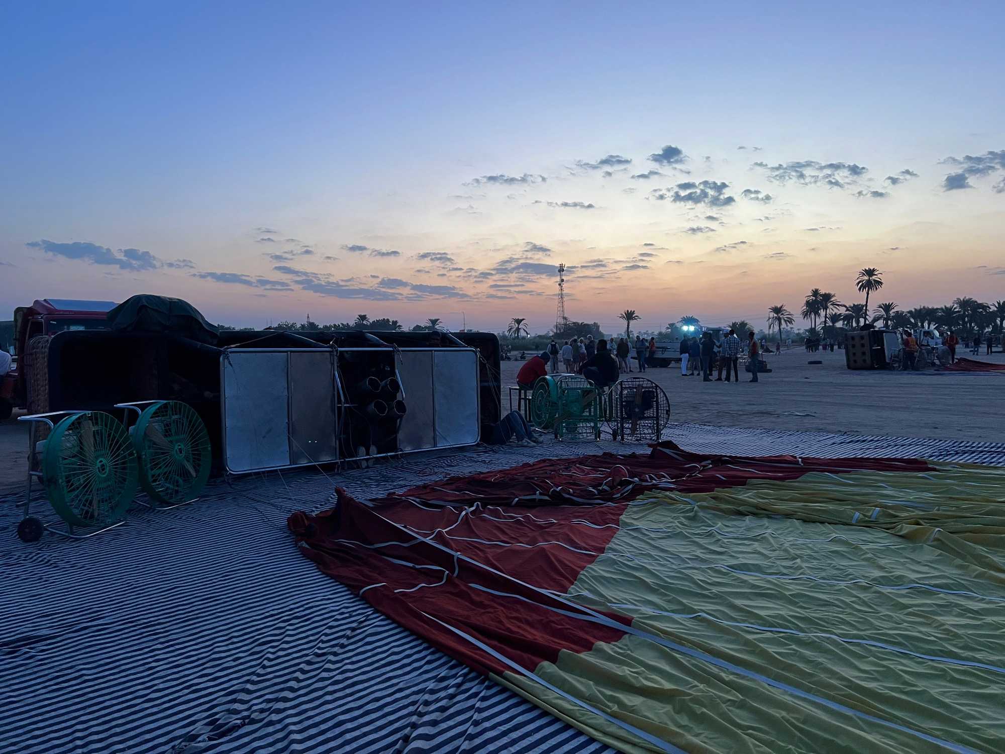 Nous sommes arrivés à Louxor un peu avant minuit. Nous sortons de notre navire à 4h25 du matin. Oui, oui, vous avez bien lu! C’est sûr que si on veut être en montgolfière au levé du soleil, il faut se lever bien avant! Alors, j’ai 24 joyeux lurons qui se joignent à moi pour cette excursion. Pour nous y rendre, nous prenons un minibus, suivi d’une barque pour traverser le Nil, suivi d’un autre petit trajet en minibus. Il y en a même qui se sont mis à chanter sur la barque à 5h du matin! Comme quoi tout le monde était excité de voler, même à cette heure!