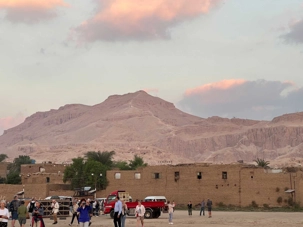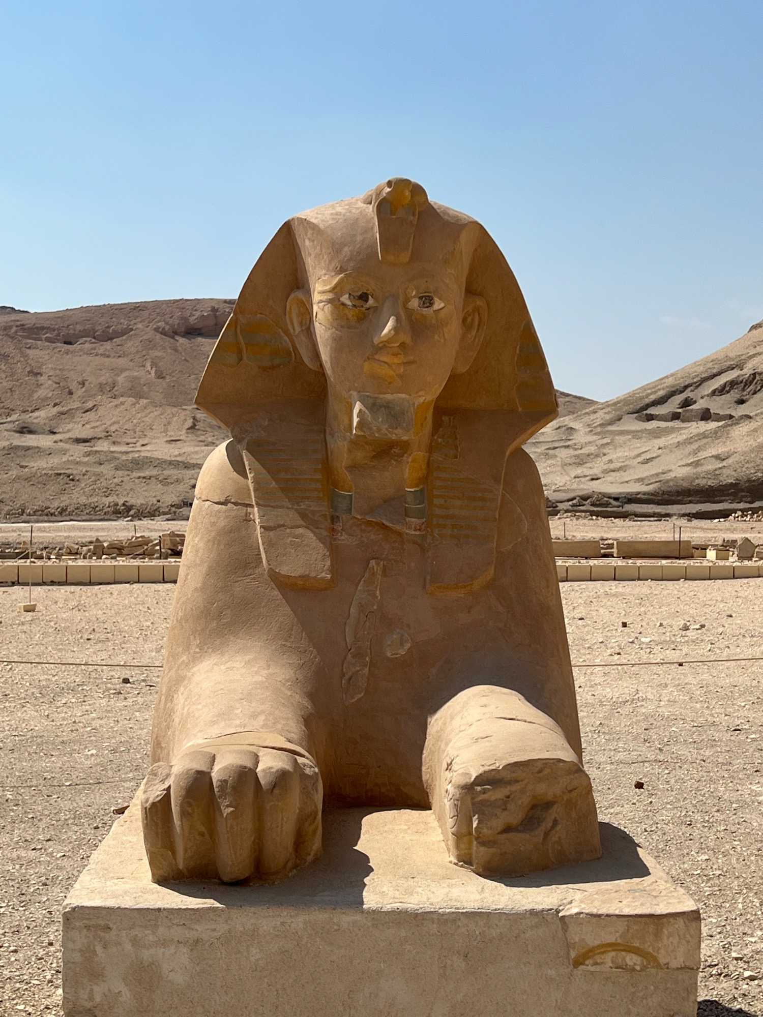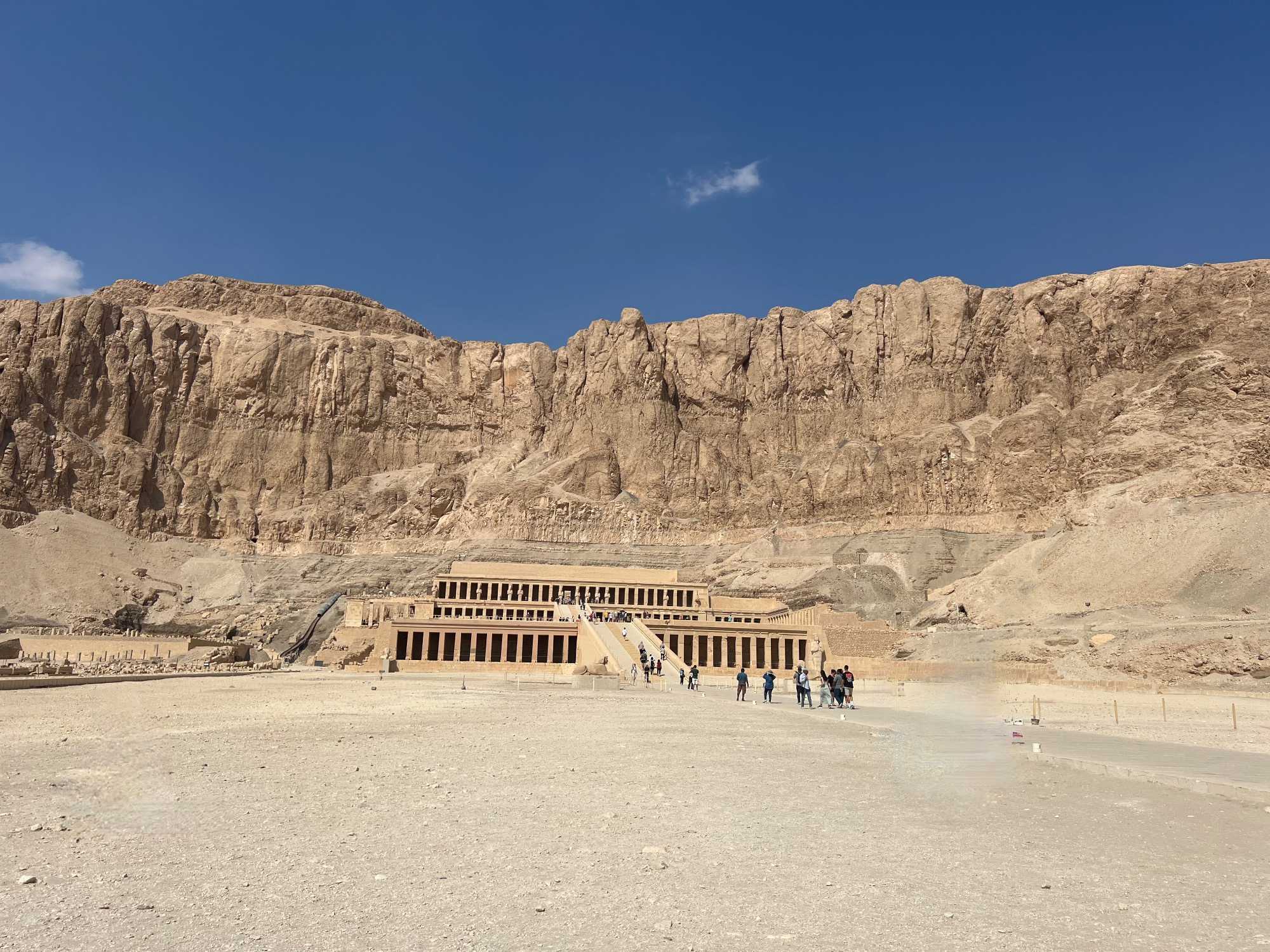Nous n’avons pas fini nos visites du jour! On poursuit avec le site exceptionnel de Deir el Bahari, temple funéraire de la reine Hatchepsout, la seule femme qui gouverna l’Égypte en Pharaon. Il est bien impressionnant ce temple vu de l’extérieur. Nous avons fait une visite de ce lieu avant de continuer vers la Vallée des Reines qui offre des tombeaux moins luxueux que ceux des pharaons mais les peintures offrent parfois beaucoup plus de vivacité. La chaleur et aussi la fatigue se fait sentir, alors nous visitons rapidement la tombe de Amen Khopshef (très très jolie) et celle de Titi.