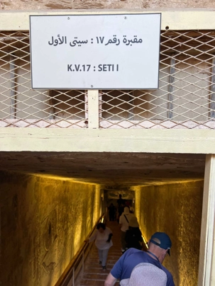 Par la suite, Hazem et moi avions gardé secret deux visites qui n’étaient pas au programme… C’est toute une surprise que nos voyageurs ont eu lorsque nous leur avons annoncé que nous avions des billets d’entrée spéciaux pour les tombeaux de Séti I (le plus beau des tombeaux de la Vallée) et de Toutânkhamon (un des rois les plus connus). Le tombeau de Séti I se mérite: nous avons plusieurs marches à descendre (et à remonter) pour nous rendre dans la salle funéraire. Mais ça en valait la peine! Tout le monde l’a fait. Encore une fois je dois dire que nous n’avions pas assez de mots pour décrire la beauté de ce tombeau. Les dessins et la qualité des couleurs conservées sont incroyables. Un monsieur qui était à l’intérieur nous disait que c’était le « paradis »! Ce qui était vraiment plaisant, c’est compte tenu que le billet pour cette visite est assez cher, il n’y avait pas beaucoup de touristes à l’intérieur. Nous étions presque notre seul groupe.