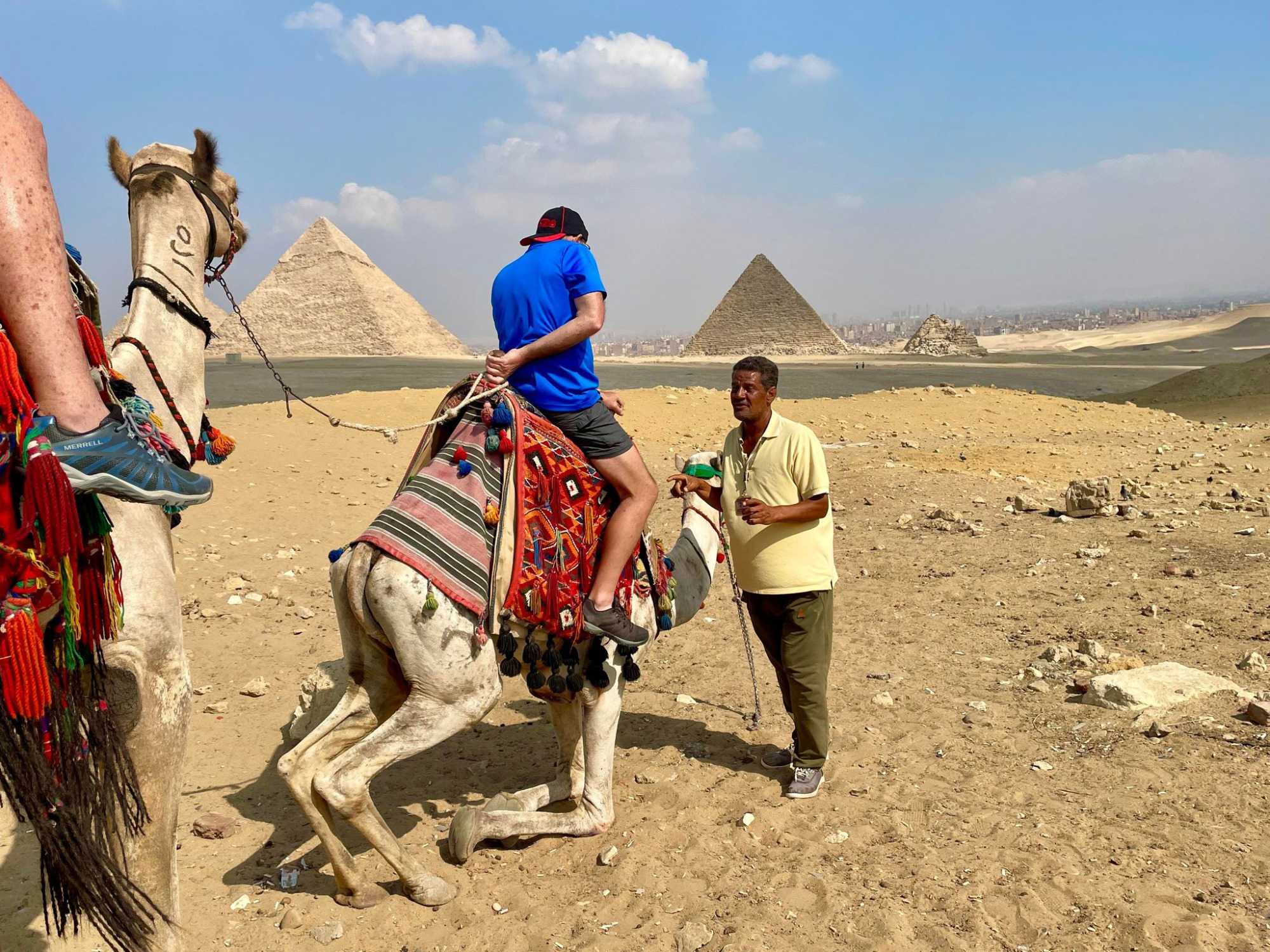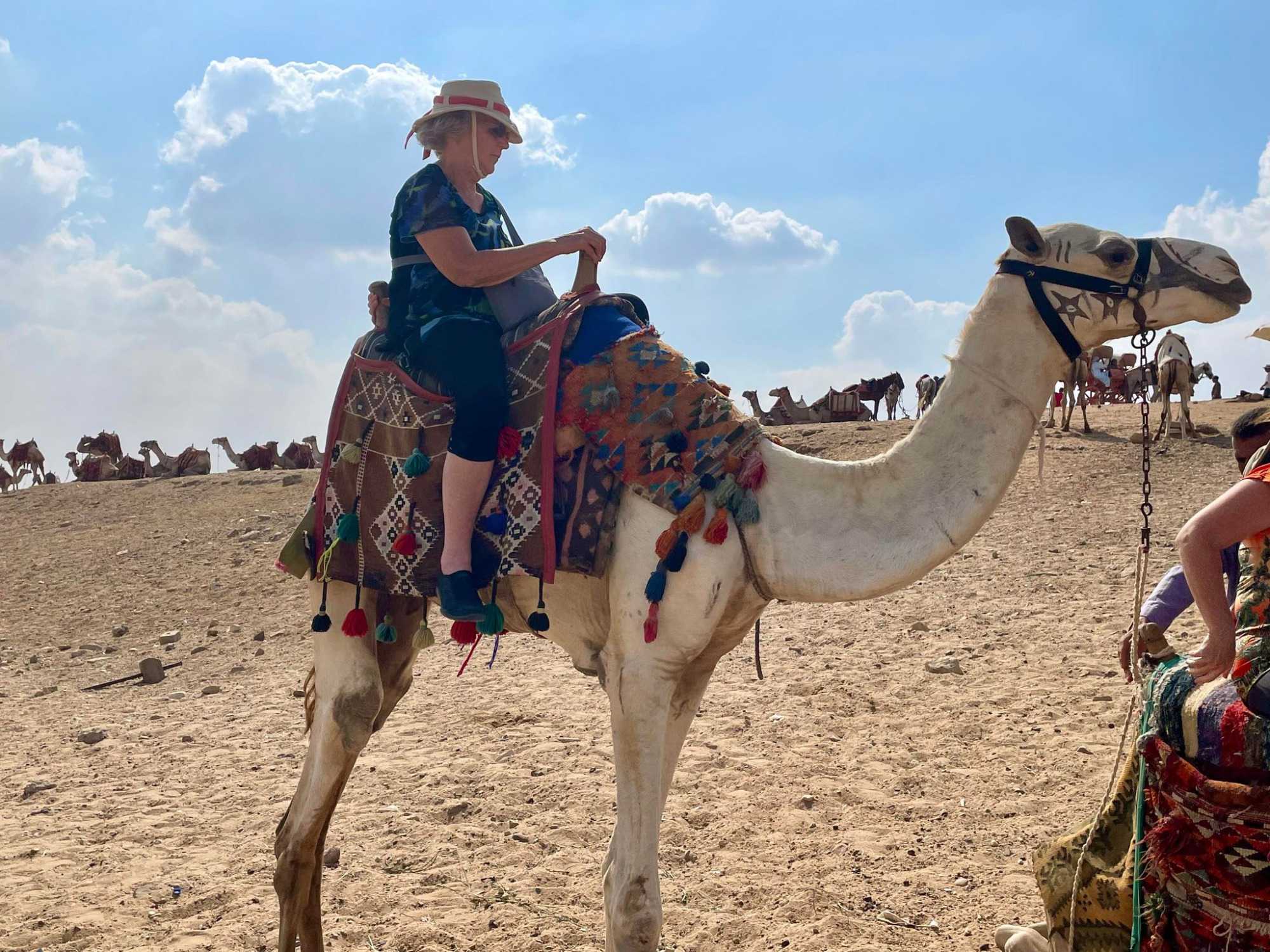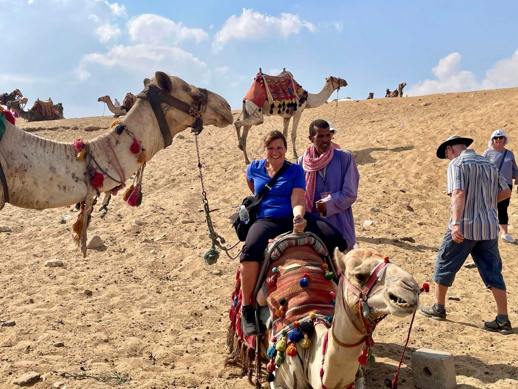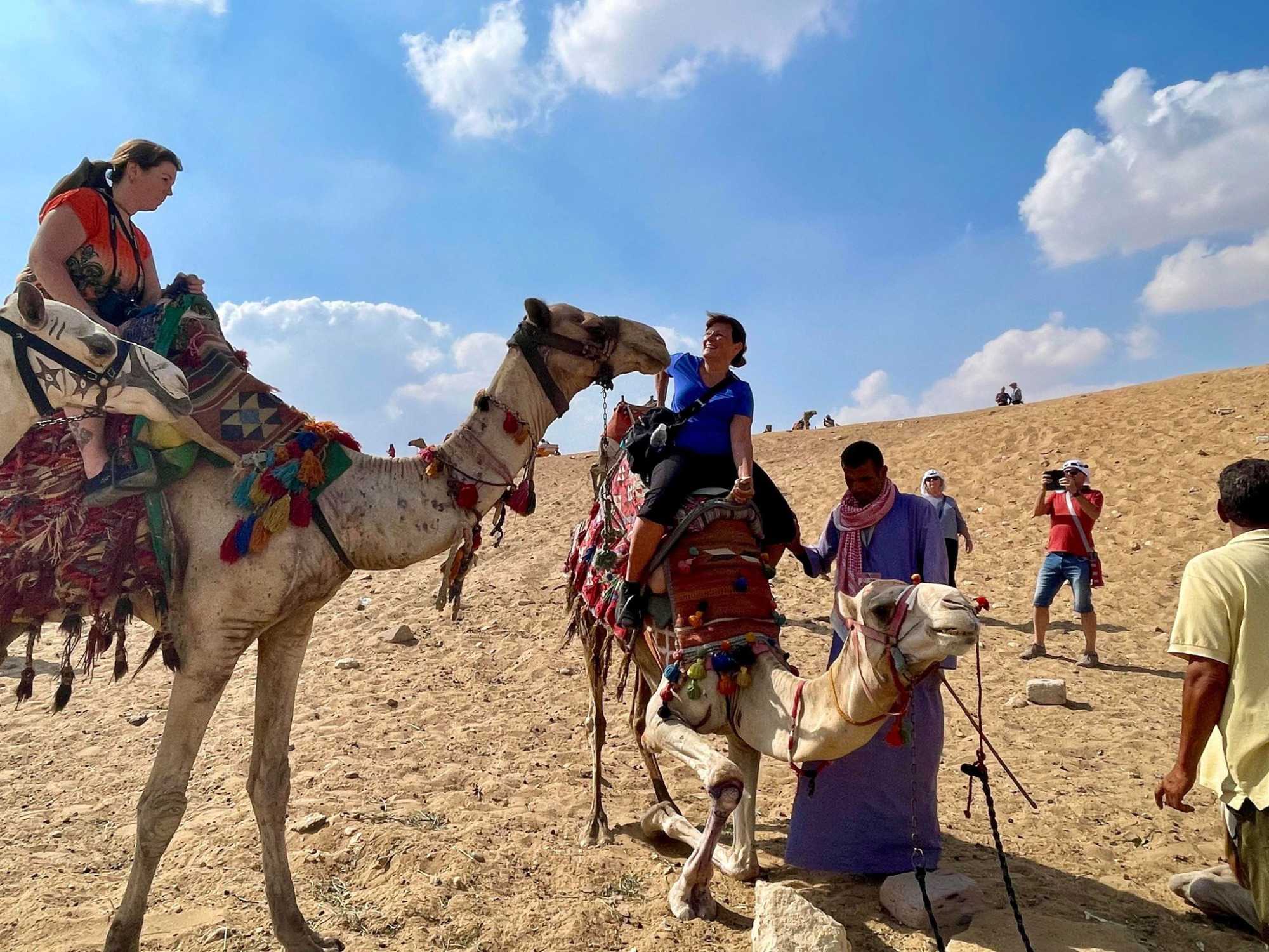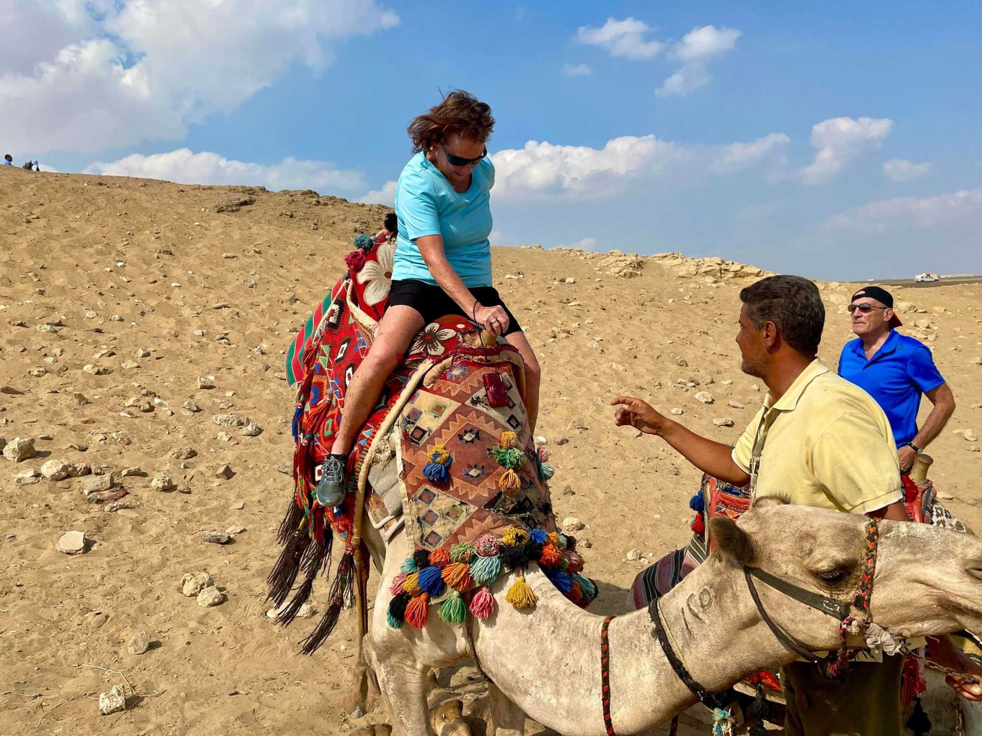 Suite à cette expérience était venu le temps de la balade à dos de dromadaires. Nous avions 13 personnes qui ont fait cette balade avec en arrière-plan le spectacle des pyramides. C’était magnifique. Tous ont survécus à cette balade qui laissera quelques traces de courbatures pour ceux qui sont un peu moins en forme. Mais ce fût vraiment apprécié de tous ceux qui avaient accepté de faire cette promenade d’une durée d’environ 1 heure. Notre cher André a eu des sueurs en tentant de rester en selle. Le dromadaire d’André avait un petit manque pour bien se tenir et jusqu’à l’offre de Geneviève de changer de dromadaire, André tanguait toujours vers la droite et avait peine à rester en selle. On en rit encore aujourd’hui, mais il a tout de même aimé son expérience. Vous verrez plein de belles photos de nos voyageurs s’amusant à dos de dromadaires.