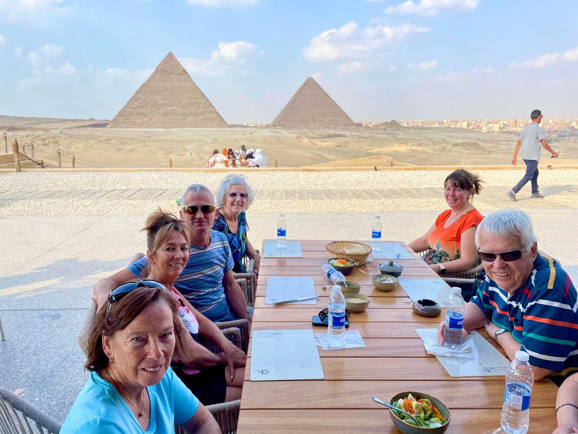 Nous avons retrouvé nos voyageurs qui ne participaient pas à cette promenade dans un excellent restaurant avec la vue sur les pyramides. Quel magnifique endroit pour continuer à s’imprégner de ce site exceptionnel. Le repas était délicieux et trop copieux pour plusieurs, mais c’est souvent comme ça lorsque l’on voyage. Vous remarquerez le riz en forme de pyramide dans nos assiettes.