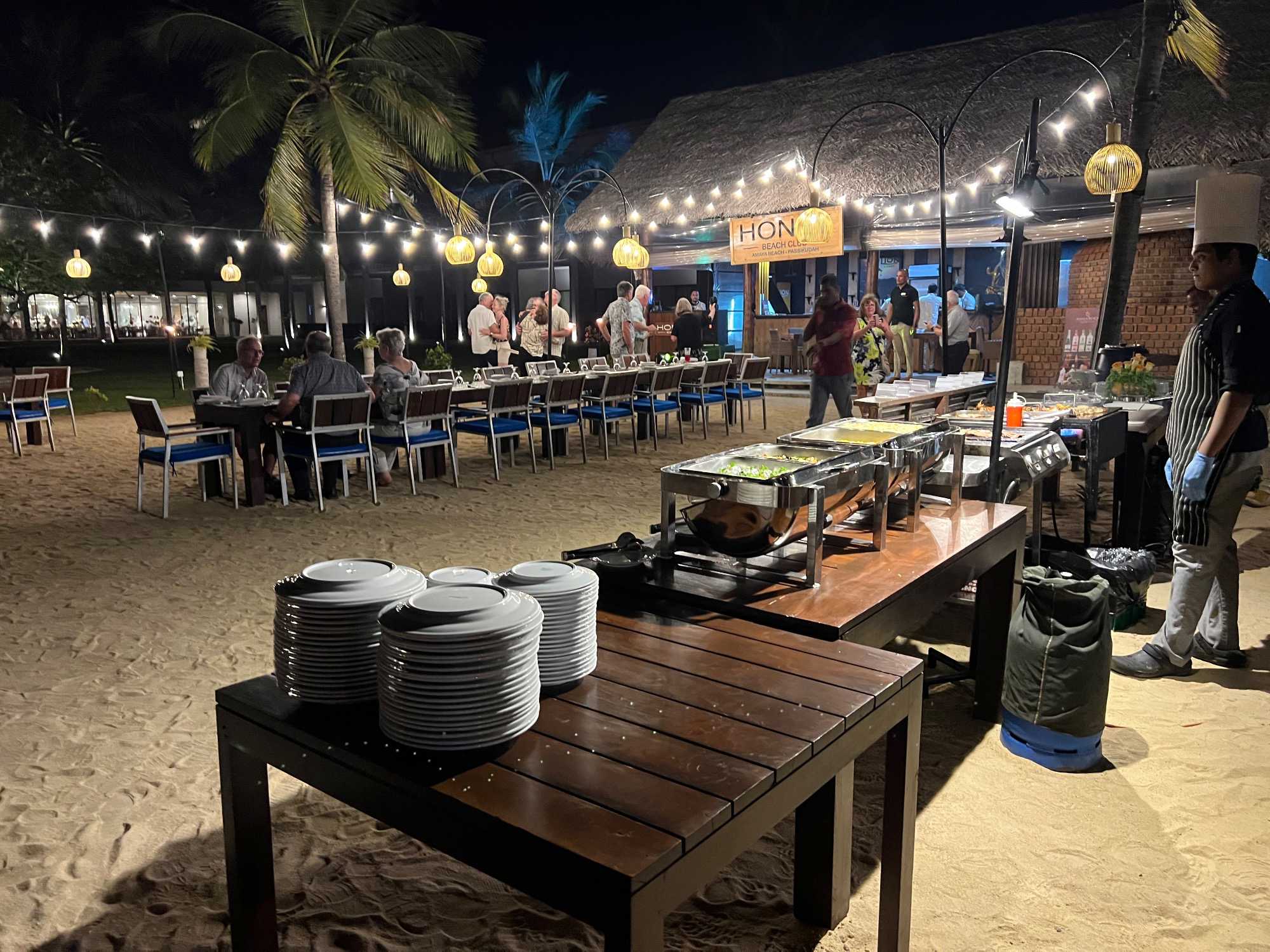 Puis, une belle surprise attend nos voyageurs… Ce soir nous les invitons à un souper BBQ de fruits de mer, poissons et viandes directement sur la plage. Des flambeaux sont allumés et dès notre arrivée, le plaisir commence! (Ou plutôt continu!!!) Manger en plein air, avec une température super confortable, c’est vraiment génial. Le souper est délicieux. Et le summum dans toute cette soirée magique: nous avons un DJ juste pour nous qui nous met des chansons québécoises!!! Nous n’aurions jamais pensé chanter et danser sur La dame en bleu de Michel Louvain ou Hélène de Rock Voisine, ou encore Mille après Mille de Willie Lamothe, au Sri Lanka! Tout cela crée une atmosphère magique et inoubliable, et nous savons que cette expérience restera gravée dans nos mémoires. Merci à Mme Drouin de nous planifier des moments si magiques! Je pense que les photos parlent d’elles-mêmes sur le plaisir que nous avons d’être ensemble.
