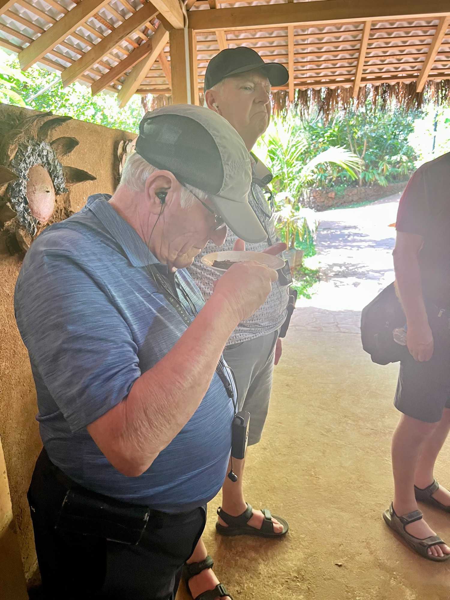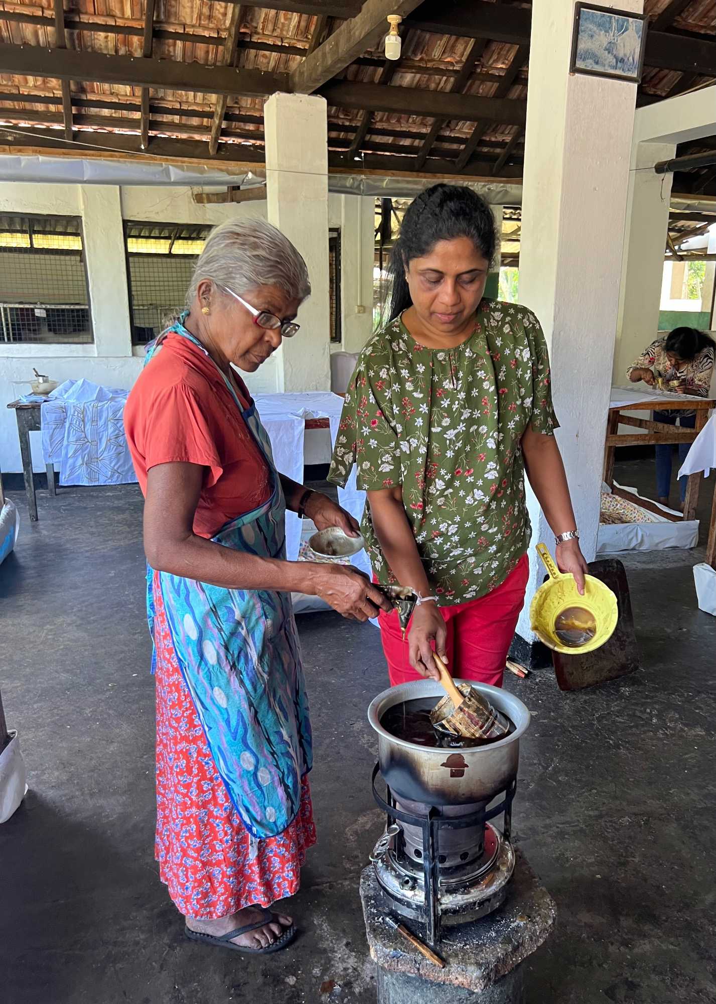 Ce matin, nous avons la chance de ne pas seulement entendre parler de ce plat, mais de le préparer aussi. Dès notre arrivée dans les jardins de culture, nous avons l'occasion de mettre la main à la pâte et de préparer notre propre curry. C’est l’occasion rêvée de découvrir les secrets de la cuisine sri-lankaise. Sous les conseils attentifs de notre expert local, nous avons Marie-Josée, Jeanne, Carole et Marie-France qui s’occupent de couper les légumes. Puis Rock est mis à contribution pour brasser le tout. Malheureusement, il n’a pas suivi la recette à la lettre (son sri lankais n’est pas parfait!!!) et il a mis tous les piments dans la recette. Je peux vous dire qu’il n’y a pas beaucoup de membres du groupe qui y a goûter! Nous avons tellement ri par contre! Sur deux de mes photos de groupe qui se suivent, il vous faut trouver l’erreur sur la 2è photo…